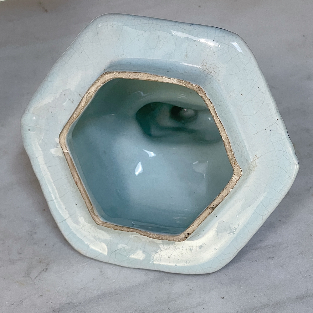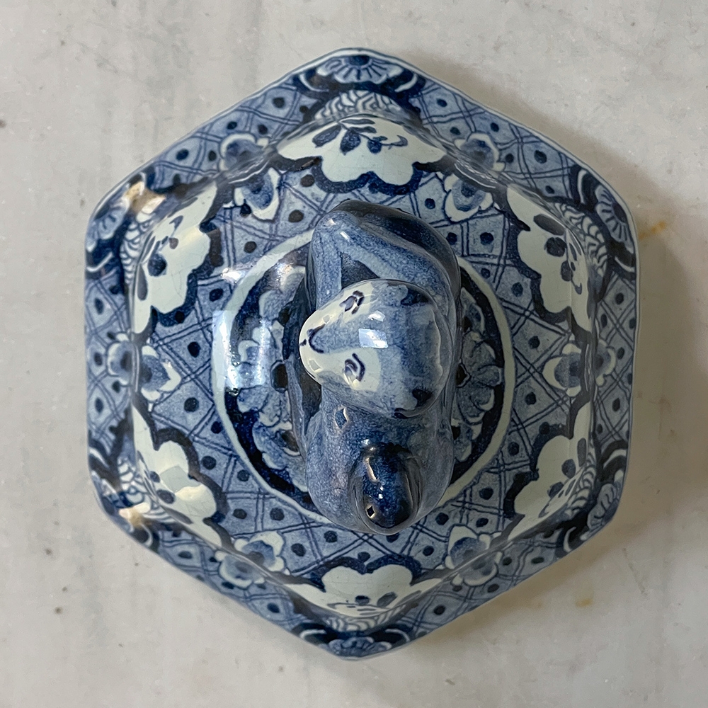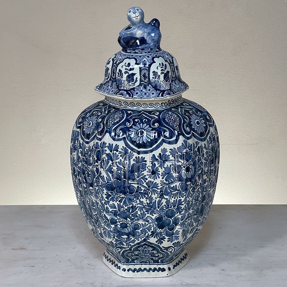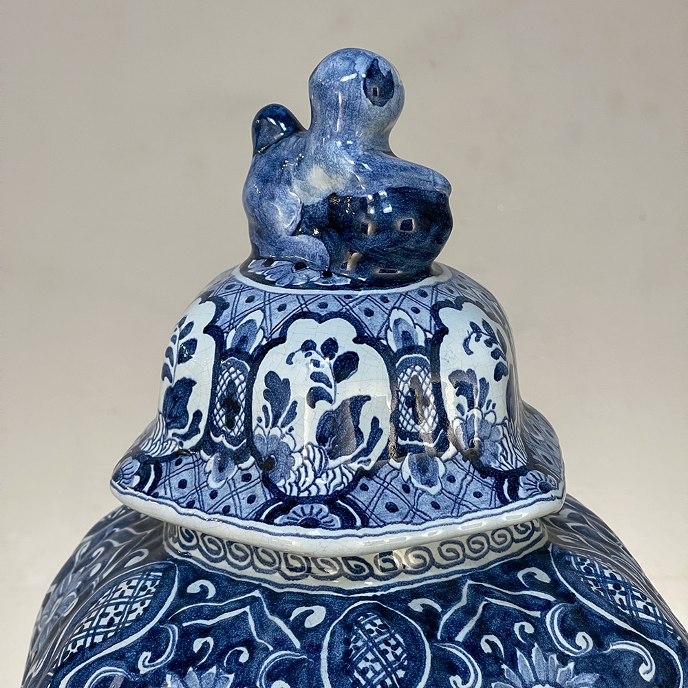 19th Century Delft Hand-Painted Blue & White Lidded Urn is a fine example of the intricately adorned porcelains from the Delft region in Holland produced during the 1800s. The classic shape was adopted by the Dutch in the 17th century, and features a domed lid similar in shape to architectural features popular during the day. Topped with a monkey clutching the peach of immortality, the design pays homage to its inspirations from the Orient. Cobalt blue was carefully hand-painted in an intricate design that includes floral & foliate motifs enhanced by elaborate borders, with painting appearing completely around the urns and covering the lid as well. We've discussed a brief history of the evolution of the art in The Netherlands many times on this site, so suffice to say this is an incredibly well-preserved example of the epitome of the craft!