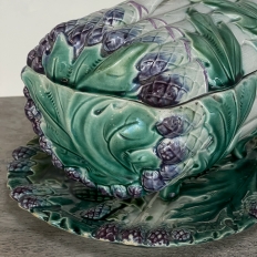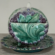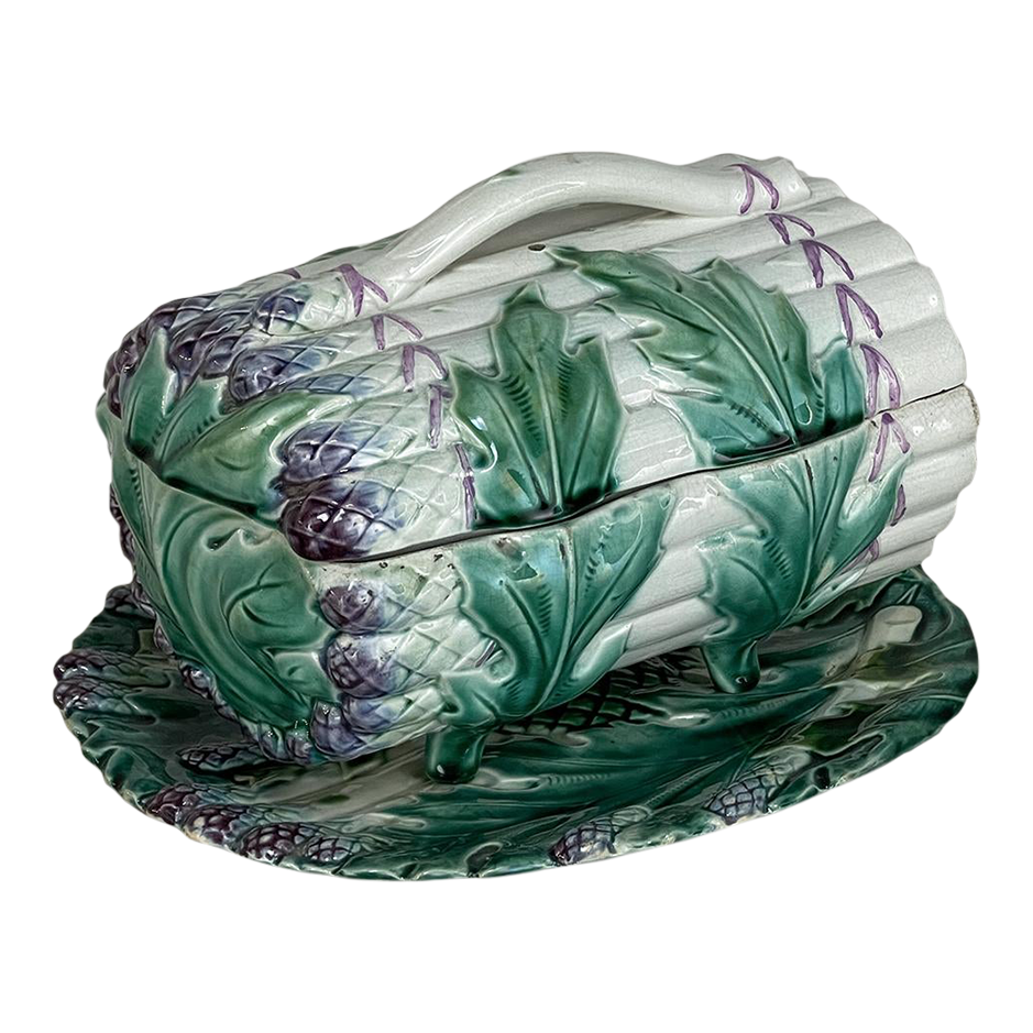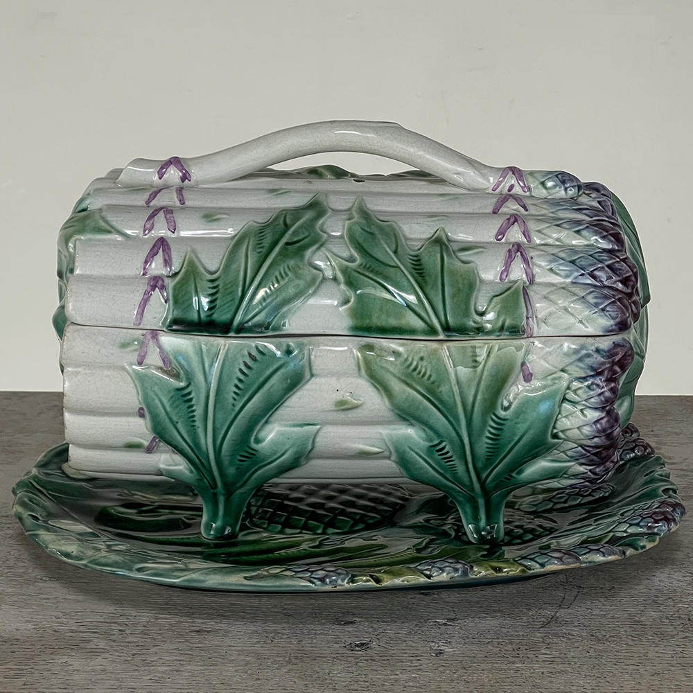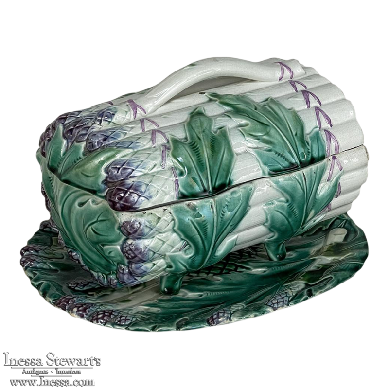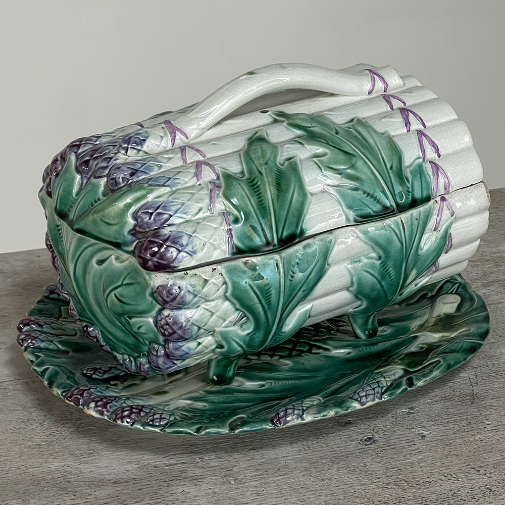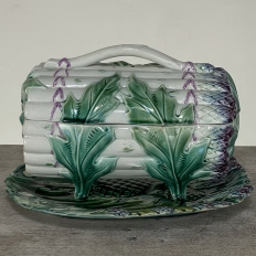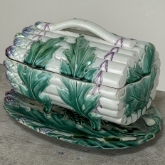 19th Century French Barbotine Covered Asparagus Server with Matching Platter by Keller & Guerin is another rare find, to be sure! Surviving together for over a century, each still displays rich coloration thanks to the proprietary painting and glazing methods by the well-known French ceramic masters at Keller & Guerin. Note the server bottom for the vegetables has holes to allow excess water to drain onto the platter by design, providing drip free serving. The lid helps keep the vegetables warm while on the table waiting to be served. Having the three piece design also makes cleanup a snap. The artfully cast porcelain combined with the combination of green with eggplant highlights depicts the primary vegetable for which the service was designed. Tres elegante!