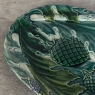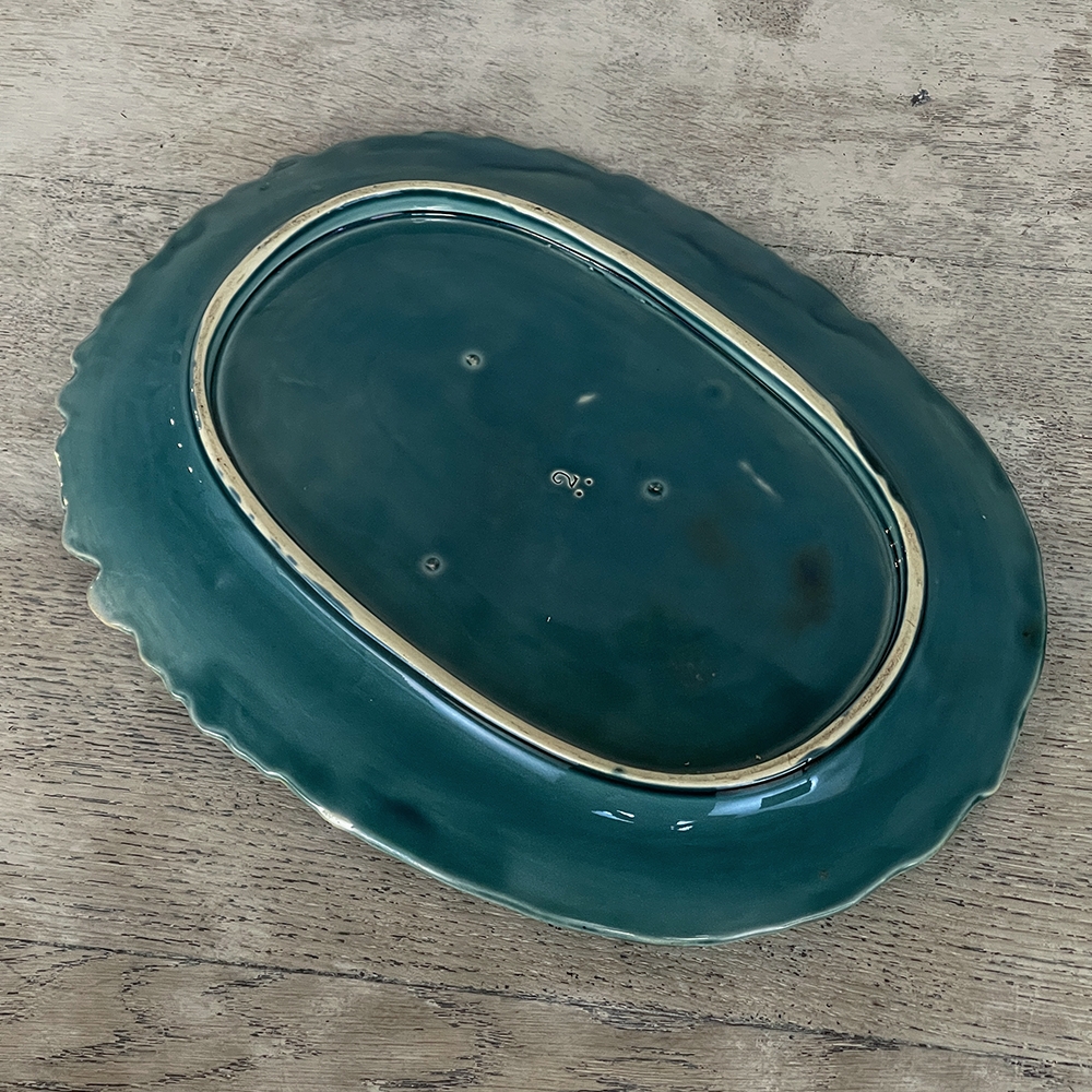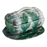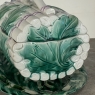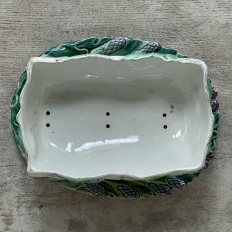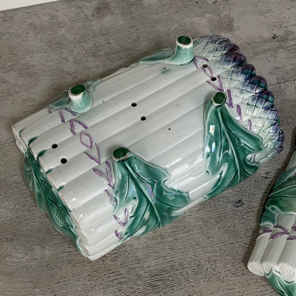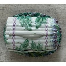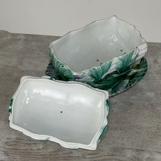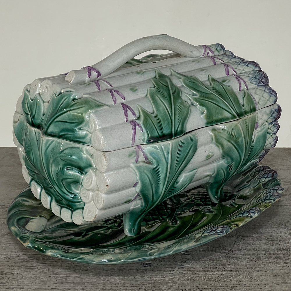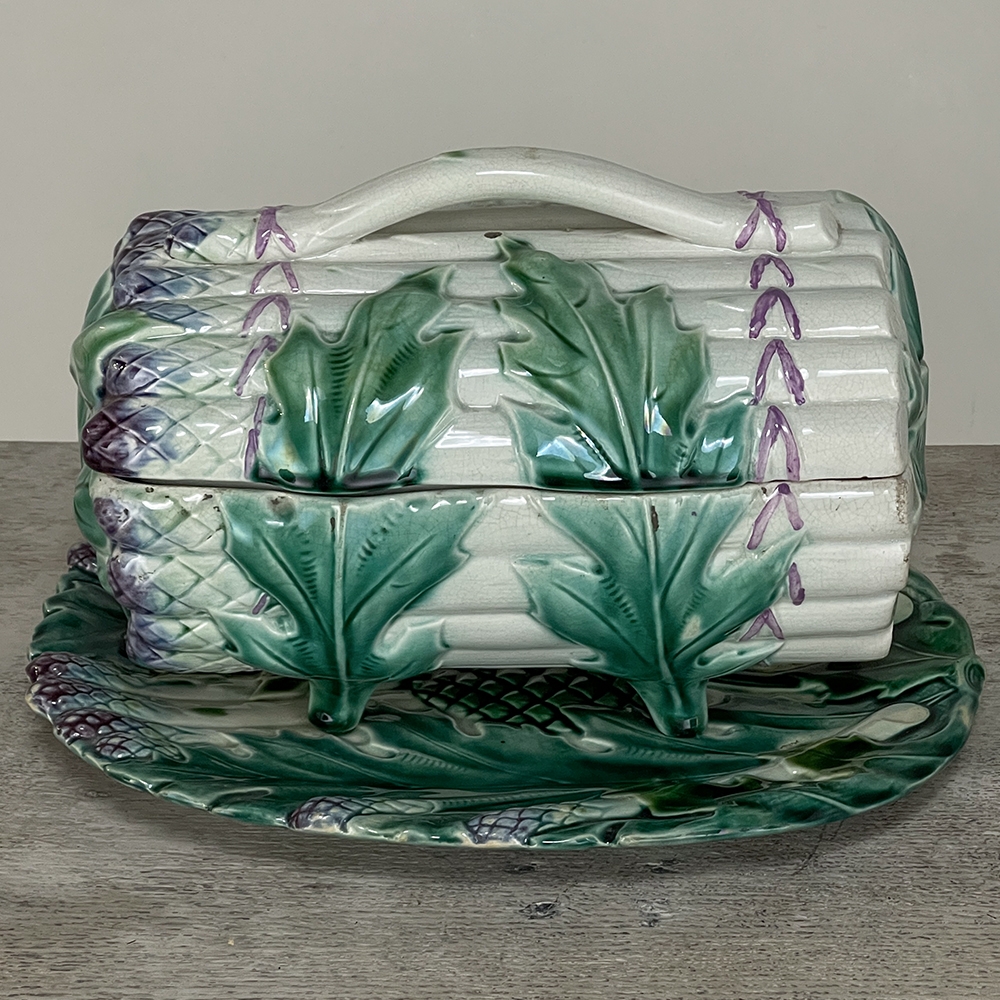 19th Century French Barbotine Covered Asparagus Server with Matching Platter by Keller & Guerin is another rare find, to be sure! Surviving together for over a century, each still displays rich coloration thanks to the proprietary painting and glazing methods by the well-known French ceramic masters at Keller & Guerin. Note the server bottom for the vegetables has holes to allow excess water to drain onto the platter by design, providing drip free serving. The lid helps keep the vegetables warm while on the table waiting to be served. Having the three piece design also makes cleanup a snap. The artfully cast porcelain combined with the combination of green with eggplant highlights depicts the primary vegetable for which the service was designed. Tres elegante!