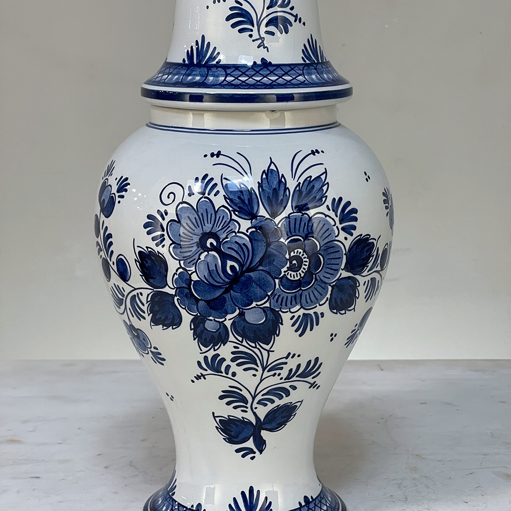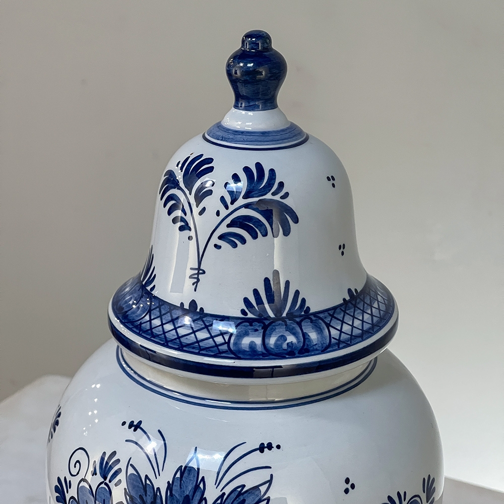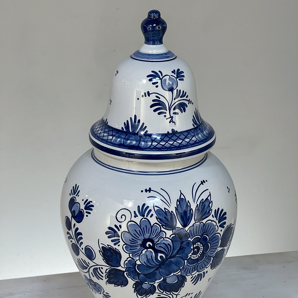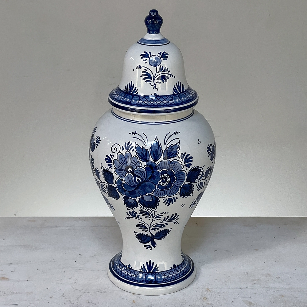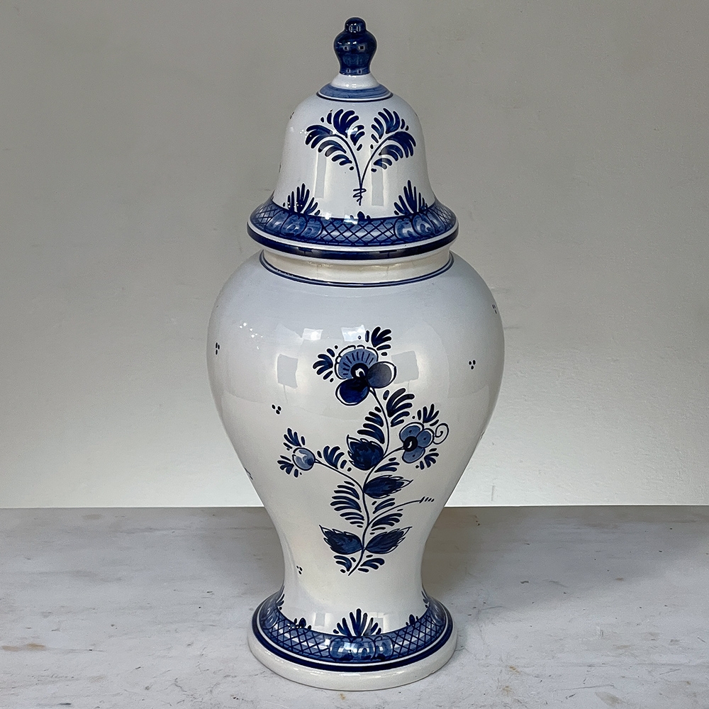 19th Century Hand-Painted Delft Blue & White Lidded Urn represents a departure from the Oriental styling and the introduction of a more European look that was part of the evolution of porcelains from the Delft region of Holland over the past three centuries. This example continues with the cobalt blue monochrome style on tin-glazed clay, but with a decidedly stylistic rendition of flowers and foliage, with only a subtle use of bordering and a blue domed finial as the top of the lid. Individually and painstakingly hand-painted, this work was actually signed by the artist, M. Schmeink and produced under the auspices of the original guild formed for the trade in Delft. Historically significant, beautiful to behold, very well preserved and wonderfully collectible!