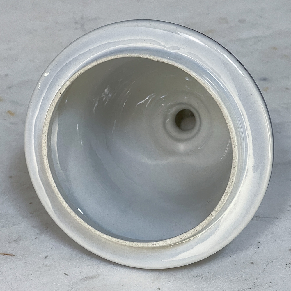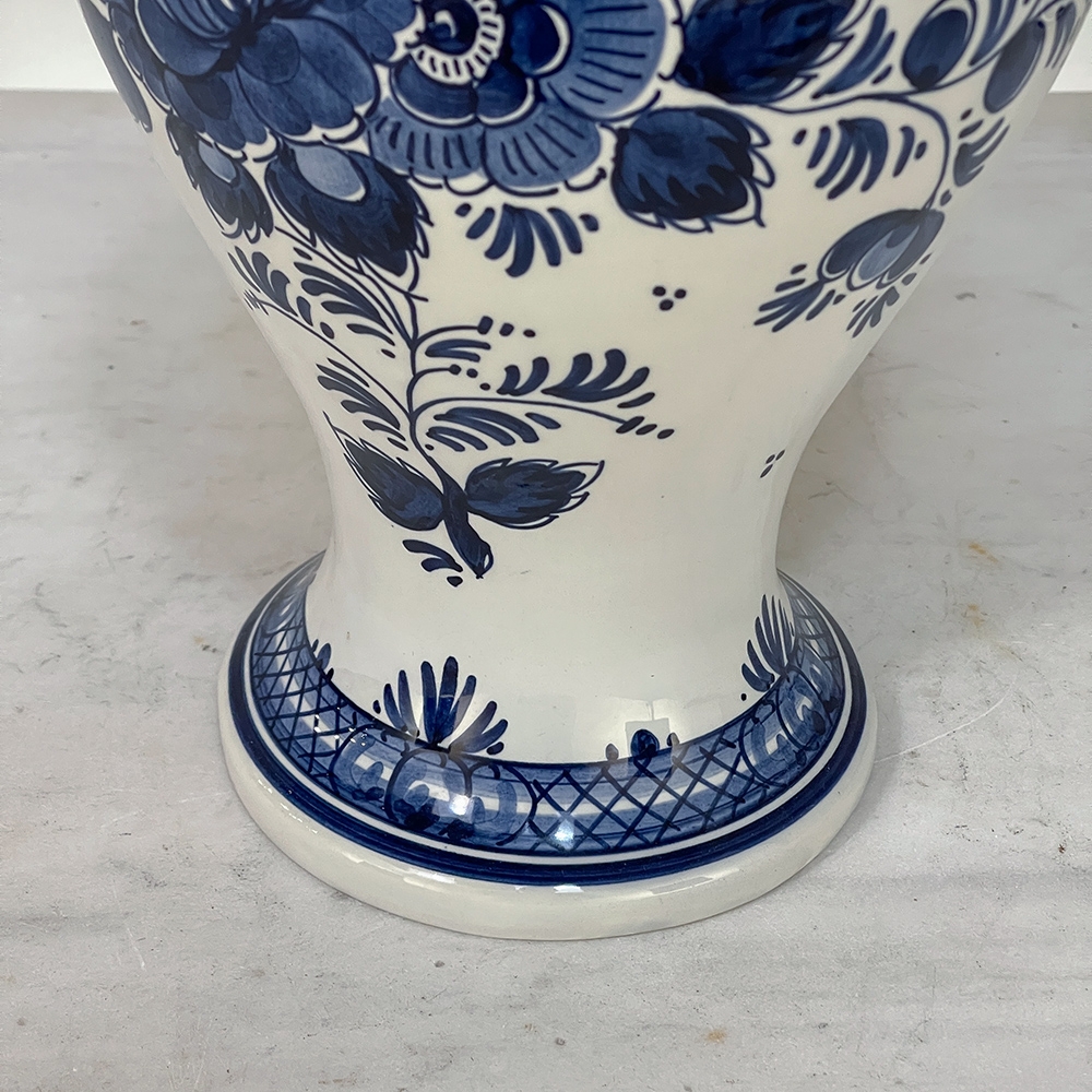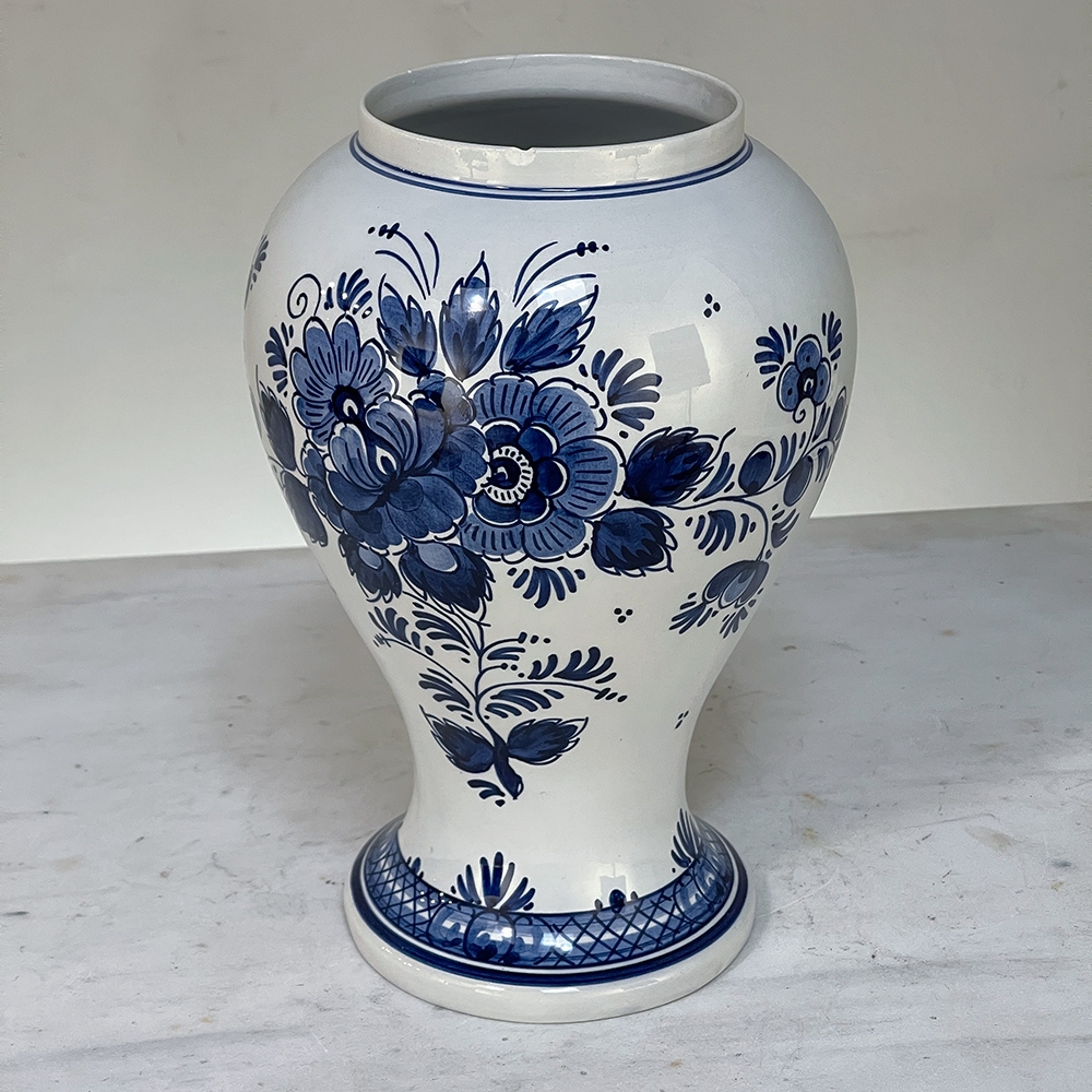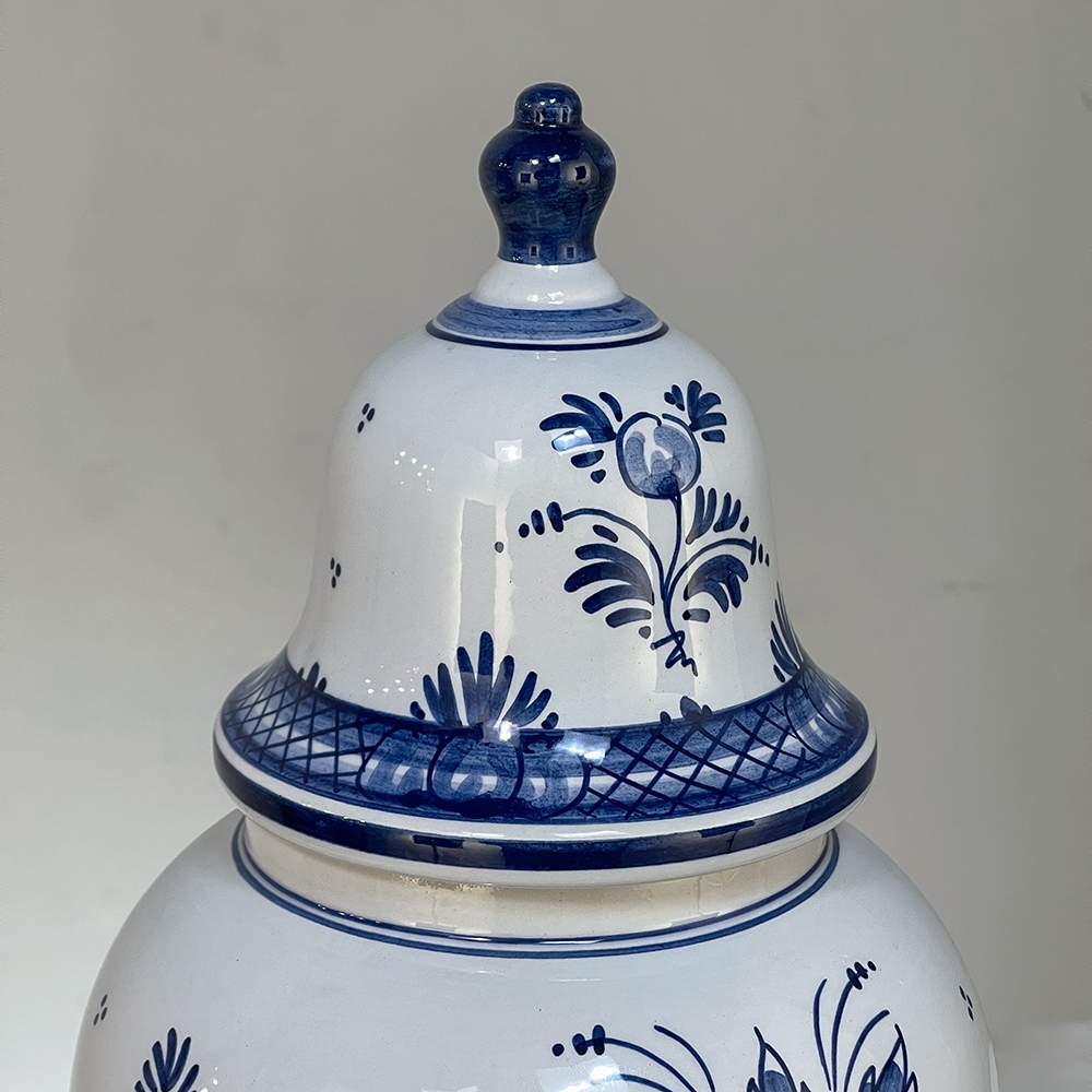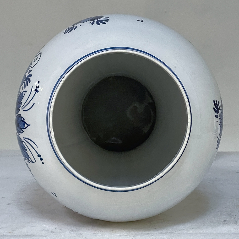 19th Century Hand-Painted Delft Blue & White Lidded Urn represents a departure from the Oriental styling and the introduction of a more European look that was part of the evolution of porcelains from the Delft region of Holland over the past three centuries. This example continues with the cobalt blue monochrome style on tin-glazed clay, but with a decidedly stylistic rendition of flowers and foliage, with only a subtle use of bordering and a blue domed finial as the top of the lid. Individually and painstakingly hand-painted, this work was actually signed by the artist, M. Schmeink and produced under the auspices of the original guild formed for the trade in Delft. Historically significant, beautiful to behold, very well preserved and wonderfully collectible!