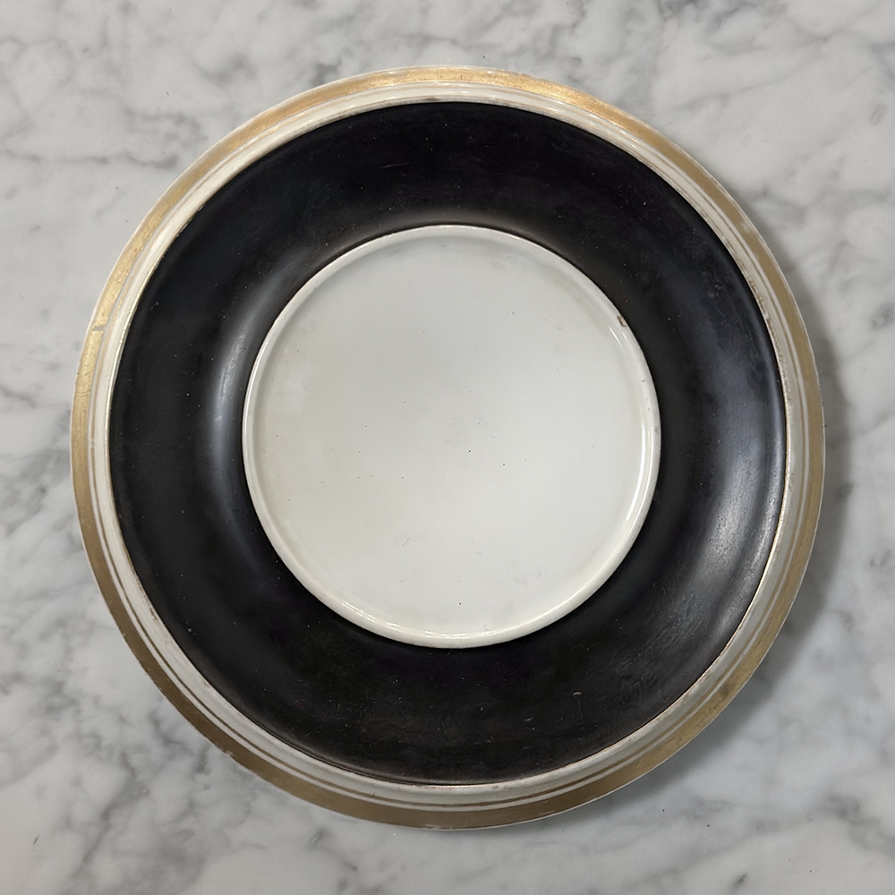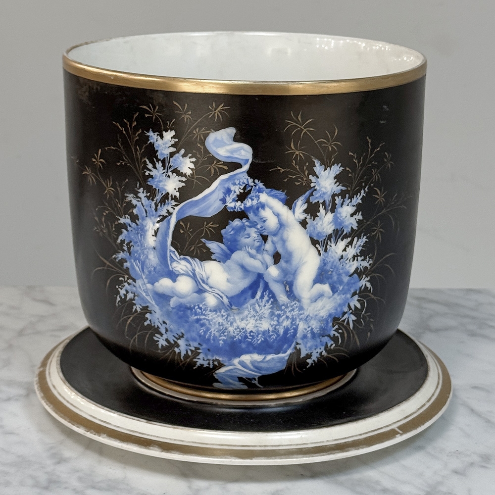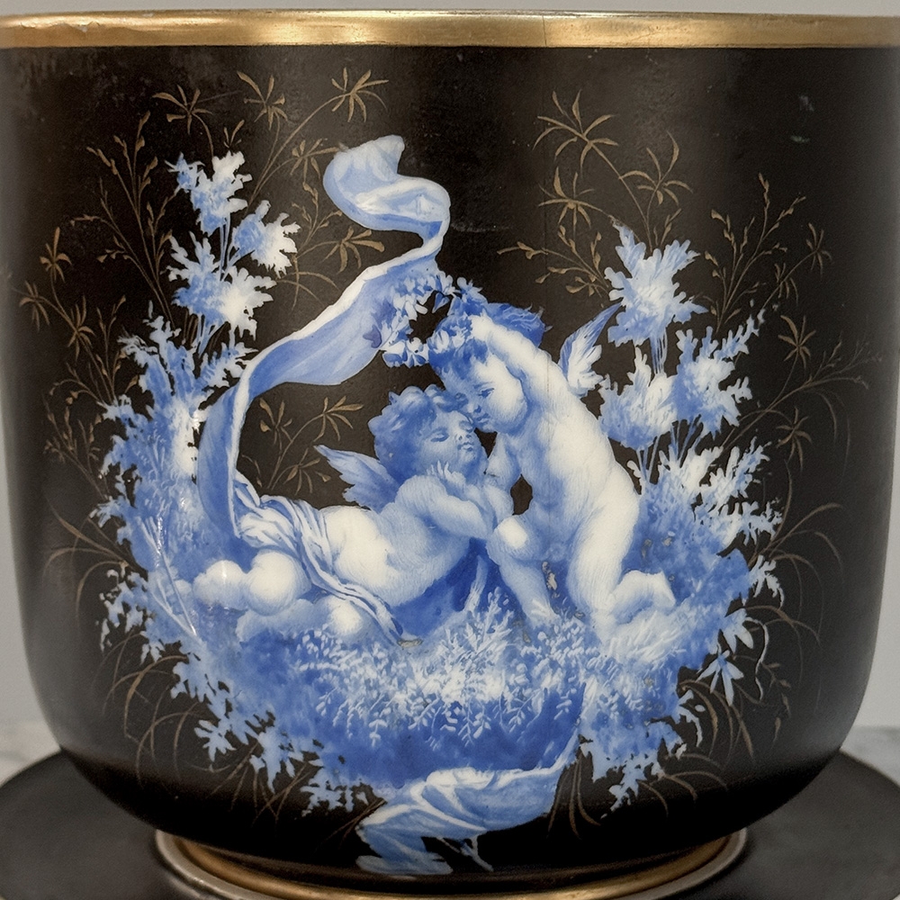 19th Century Hand-Painted Limoges Porcelain Cache Pot with Saucer is a beautifully decorated Limoges set, richly finished in black porcelain with luminous blue and white figural decoration and refined gilt accents. The contrast of the deep ground with the delicate romantic scene gives this piece the kind of presence that makes even a small accessory feel special. Elegant and evocative, it brings a touch of French porcelain artistry to a tabletop, mantel, vitrine, or layered garden room interior.