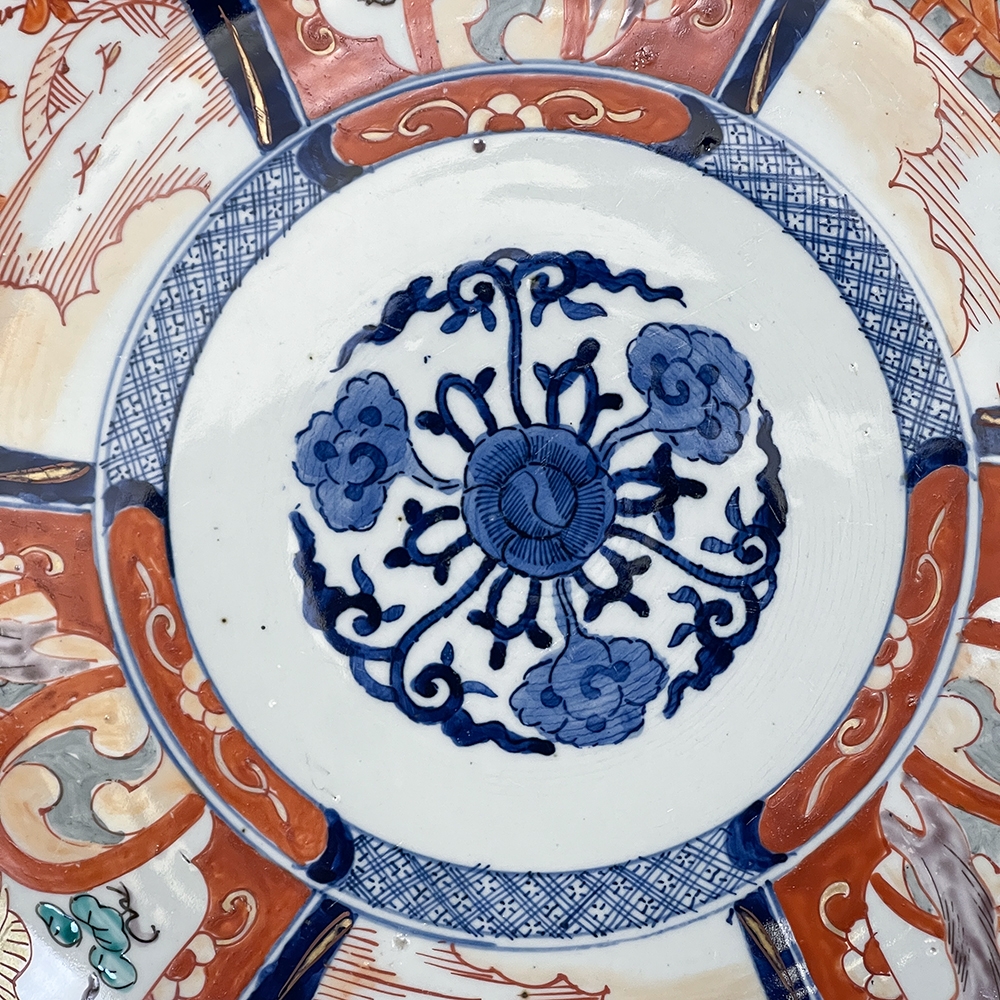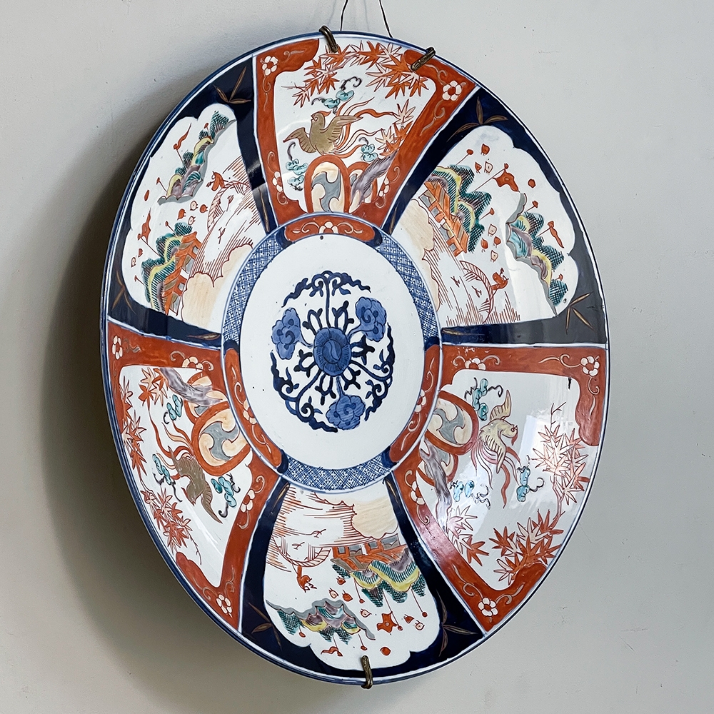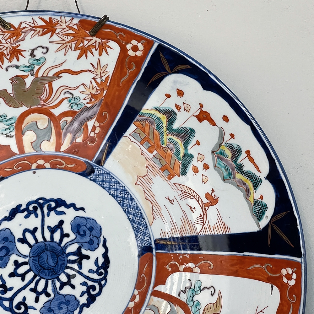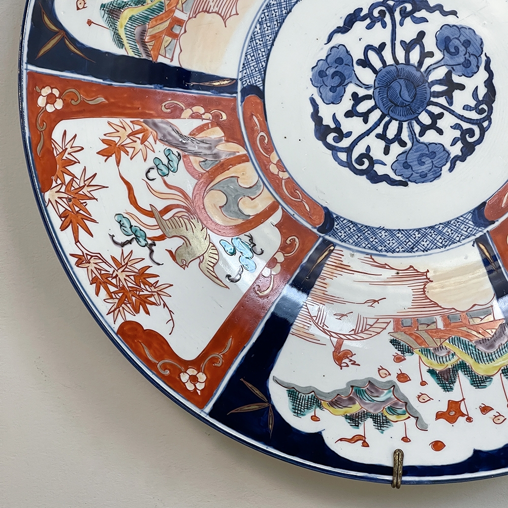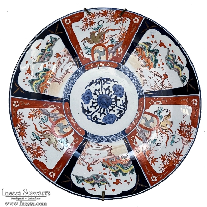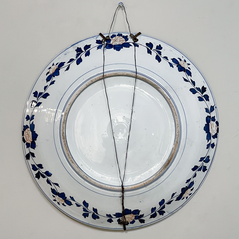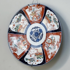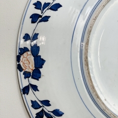 19th Century Imari Hand-Painted Charger is a fine example of decorative porcelains from Kyushu in northwestern Japan. Imari is a style of porcelain named after the Japanese port from which it was shipped to the West, beginning in the late 17th century. This example shows artistic excellence by using different hues of the same basic colors of cobalt blue and copper red, creating the illusion of more chromatic scale. Goldenrod and other earth tones add to the visual effect. Combining somewhat abstract forms and surreal scenes with easily identifiable representations of flowers and vases, such chargers are still used for serving, but in the case of the more valuable pieces, usually hung on the wall or displayed in cases for all to appreciate. Note even the back side has some interesting floral and foliates painted on it, primarily appreciated by those sitting at the table at the time of being served.