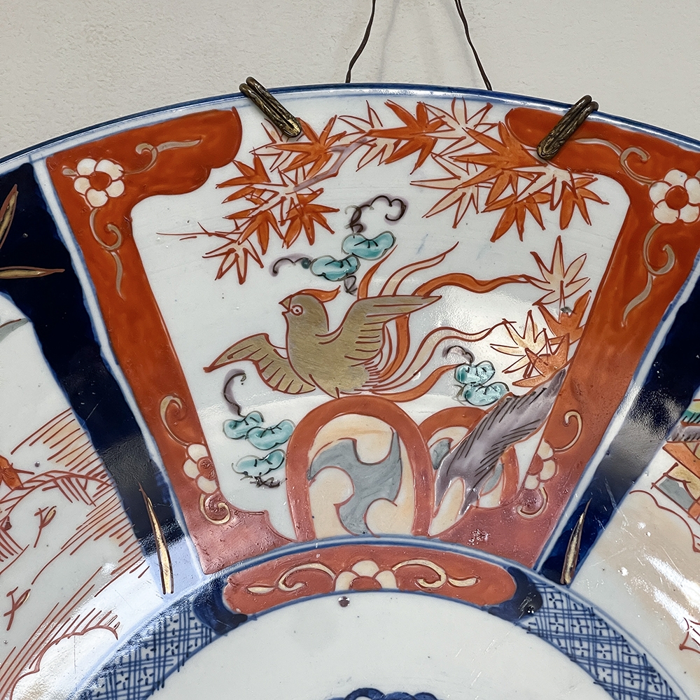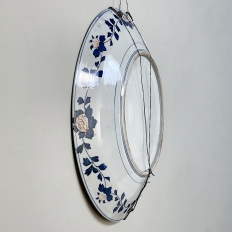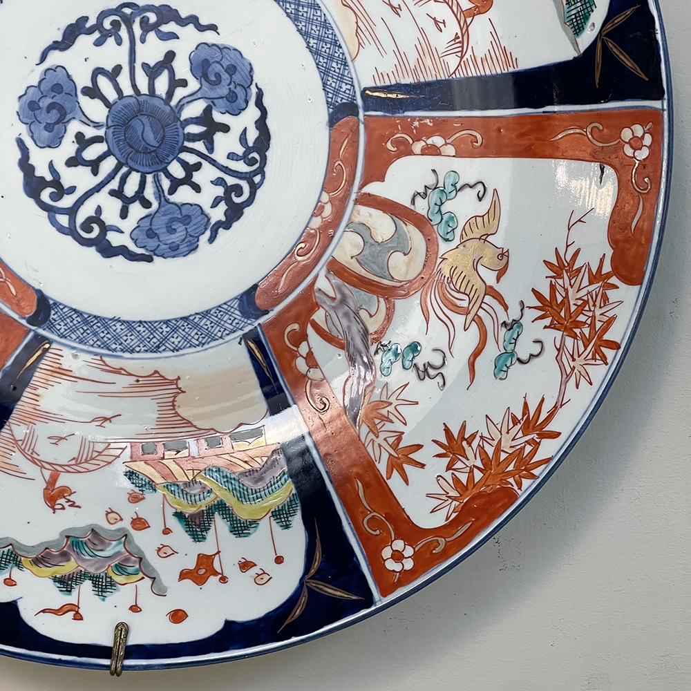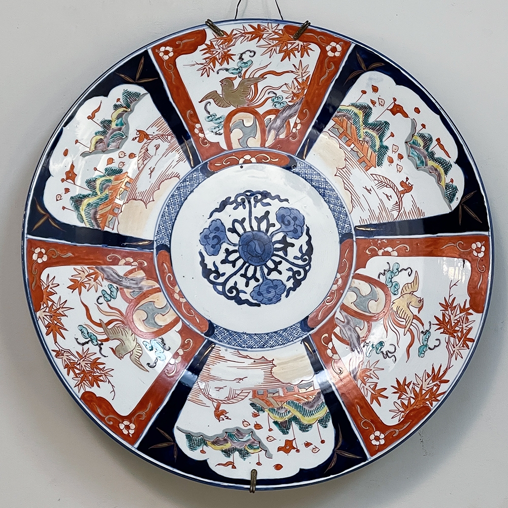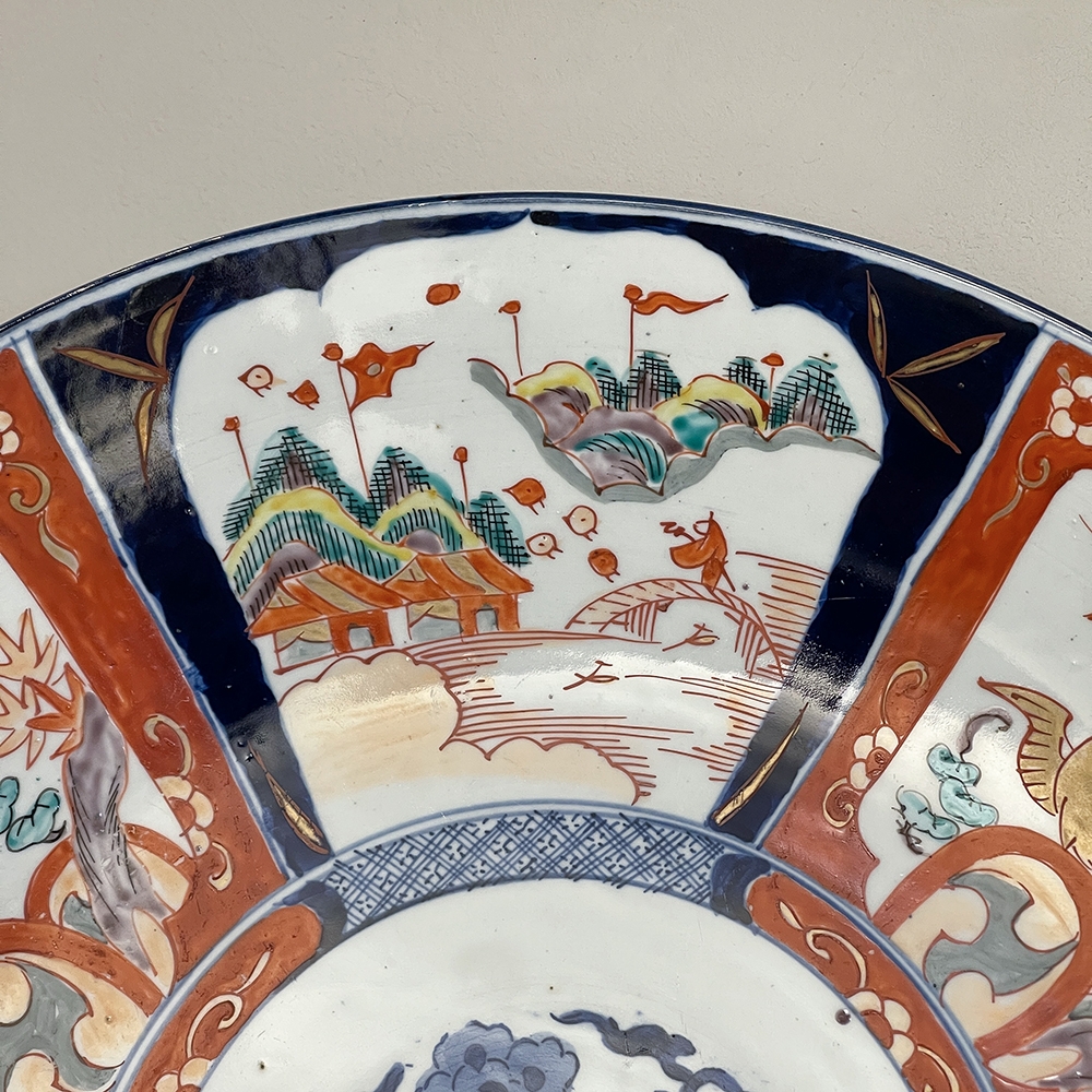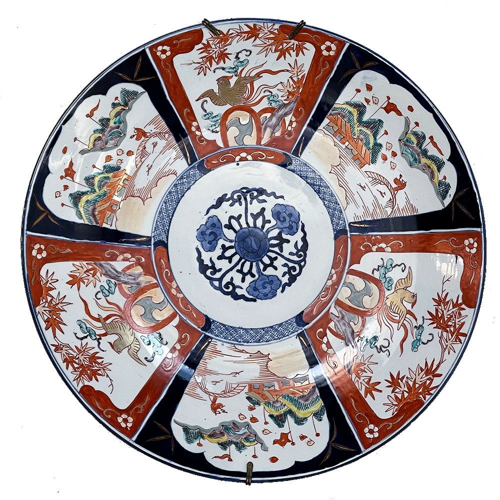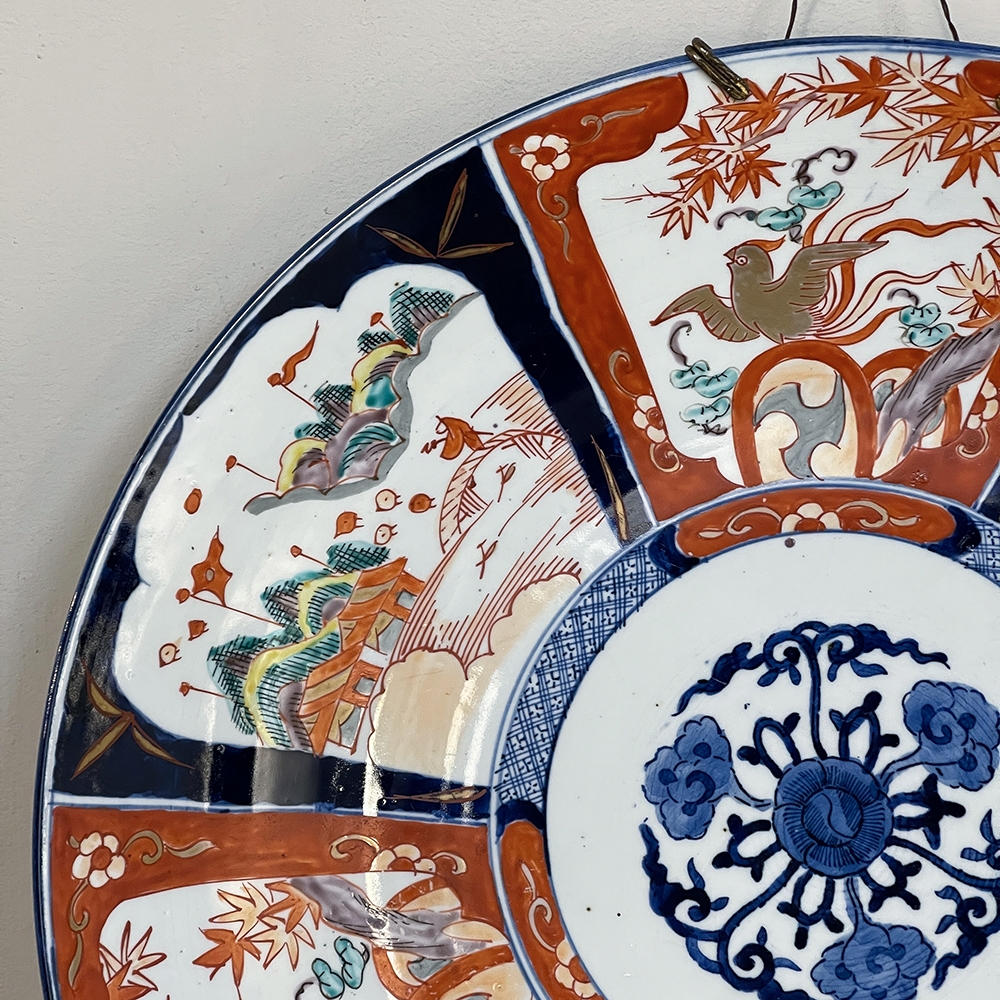19th Century Imari Hand-Painted Charger is a fine example of decorative porcelains from Kyushu in northwestern Japan. Imari is a style of porcelain named after the Japanese port from which it was shipped to the West, beginning in the late 17th century. This example shows artistic excellence by using different hues of the same basic colors of cobalt blue and copper red, creating the illusion of more chromatic scale. Goldenrod and other earth tones add to the visual effect. Combining somewhat abstract forms and surreal scenes with easily identifiable representations of flowers and vases, such chargers are still used for serving, but in the case of the more valuable pieces, usually hung on the wall or displayed in cases for all to appreciate. Note even the back side has some interesting floral and foliates painted on it, primarily appreciated by those sitting at the table at the time of being served.