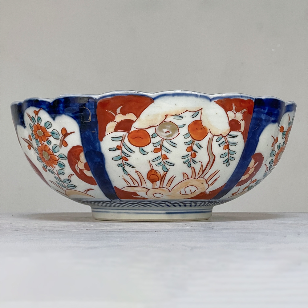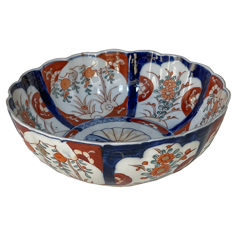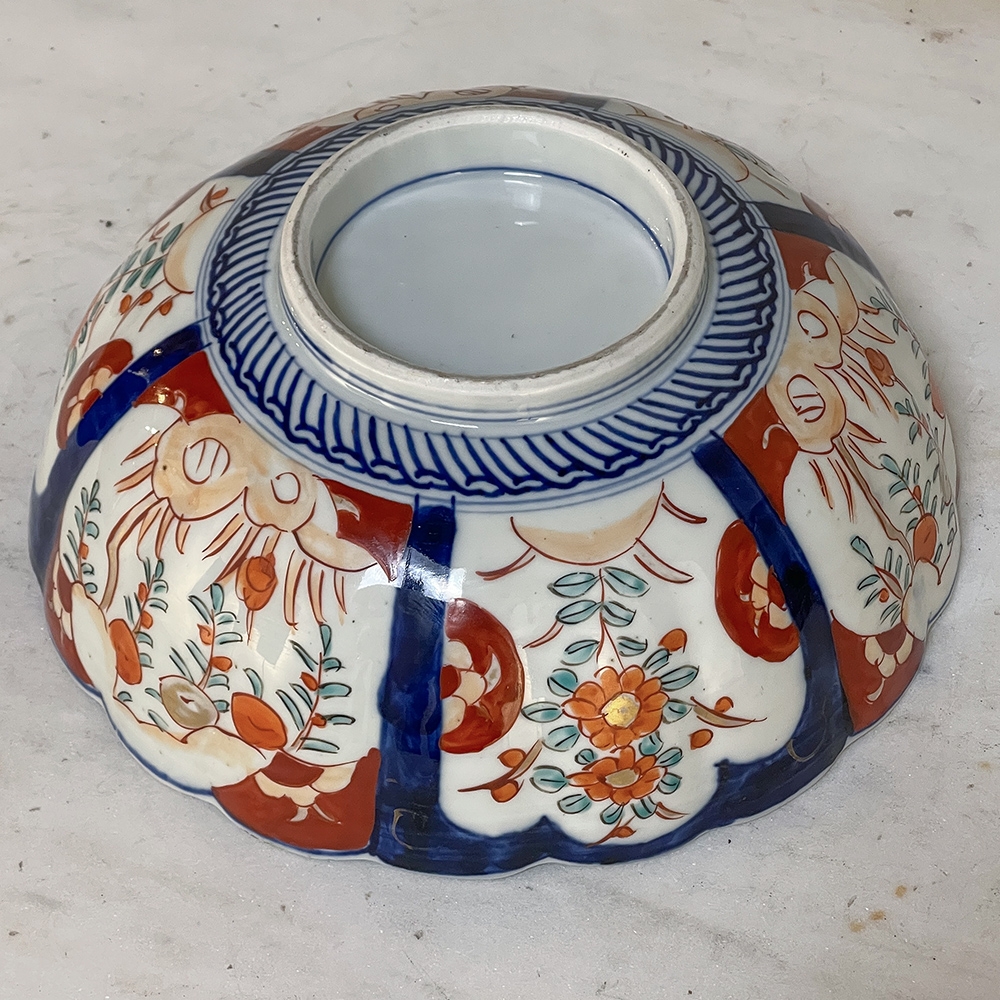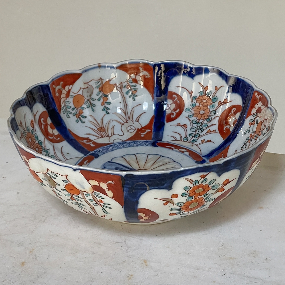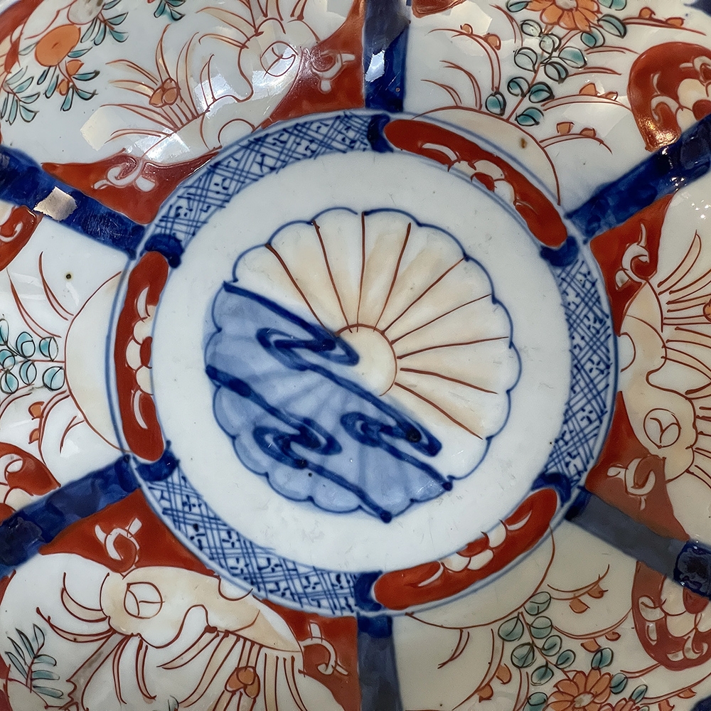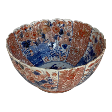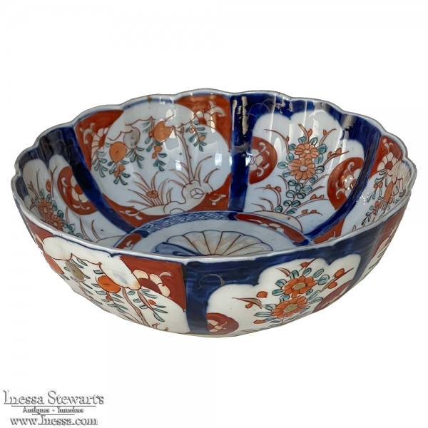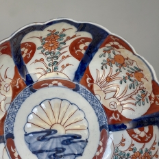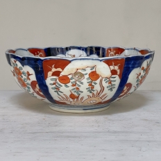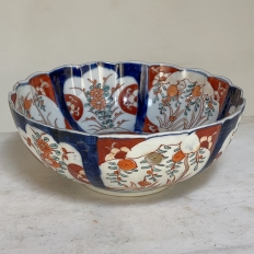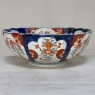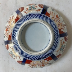 19th Century Imari Hand-Painted Serving Bowl is a fine example of decorative porcelains from Kyushu in northwestern Japan. Imari is a style of porcelain named after the Japanese port from which it was shipped to the West, beginning in the late 17th century. This example shows artistic excellence by using different hues of the same basic colors of cobalt blue and copper red, with subtle tan accents creating the illusion of more chromatic scale. Combining somewhat abstract forms with easily identifiable representations of flowers and foliates, such bowls can still be used for serving, but in the case of the more valuable pieces, usually hung on the wall or displayed in cases for all to appreciate. Note even the bottom has an interesting form painted on it, probably indicative of the maker.