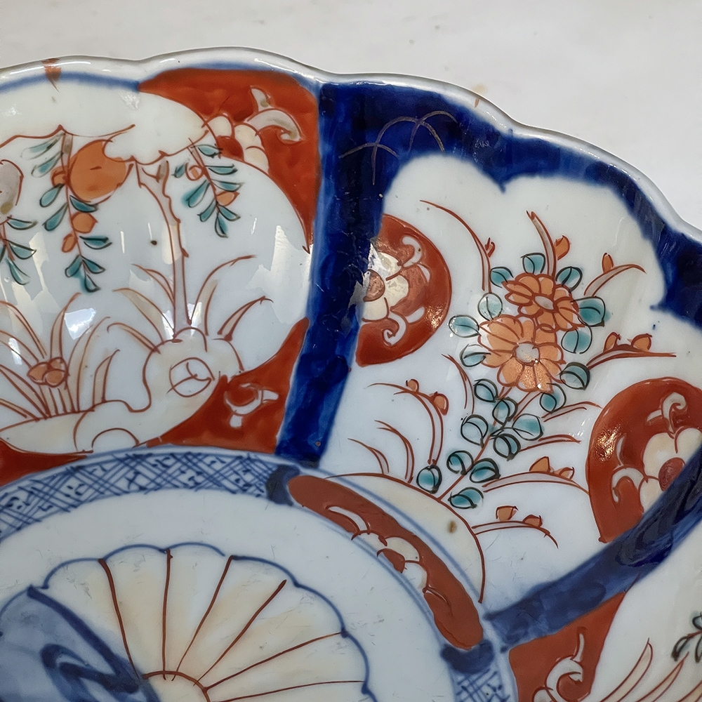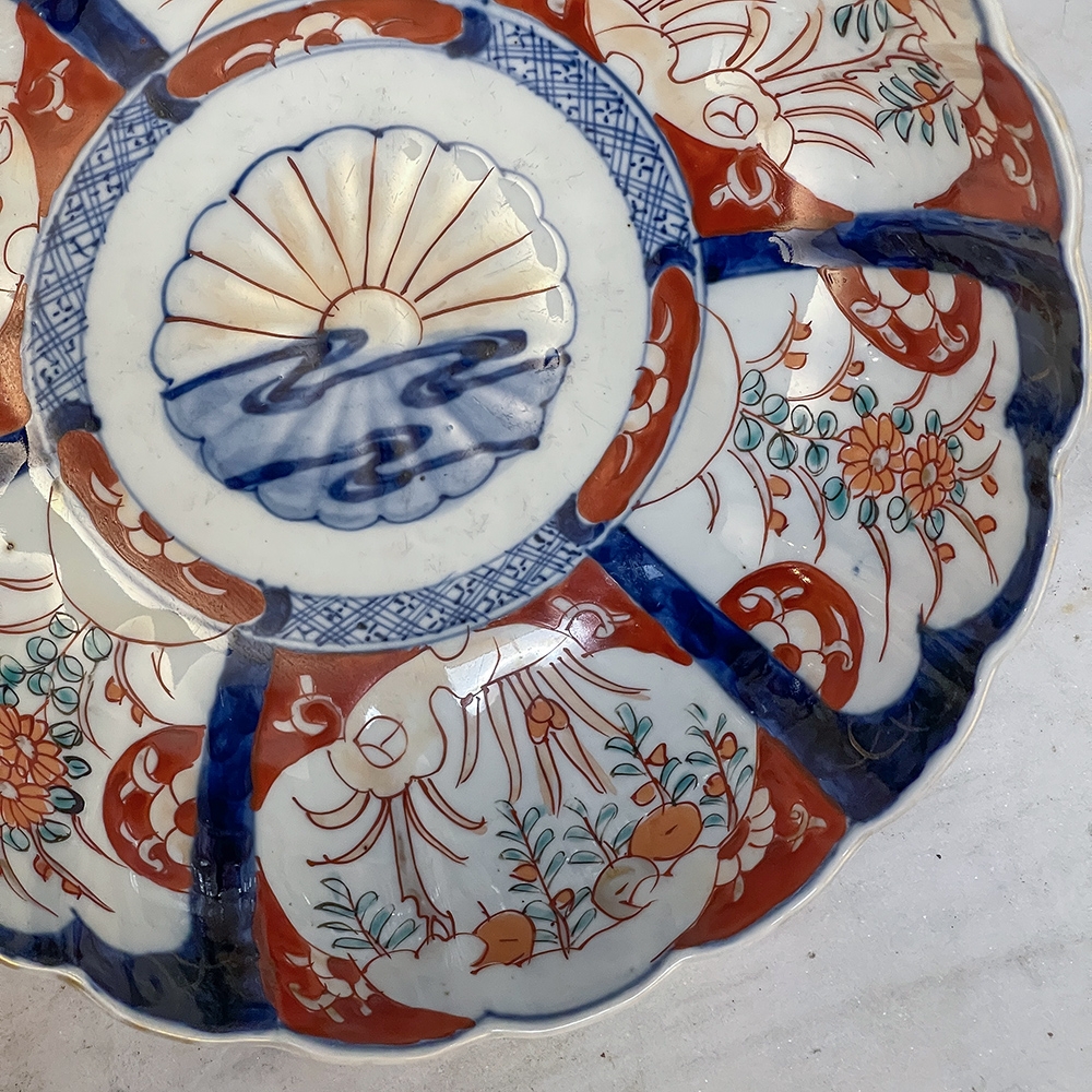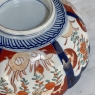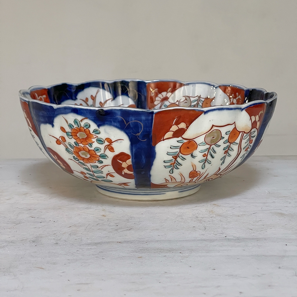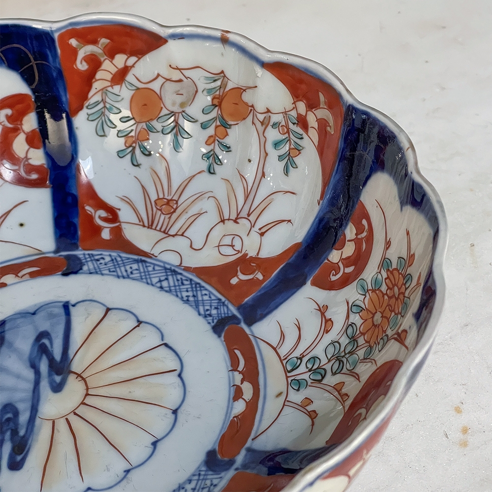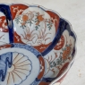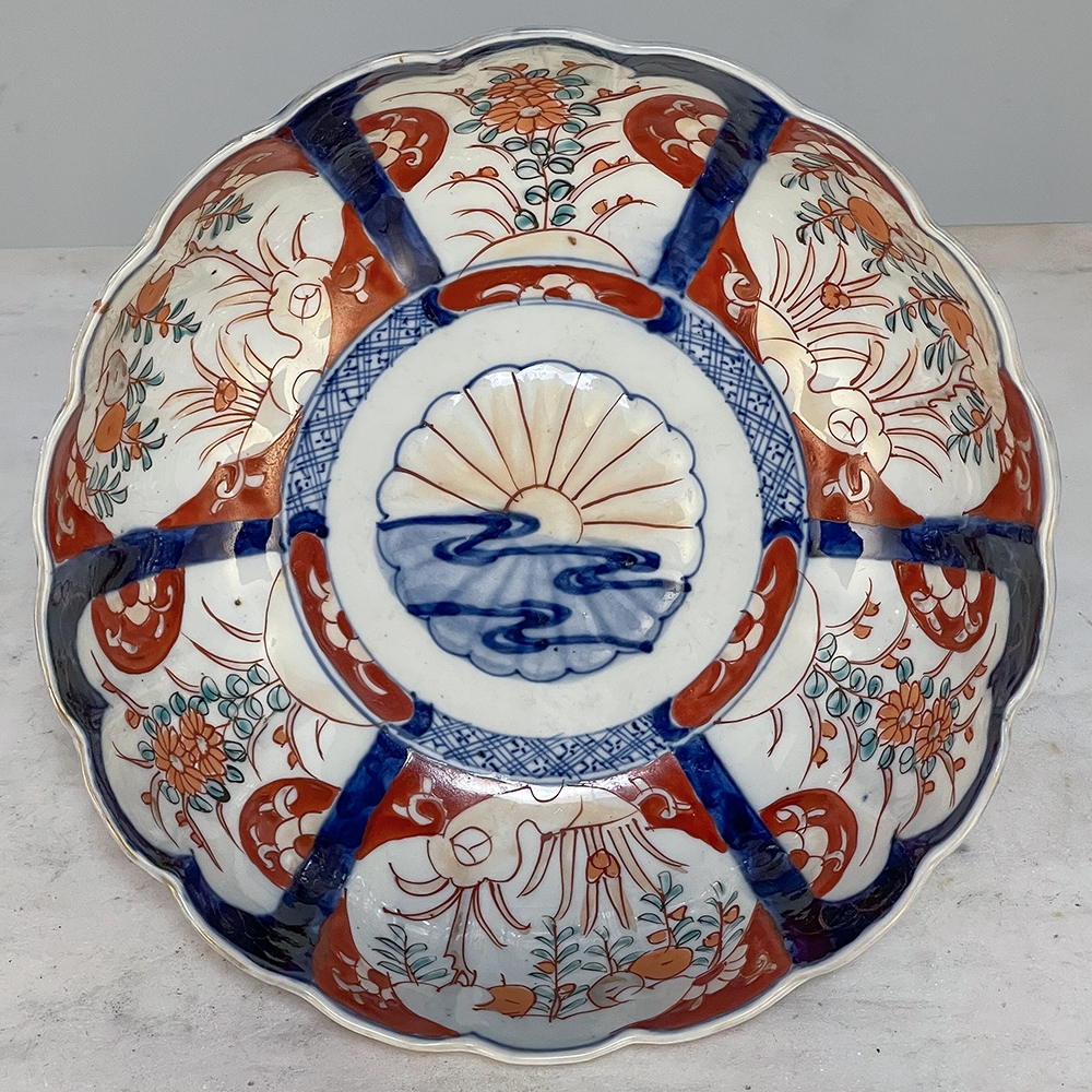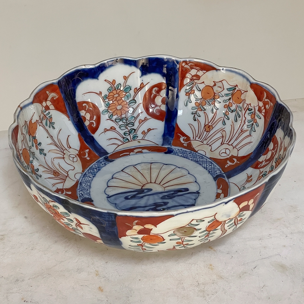 19th Century Imari Hand-Painted Serving Bowl is a fine example of decorative porcelains from Kyushu in northwestern Japan. Imari is a style of porcelain named after the Japanese port from which it was shipped to the West, beginning in the late 17th century. This example shows artistic excellence by using different hues of the same basic colors of cobalt blue and copper red, with subtle tan accents creating the illusion of more chromatic scale. Combining somewhat abstract forms with easily identifiable representations of flowers and foliates, such bowls can still be used for serving, but in the case of the more valuable pieces, usually hung on the wall or displayed in cases for all to appreciate. Note even the bottom has an interesting form painted on it, probably indicative of the maker.