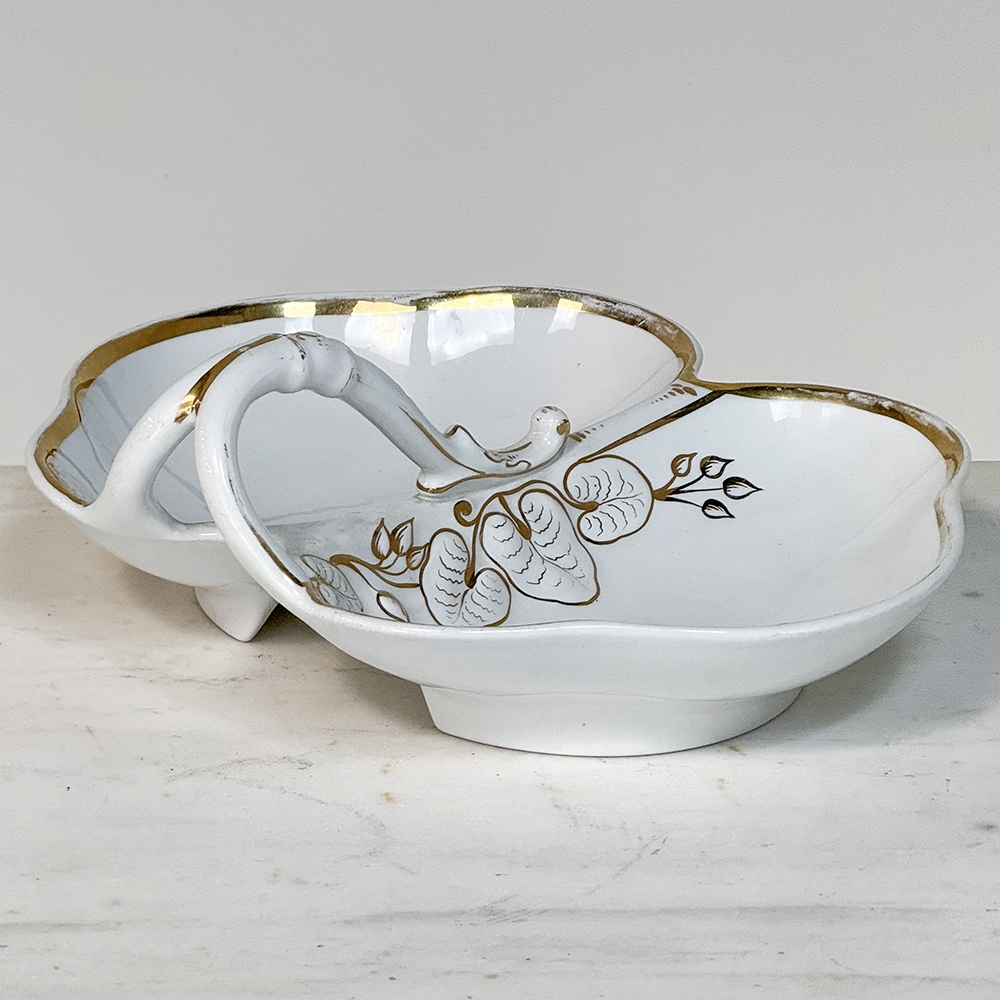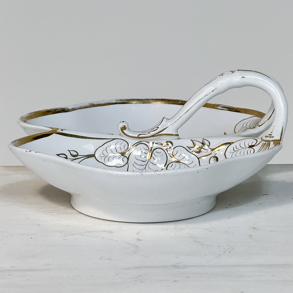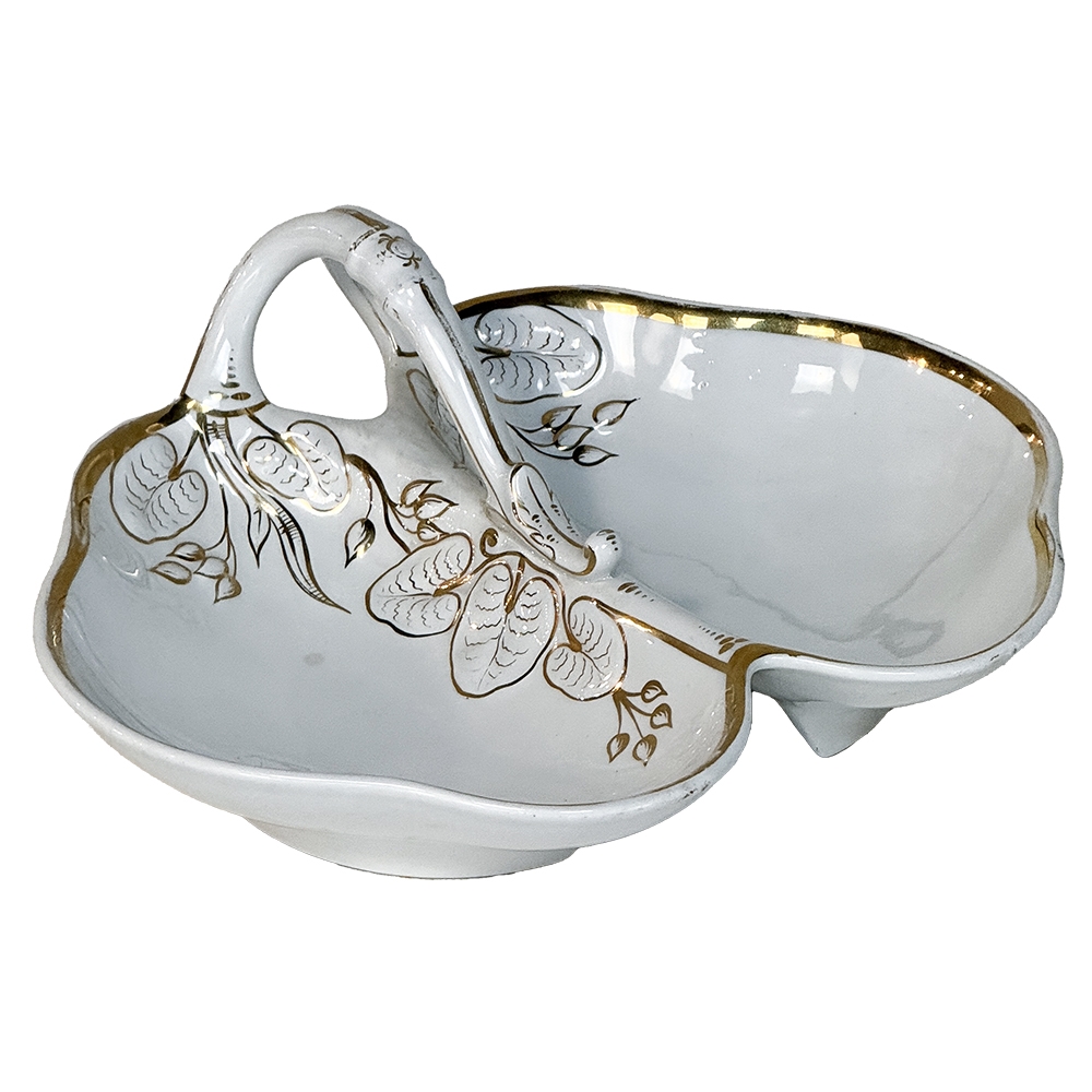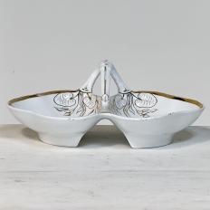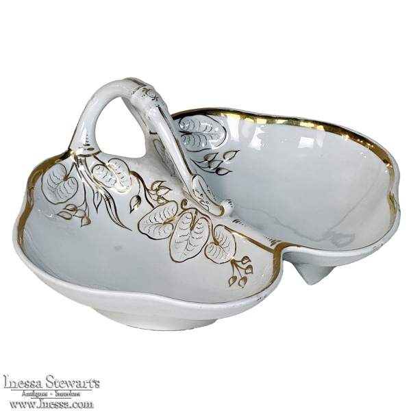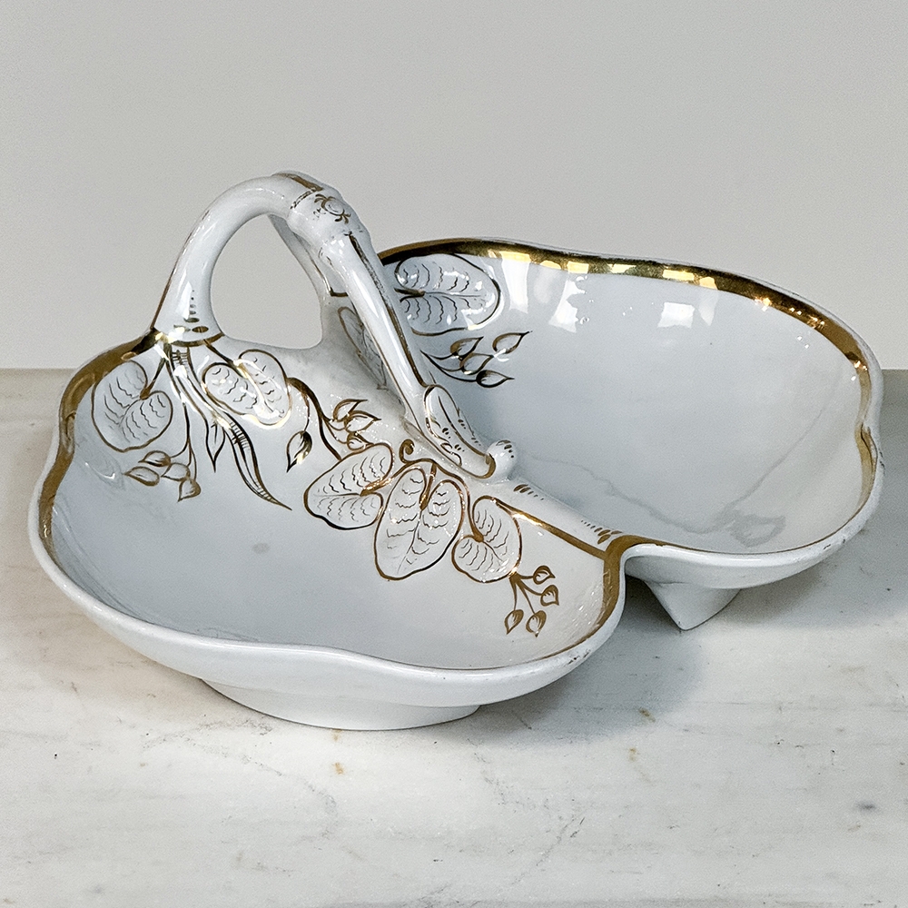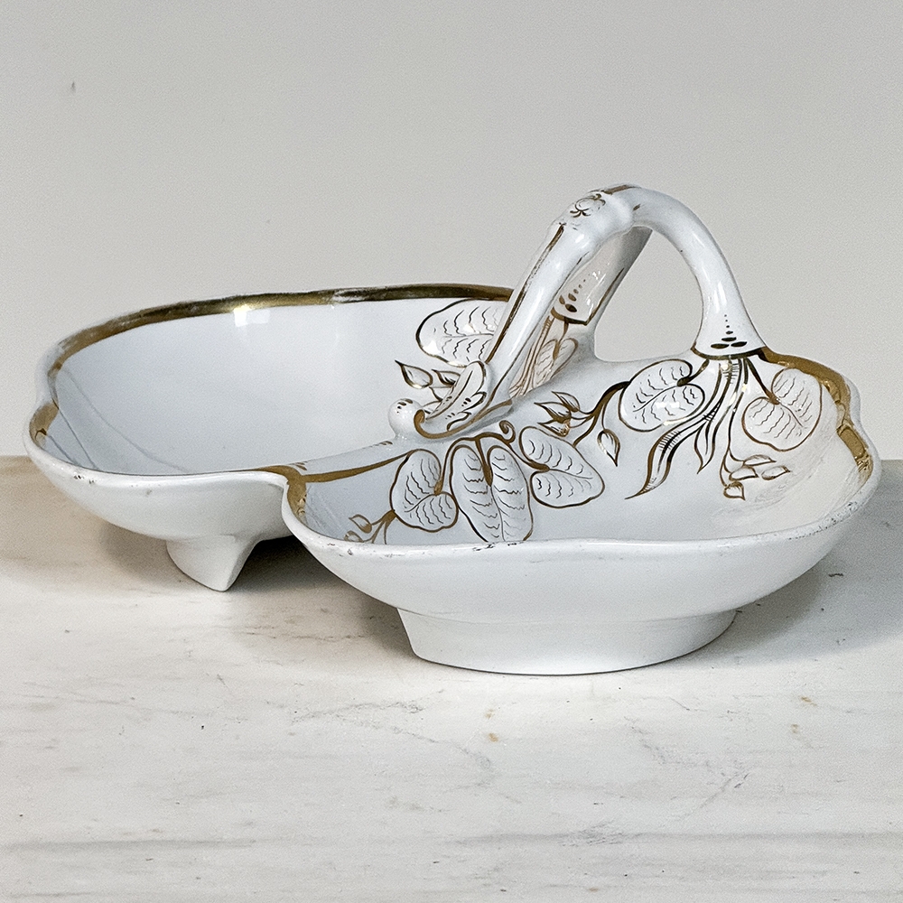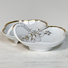 19th Century Porcelain Candy Dish by P. Regout & Co. of Maastrickt is a charming serving piece you'll be proud to display and use for special occasions! The maker was capitalizing on the demand for Old Paris (Vieux Paris) porcelain objects popular beginning in the mid-19th century. Cast with two distinct bowls for serving bites of candy, it features a handle that connects to three points in the design, hand-painted with foliage leaves and sprouts as well as bordering in gold for embellishment.