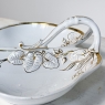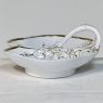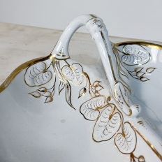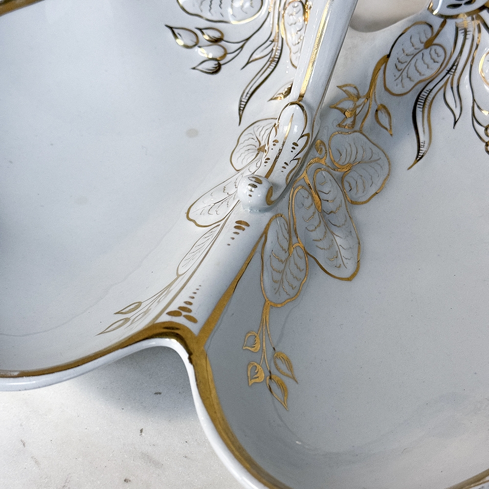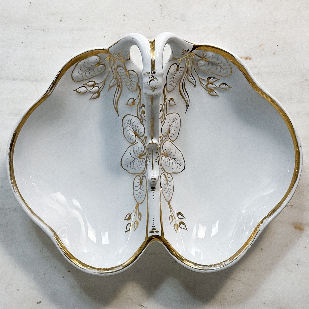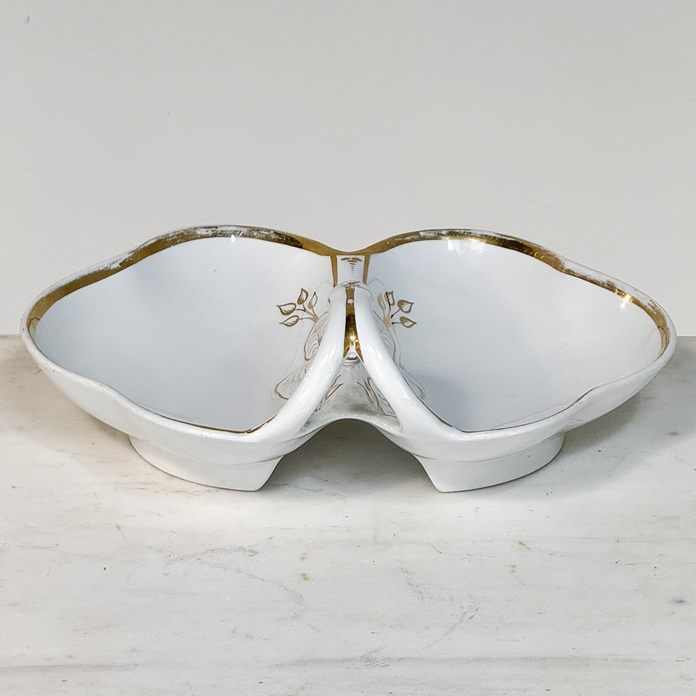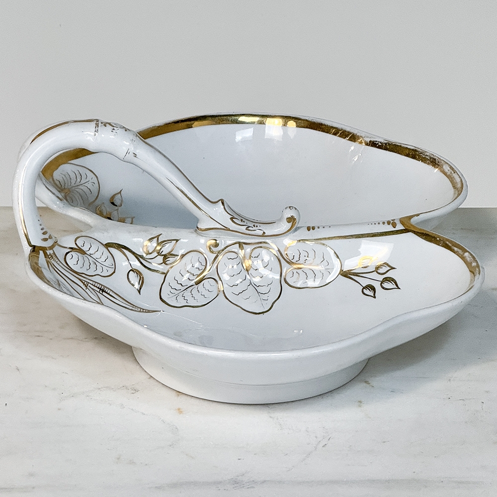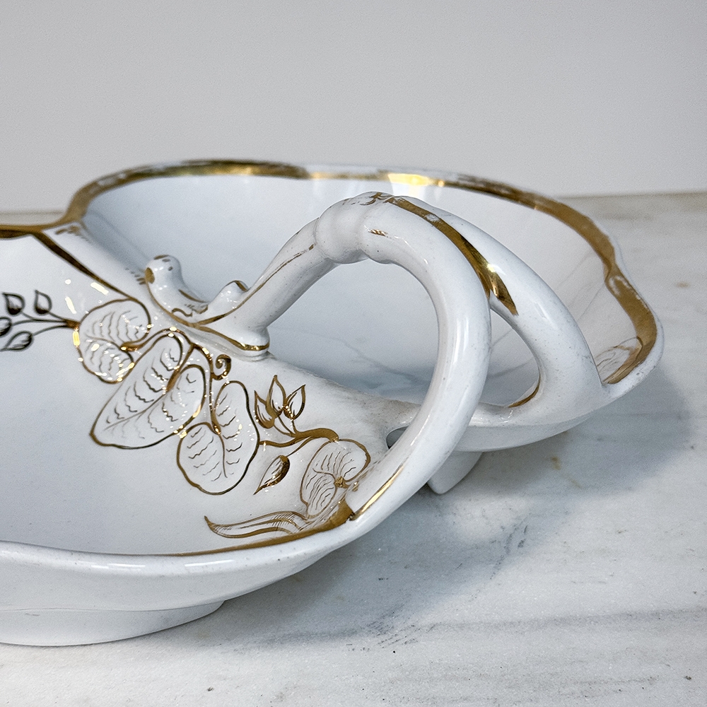 19th Century Porcelain Candy Dish by P. Regout & Co. of Maastrickt is a charming serving piece you'll be proud to display and use for special occasions! The maker was capitalizing on the demand for Old Paris (Vieux Paris) porcelain objects popular beginning in the mid-19th century. Cast with two distinct bowls for serving bites of candy, it features a handle that connects to three points in the design, hand-painted with foliage leaves and sprouts as well as bordering in gold for embellishment.