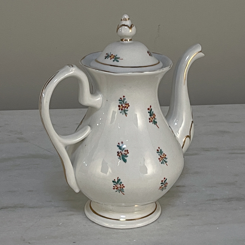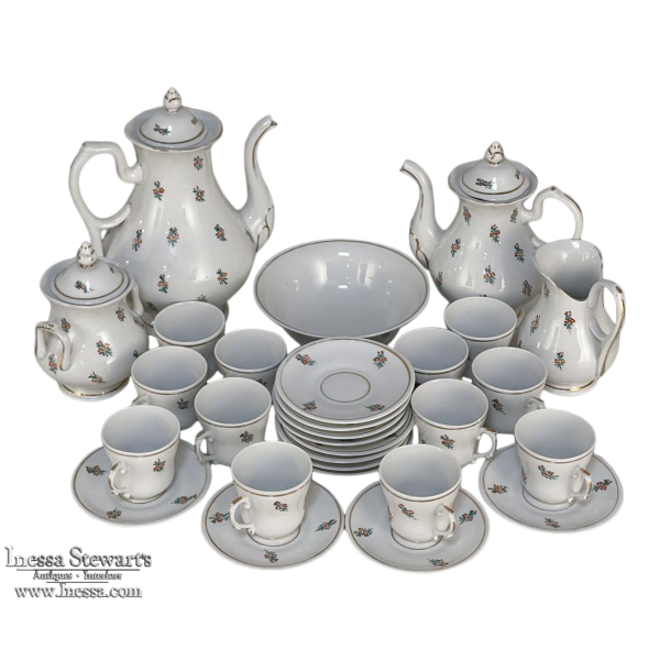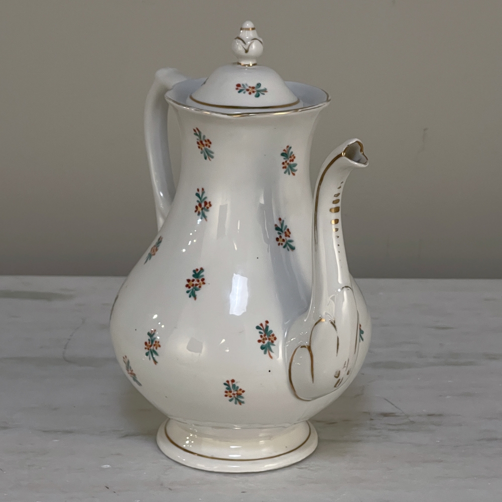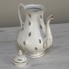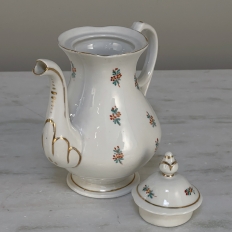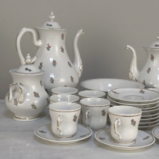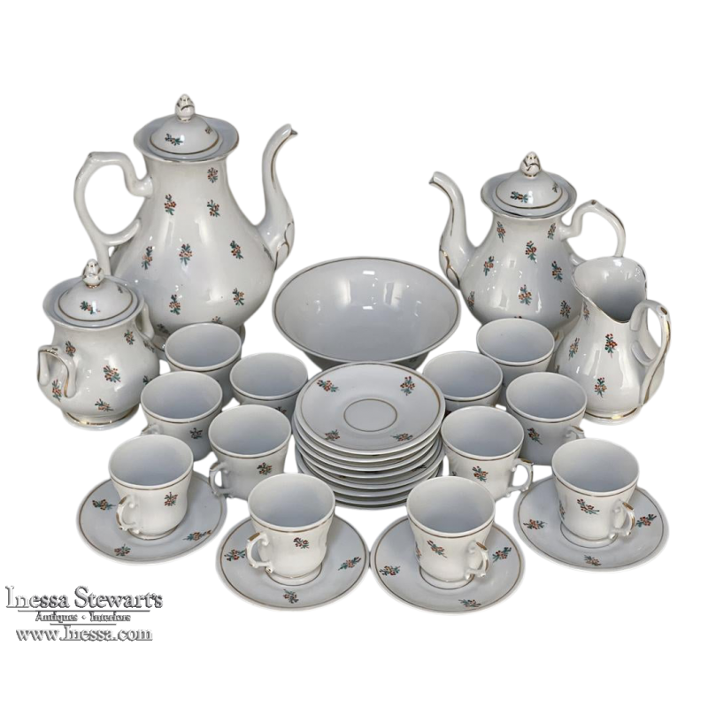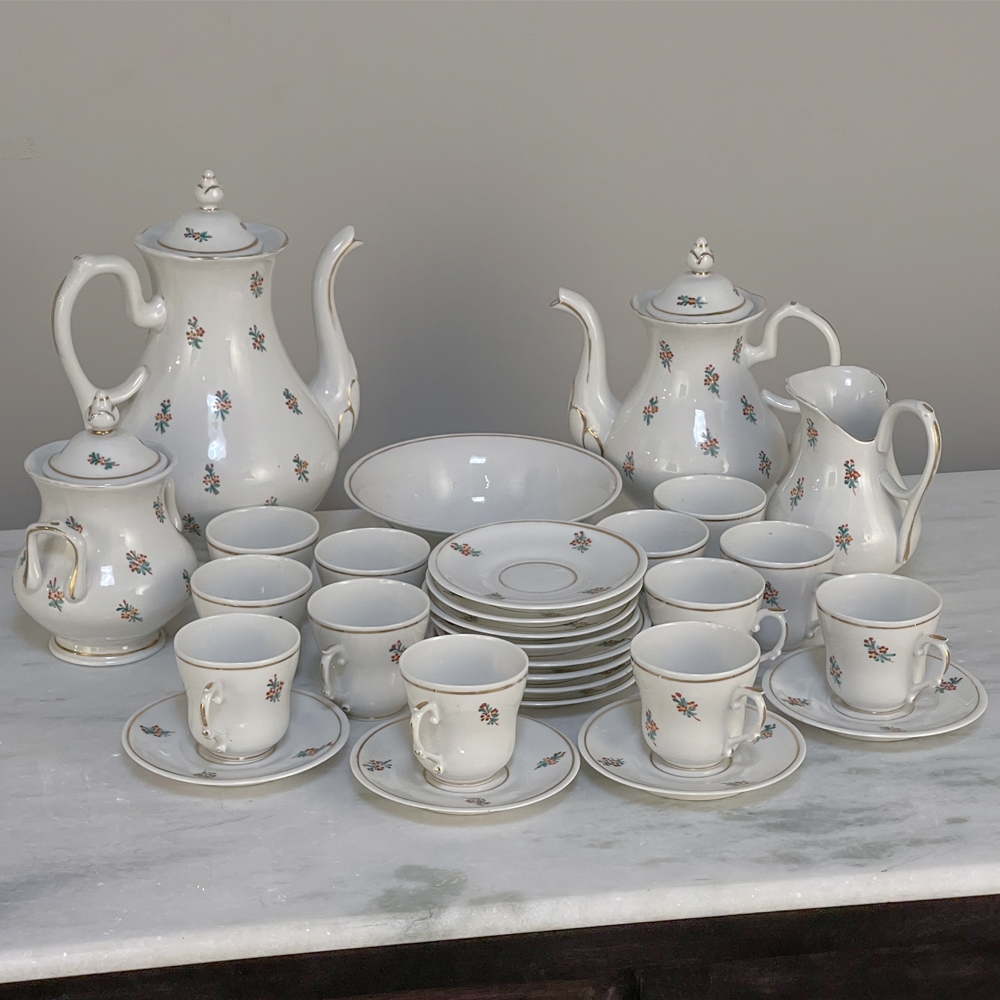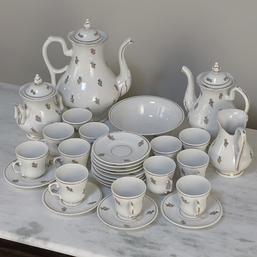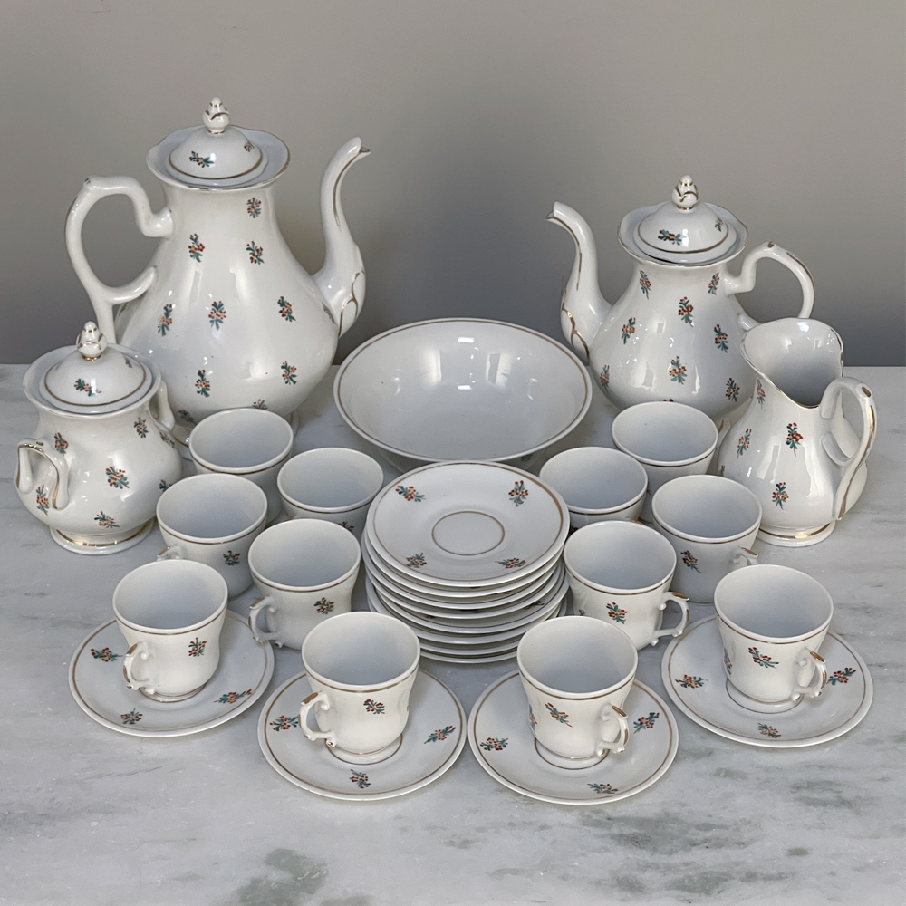 Sale29-Piece 19th Century Vieux-Paris Coffee & Tea Service will provide an elegant and stylish way to entertain your closest friends and relatives! Each piece is carefully crafted from fine porcelain, then hand-painted with the utmost in care and artistry using cornflower blues, ruby reds, a touch of saffron yellow and of course gold trim for accents. Set consists of a coffee pot, teapot, sugar, creamer, candy bowl, and 12 cups and saucers, all complete and in remarkable condition! Sets like this were in vogue during the Louis Philippe and into the Napoleon III periods, and the traditions continue in affluent households to this day. It is a very special find to see the complete set still intact, and still in such remarkable condition!