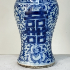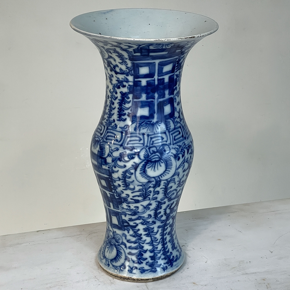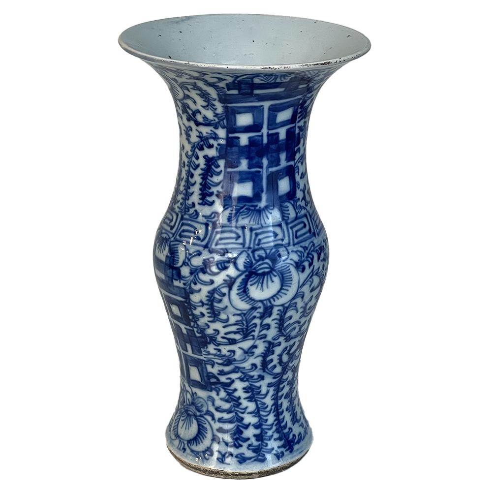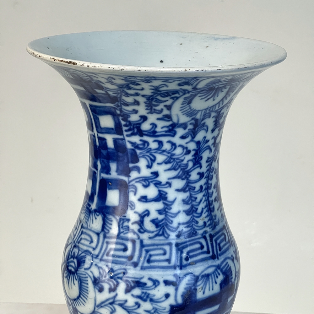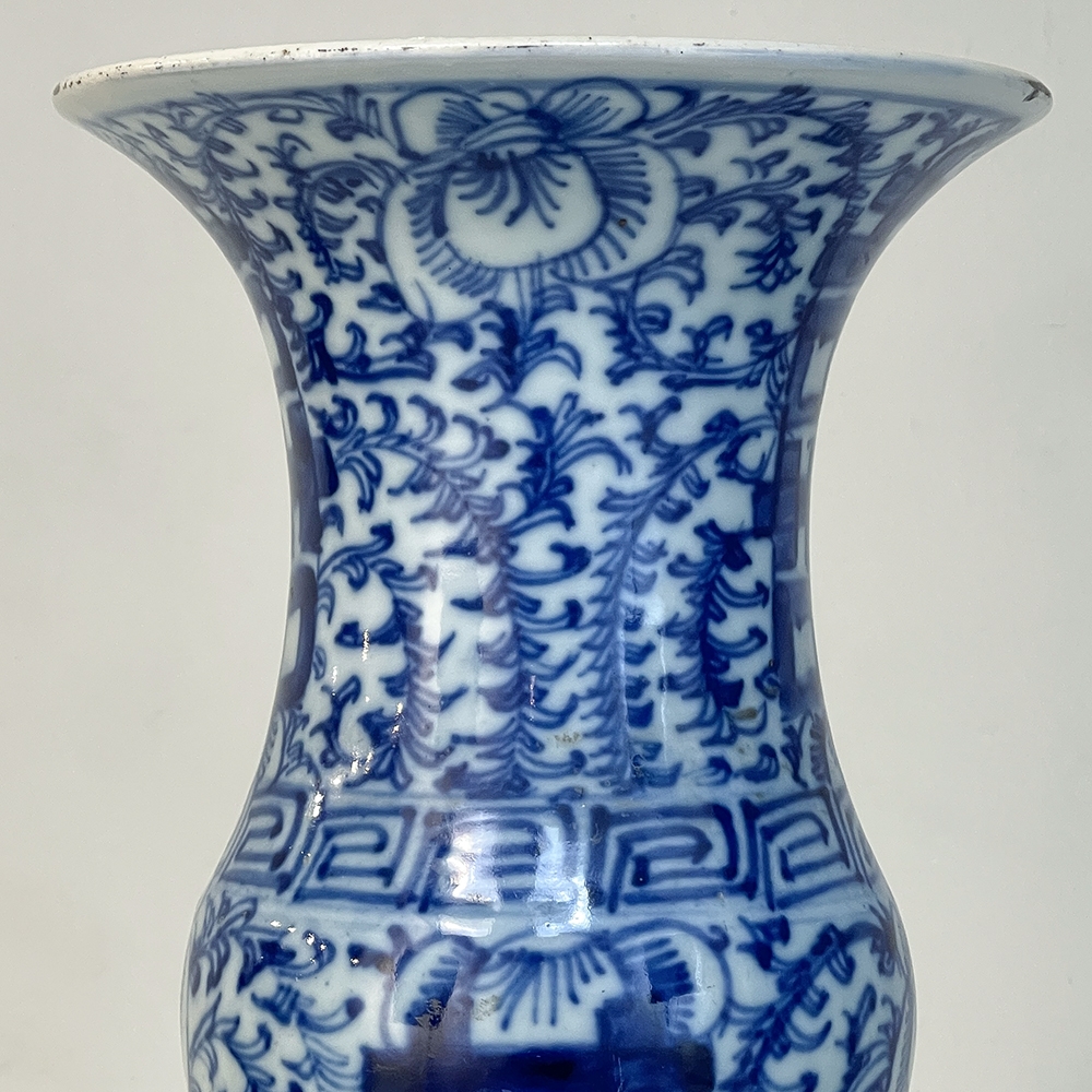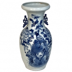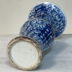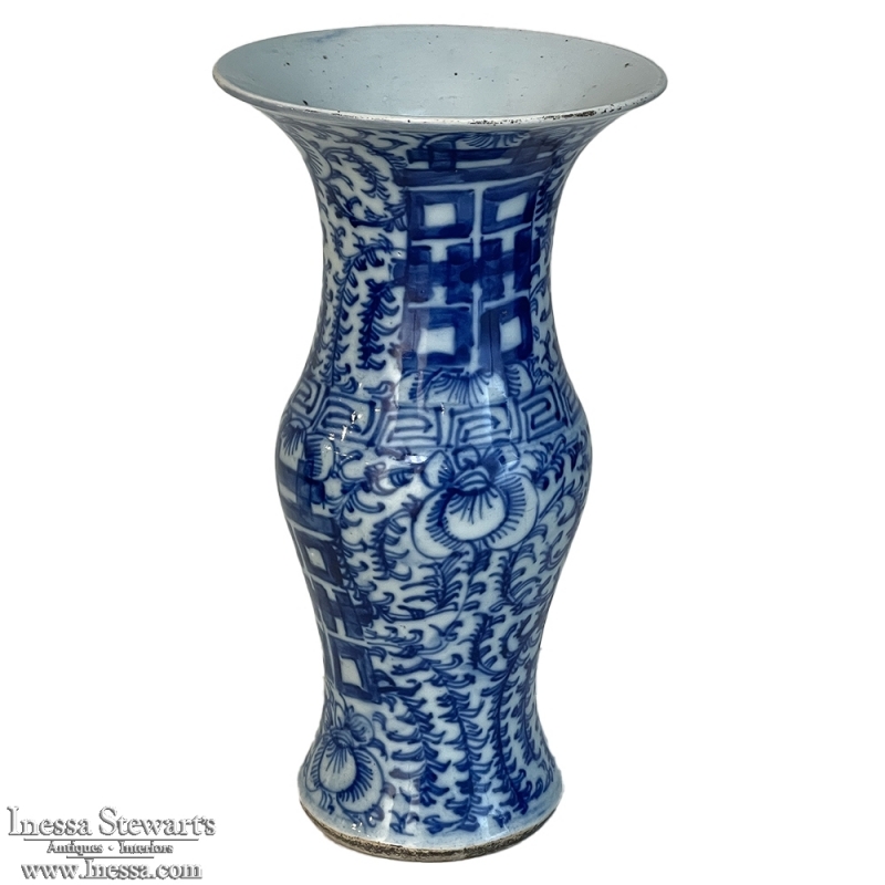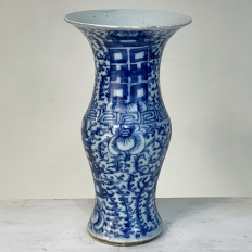 Antique Blue & White Chinese Vase is a great choice for adding timeless color and form to your collection, and perfect for displaying fresh or permanent flowers and foliage. The intricate nature-inspired patterns dominate the entire exterior, executed in rich cobalt blue that blurred slightly during the glazing process and firing, creating a soft effect called "flow blue" in Western Europe. Part of a private collection that can be seen in the Related Products below left.