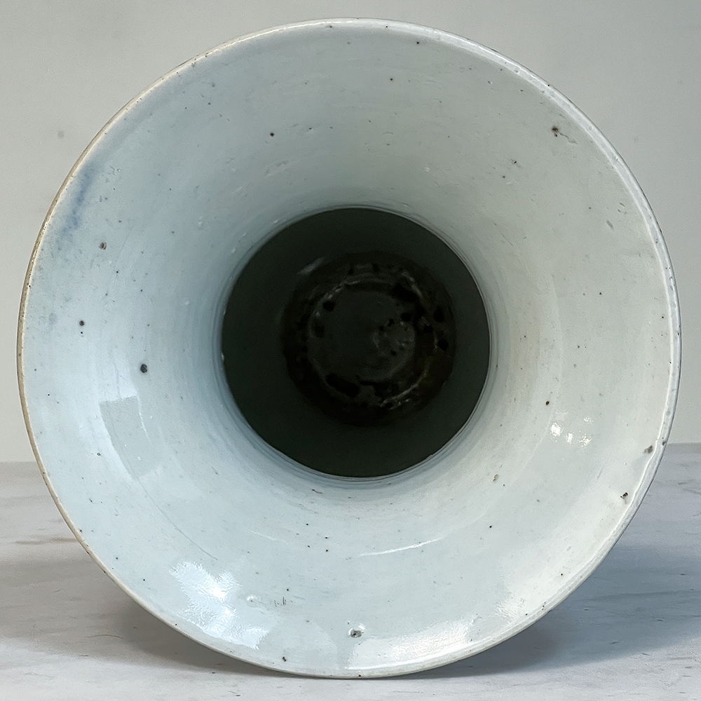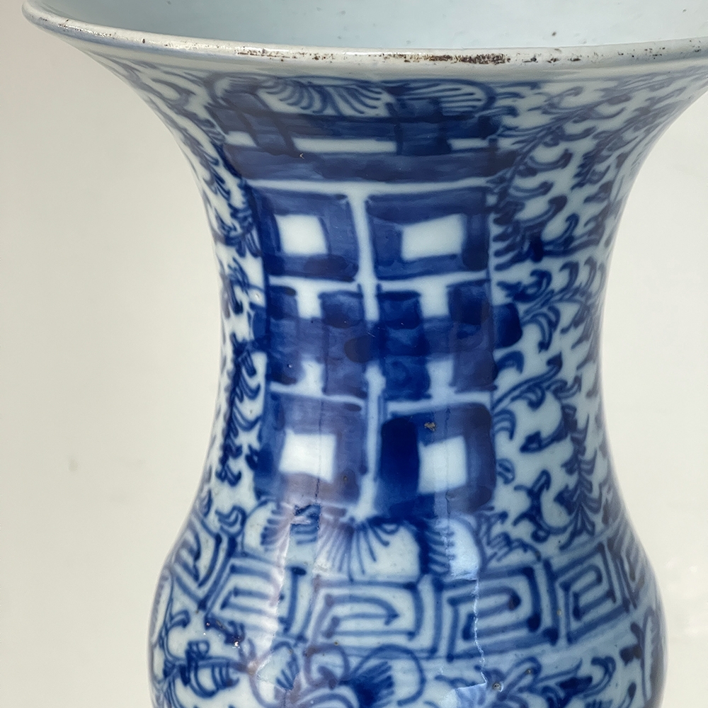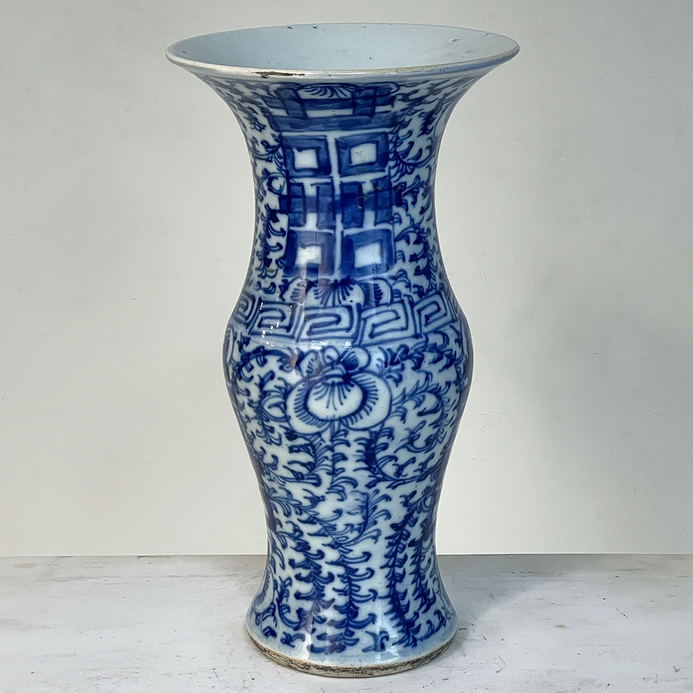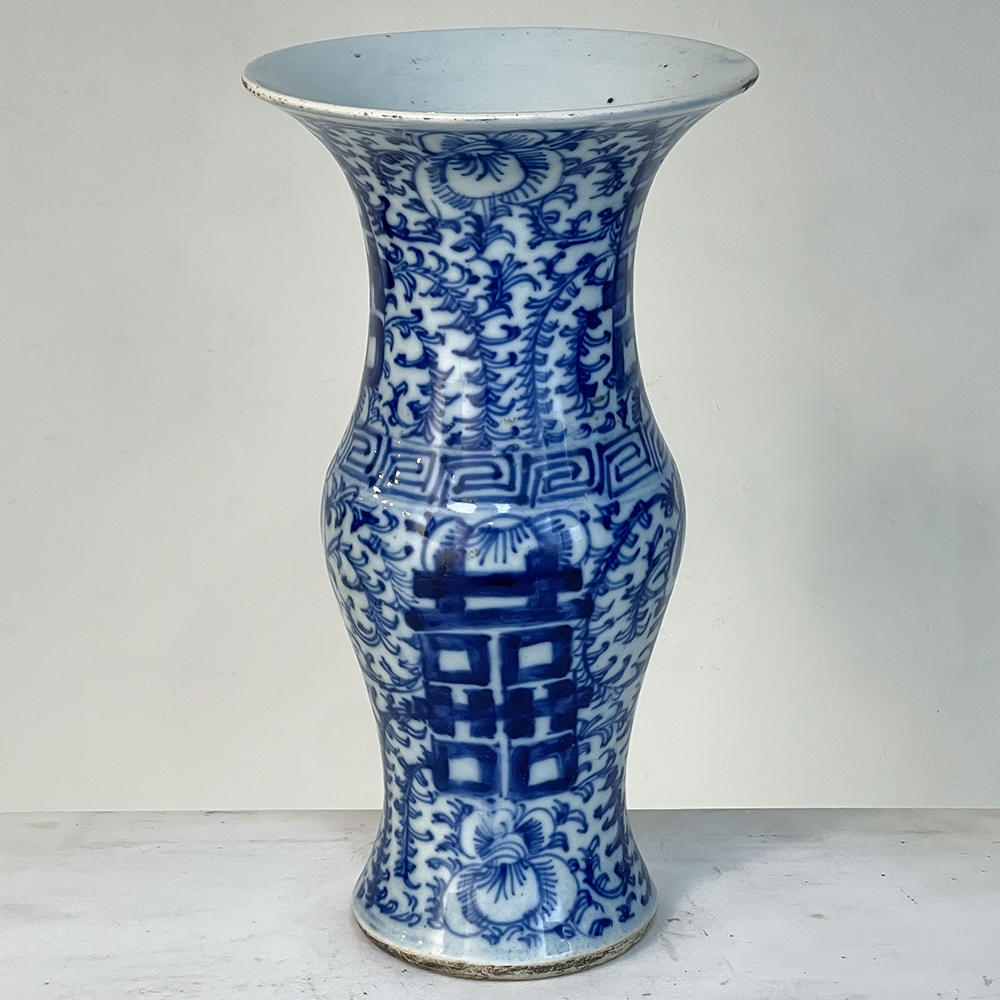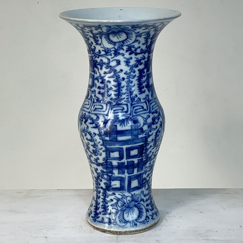 Antique Blue & White Chinese Vase is a great choice for adding timeless color and form to your collection, and perfect for displaying fresh or permanent flowers and foliage. The intricate nature-inspired patterns dominate the entire exterior, executed in rich cobalt blue that blurred slightly during the glazing process and firing, creating a soft effect called "flow blue" in Western Europe. Part of a private collection that can be seen in the Related Products below left.