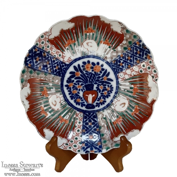 Antique Decorative Hand-Painted Imari Plate is a colorful accent that will bring a vibrant effect to your decor! Rich cobalt blues and deep copper red hues pop off of the pure white kaolin-quality white porcelain clay, with intricate design work inspired by nature in a pleasing circular work, centered with a flower vase.
