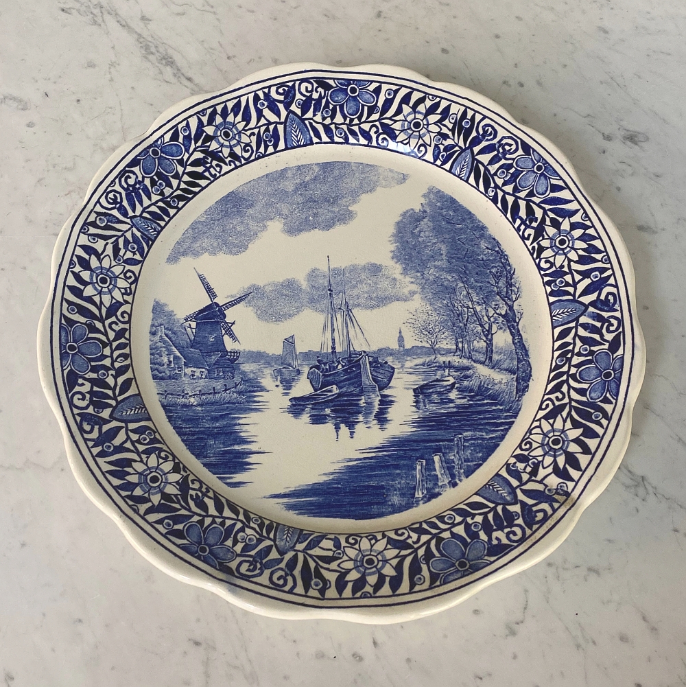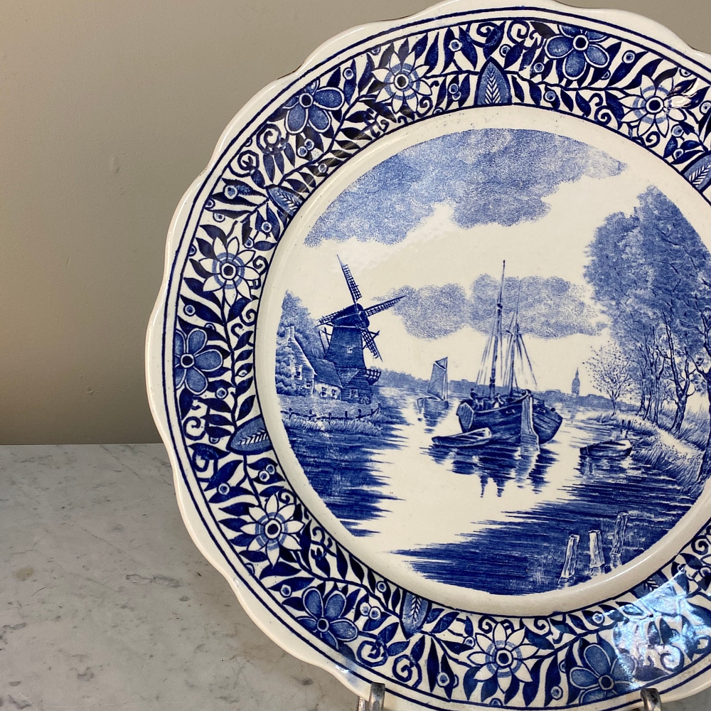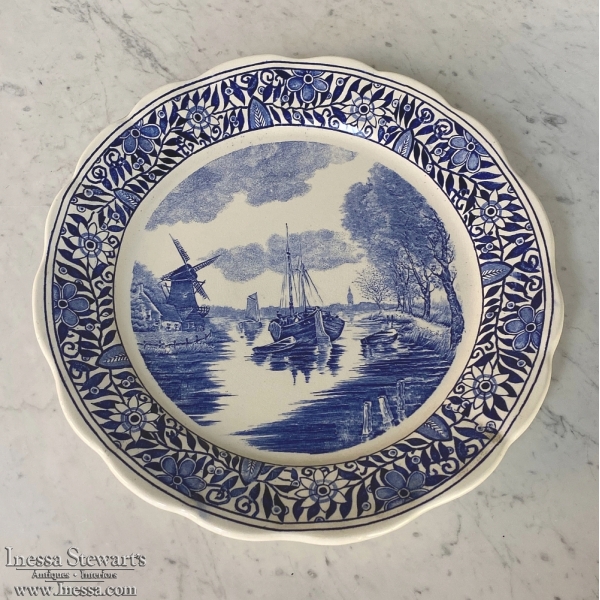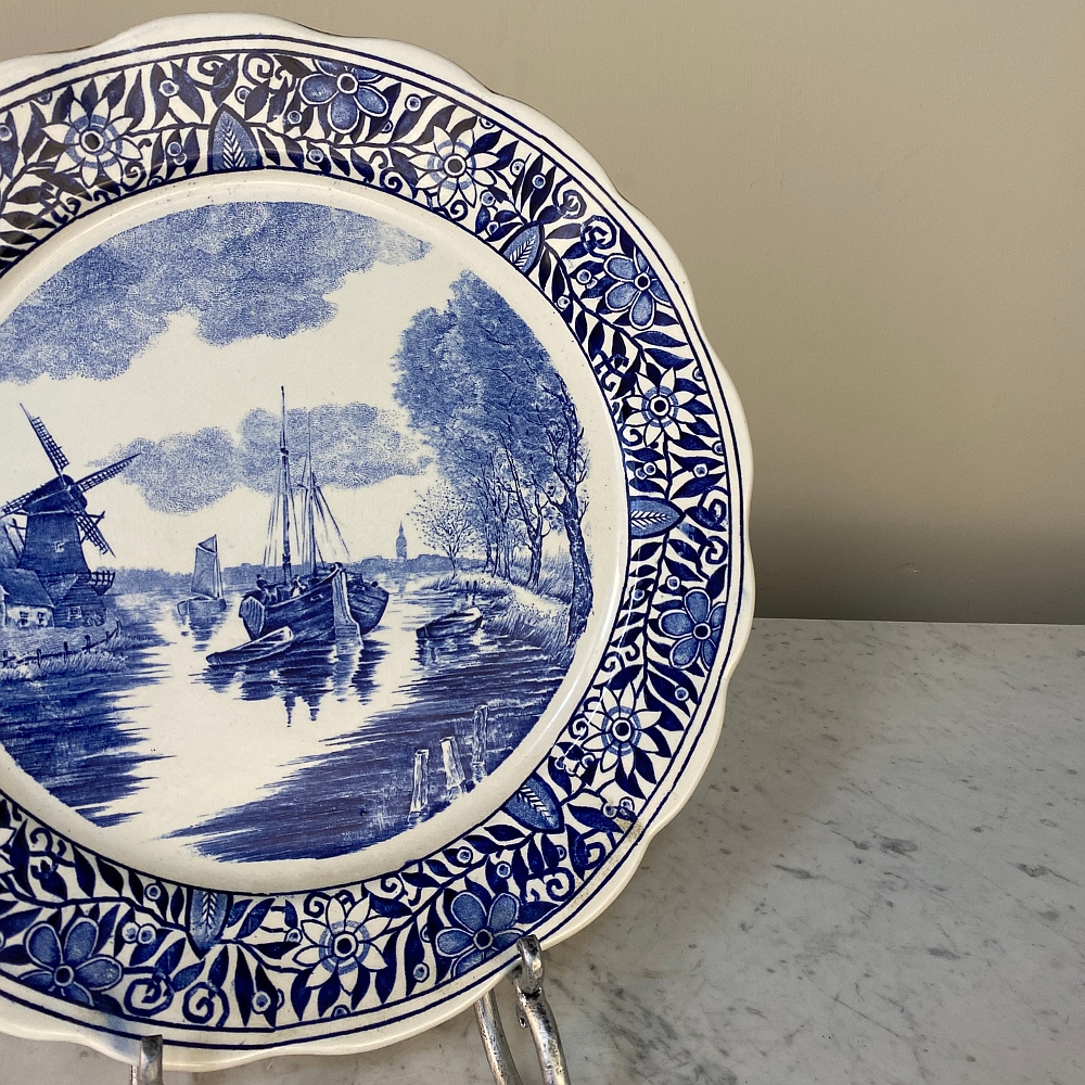 SaleAntique Delft Charger by Boch is a beautiful work in Blue & White, hand-painted by a talented artist to depict a charming coastal scene with depiction of a seashore with windmills and various boats, all surrounded by a foliate bordering. Such works were usually displayed like artwork, but occasionally pressed into service for serving special guests!