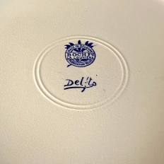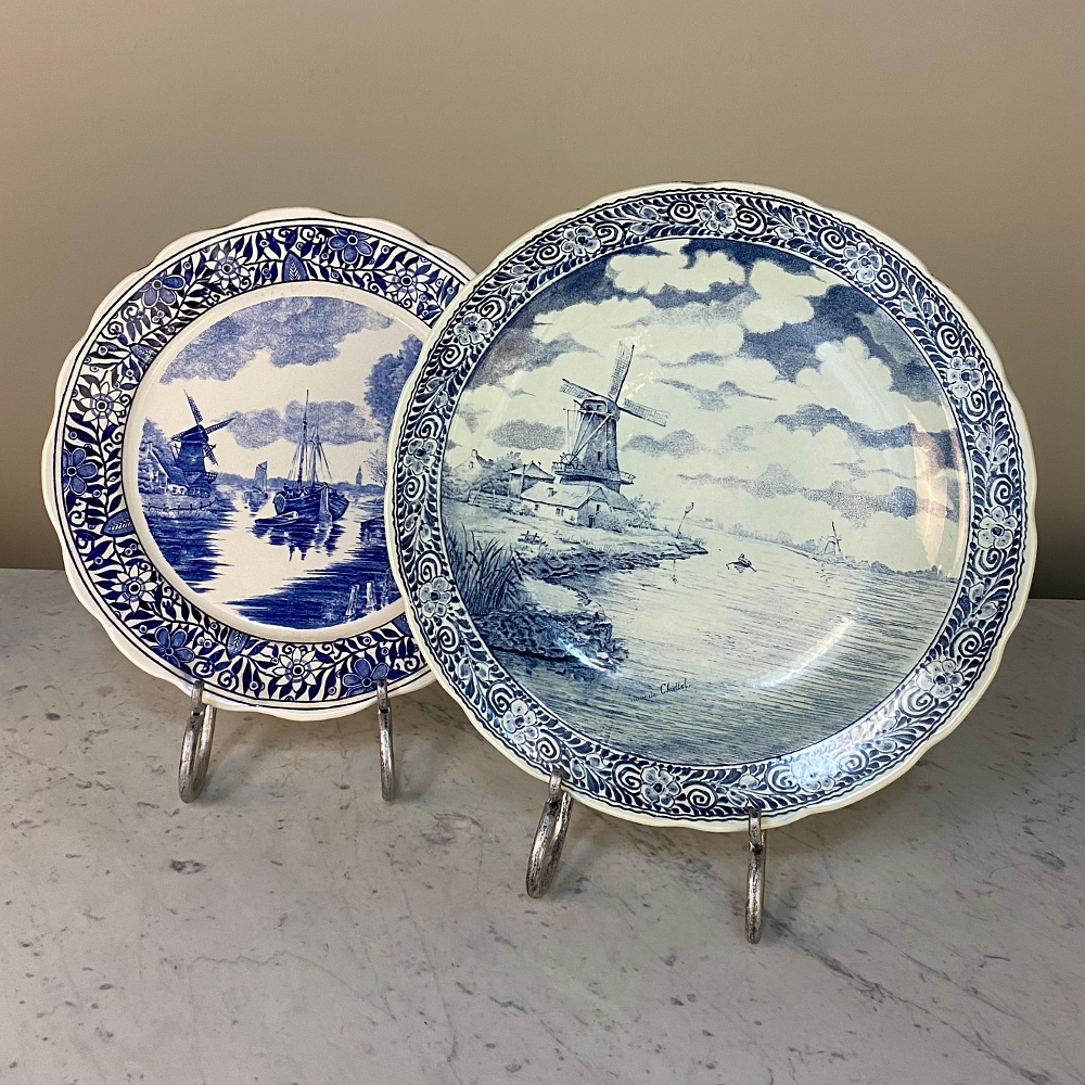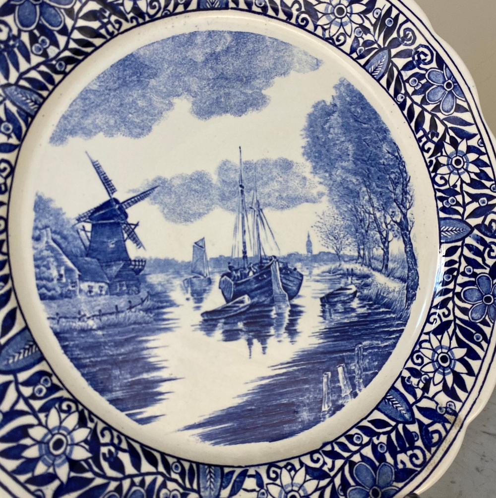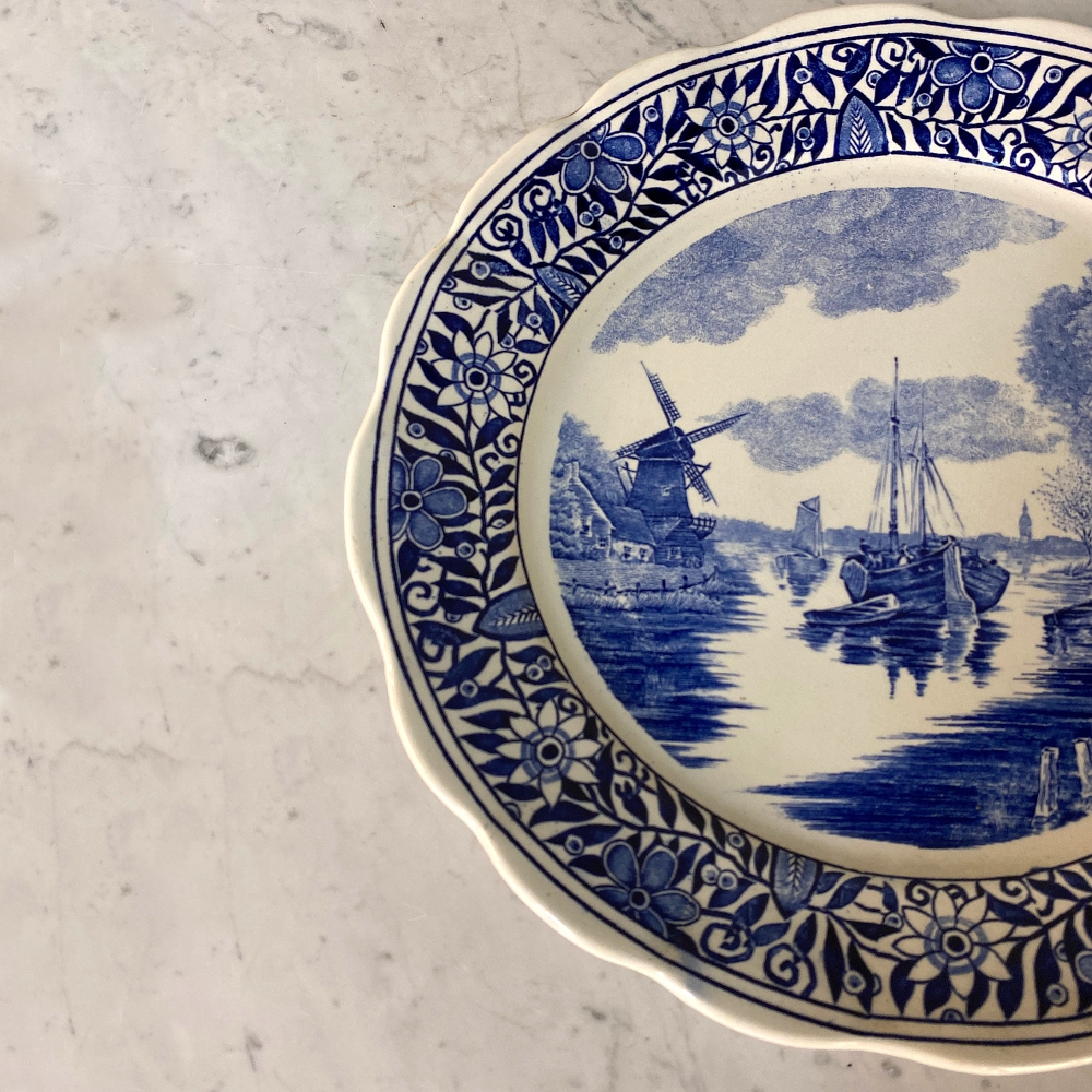 SaleAntique Delft Charger by Boch is a beautiful work in Blue & White, hand-painted by a talented artist to depict a charming coastal scene with depiction of a seashore with windmills and various boats, all surrounded by a foliate bordering. Such works were usually displayed like artwork, but occasionally pressed into service for serving special guests!
