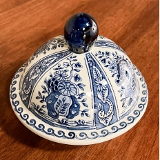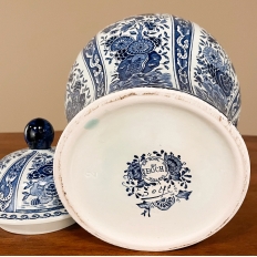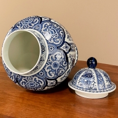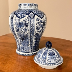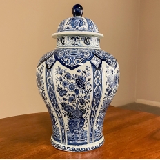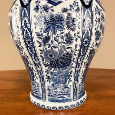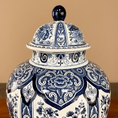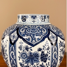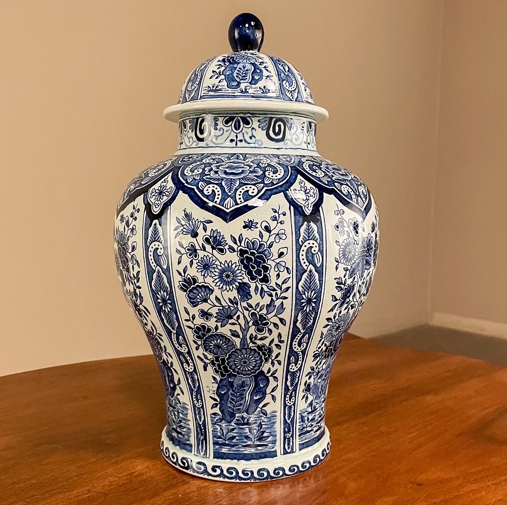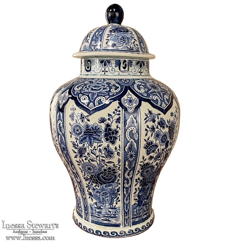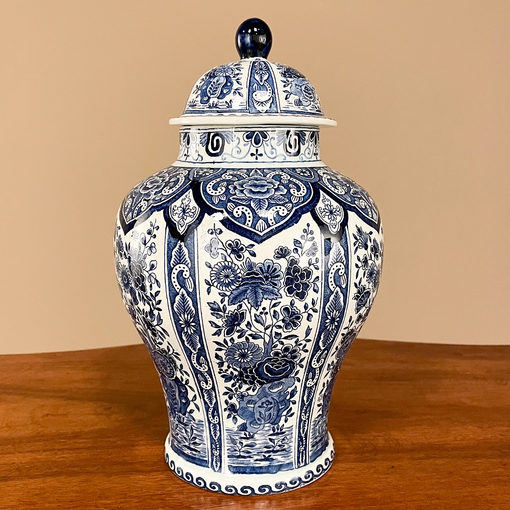Antique Delft Lidded Urn by Boch of Belgium is a splendid example of fine ceramic porcelains from the region that encompassed northern France, Luxembourg, Belgium, and Holland.  The storied company was founded by Francois Boch in 1748 and evolved through many permutations over the decades, witnessing the revolution in Belgium, the rise and fall of monarchs, and two world wars.  Changing its factory locations over the years in the aforementioned countries, its quality and desirability was maintained making it so collectible today.  This pattern, created for the Royal Sphinx in The Netherlands has all the intricacies of transferware, but was hand-painted in rich cobalt blue, and features a classic traditional pattern including a variety of flowers, backgrounds and bordering.