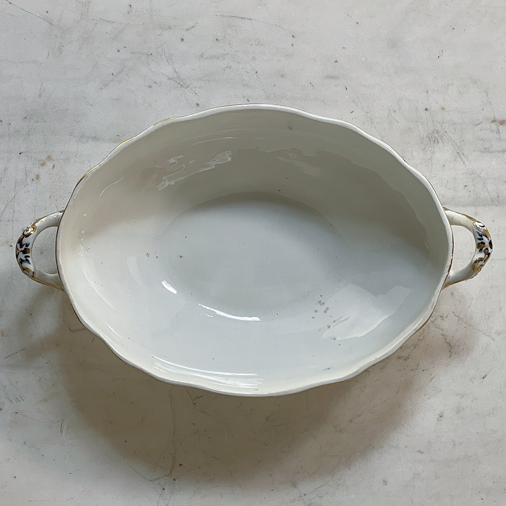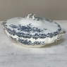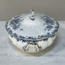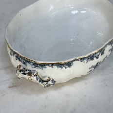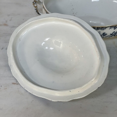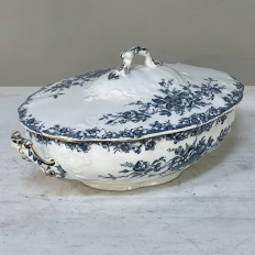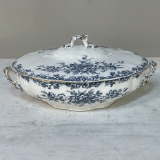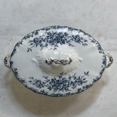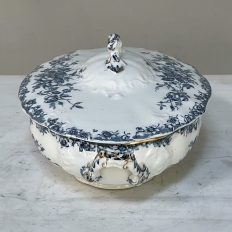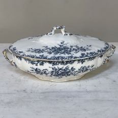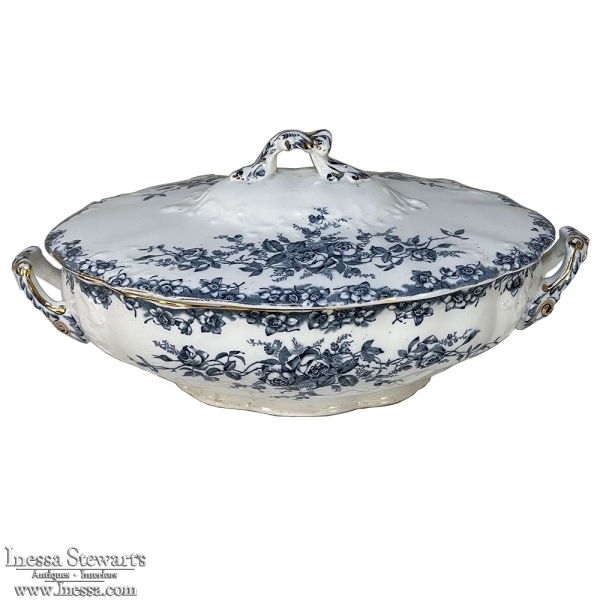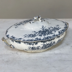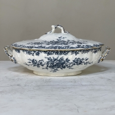 Antique English Blue & White Transferware Lidded Tureen by S. Hancock & Sons is a rather unusual find by this particular maker that was established during the mid-19th century in Stoke on Trent, England. The pattern was named Millais, and due to legal controversies over nomenclature they were obliged to call it "Semi-Porcelain" so as not to infringe upon Oriental imported goods. A lovely floral spray pattern is repeated twice on the lid, and twice again on the tureen itself, with decorative rim and flourishes even on the sides and handles, with the bold cobalt blue retaining its rich coloration even after a century!