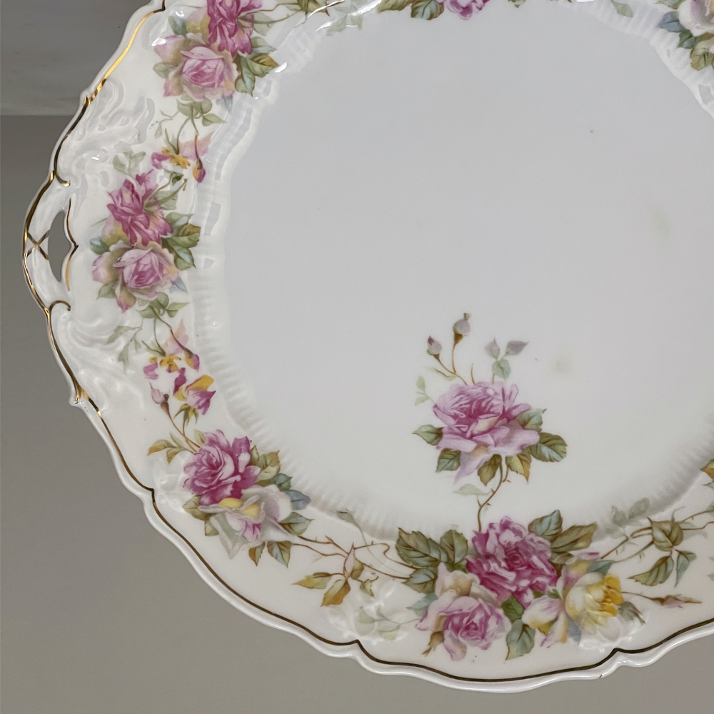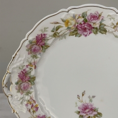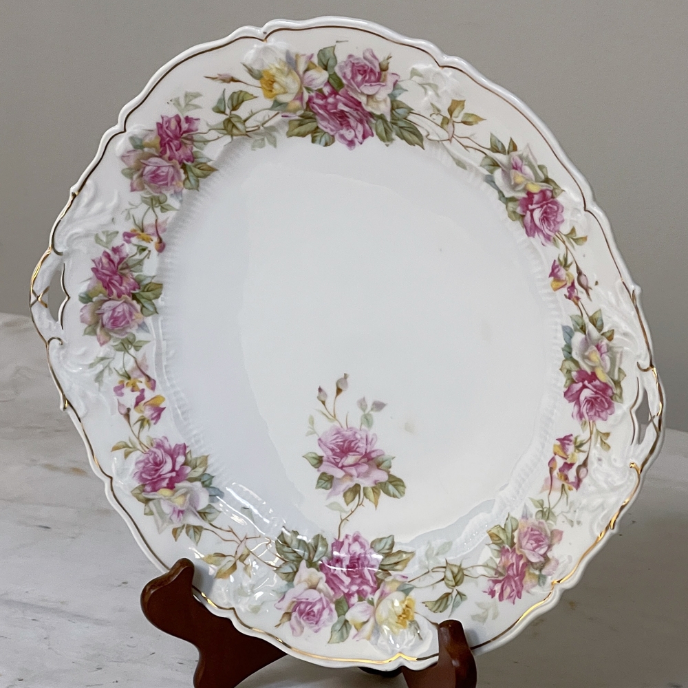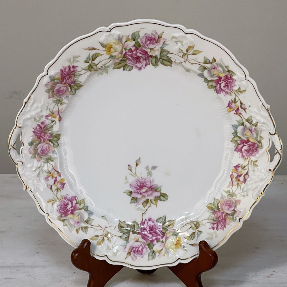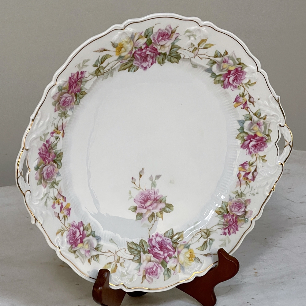 Antique Hand-Painted Platter from Hutschenreuther of Bavaria is a delightful rose pattern, intricately painted around the entire perimeter with the foliate edges highlighted in gold, and centered with lovely rose bouquets in lively jewel tones at the centers. Perfect for display or for livening up your entertaining!