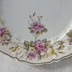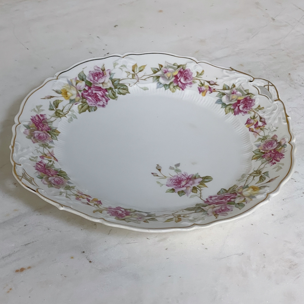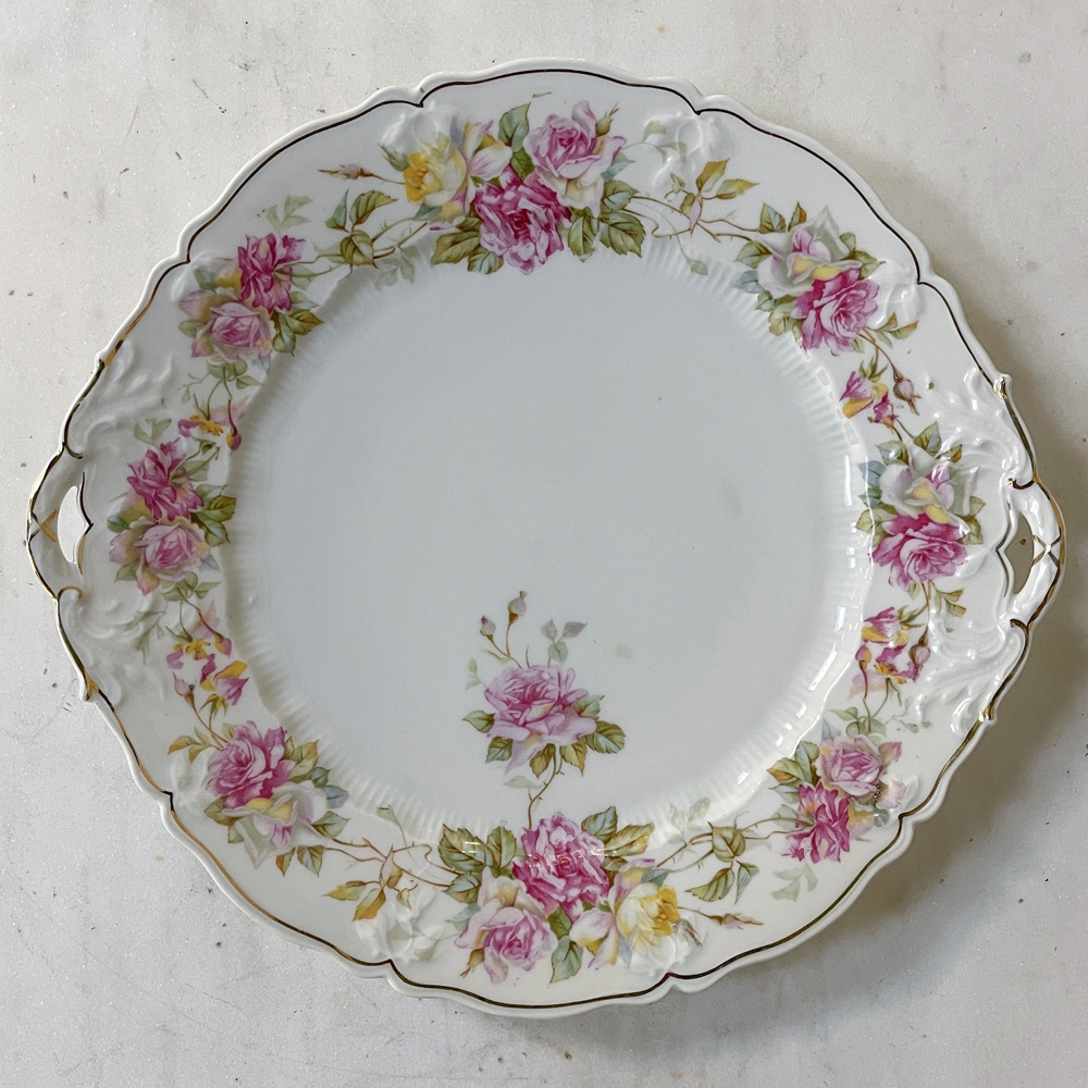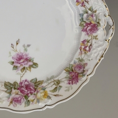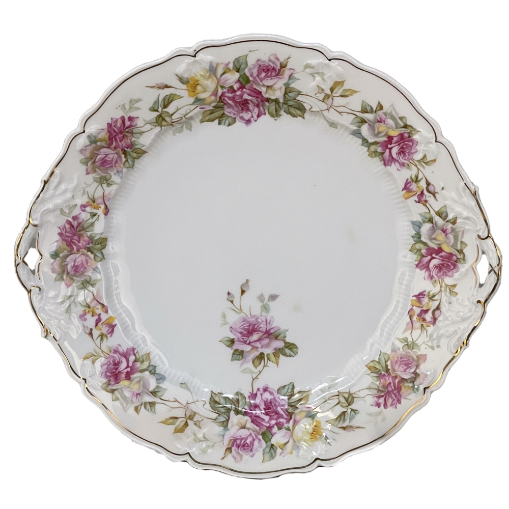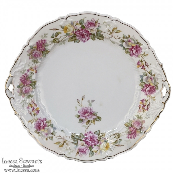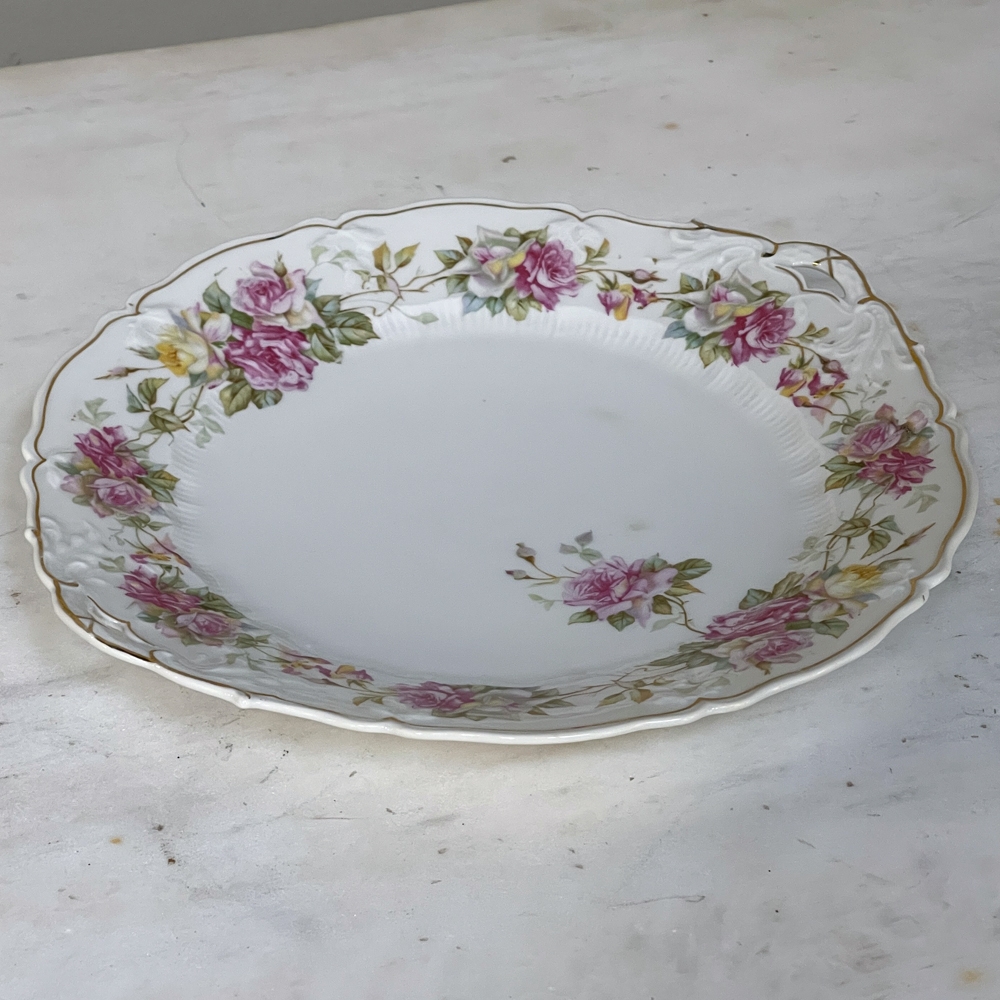 Antique Hand-Painted Platter from Hutschenreuther of Bavaria is a delightful rose pattern, intricately painted around the entire perimeter with the foliate edges highlighted in gold, and centered with lovely rose bouquets in lively jewel tones at the centers. Perfect for display or for livening up your entertaining!