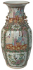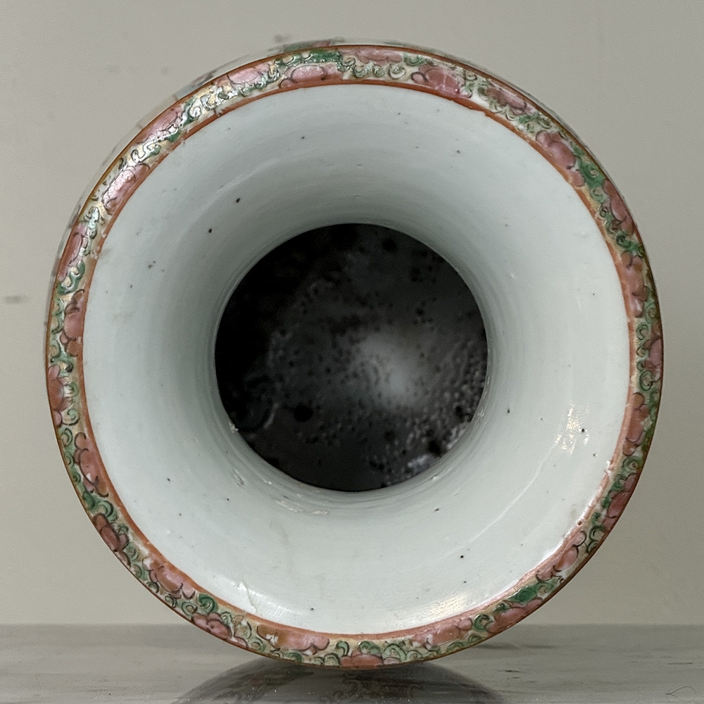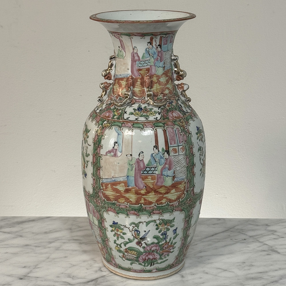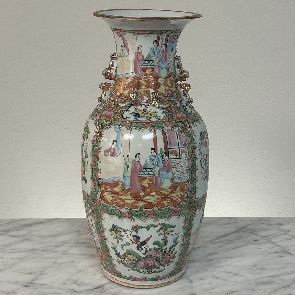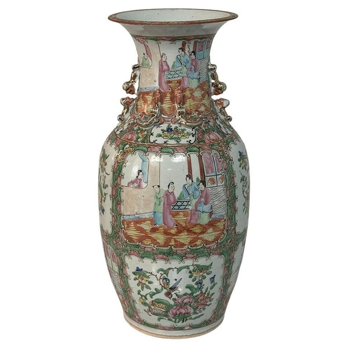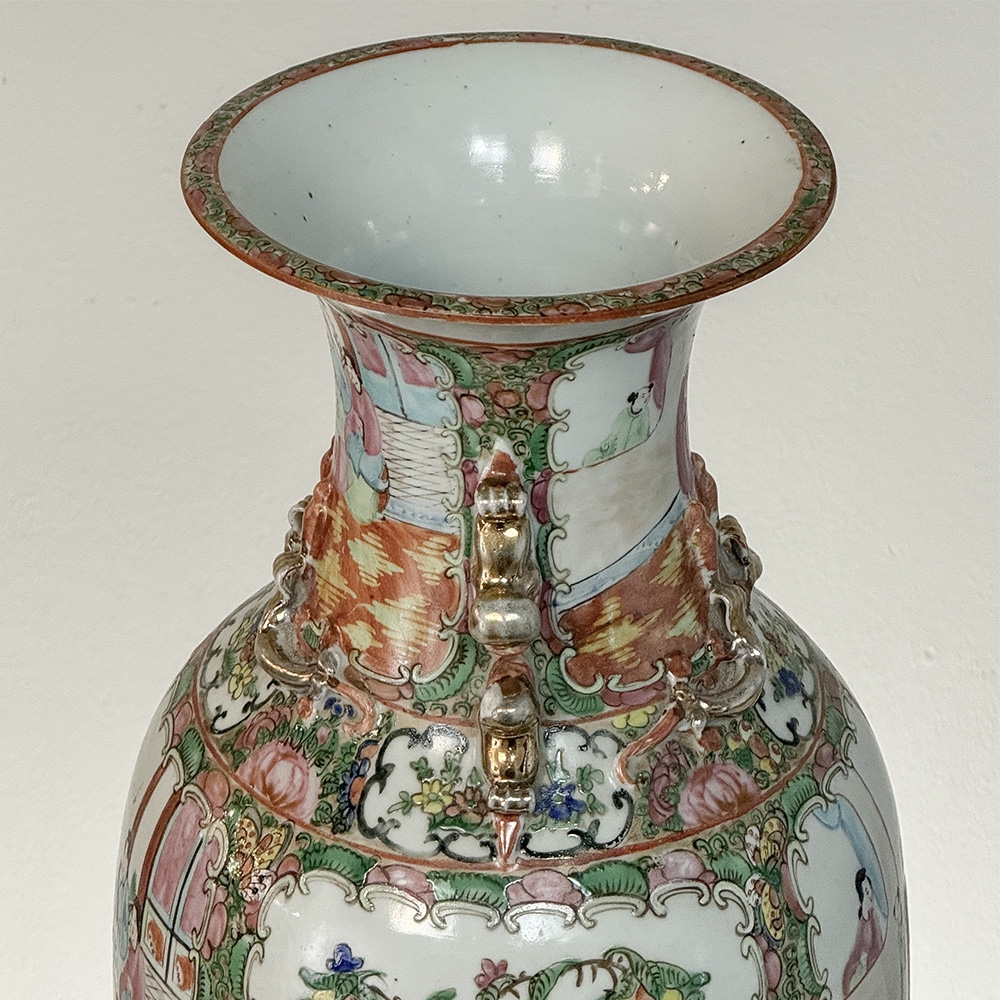 Antique Rose Medallion Porcelain Vase is an exceptionally well-preserved example of the genre. Designed with eight distinct panels around the main body, it features a continuous panoramic and romantic scene around the neck, interrupted by projecting foliates enhanced in gold to aid in handling the vase. The rim is gracefully flared and also treated with gold finish.