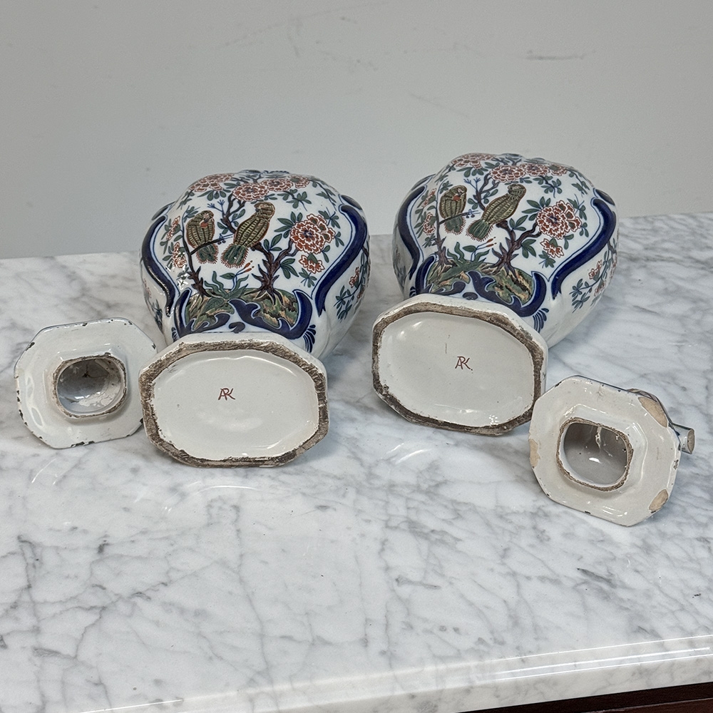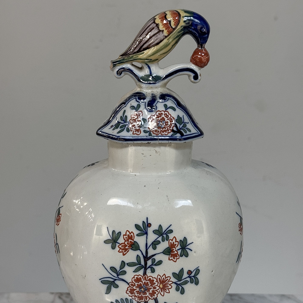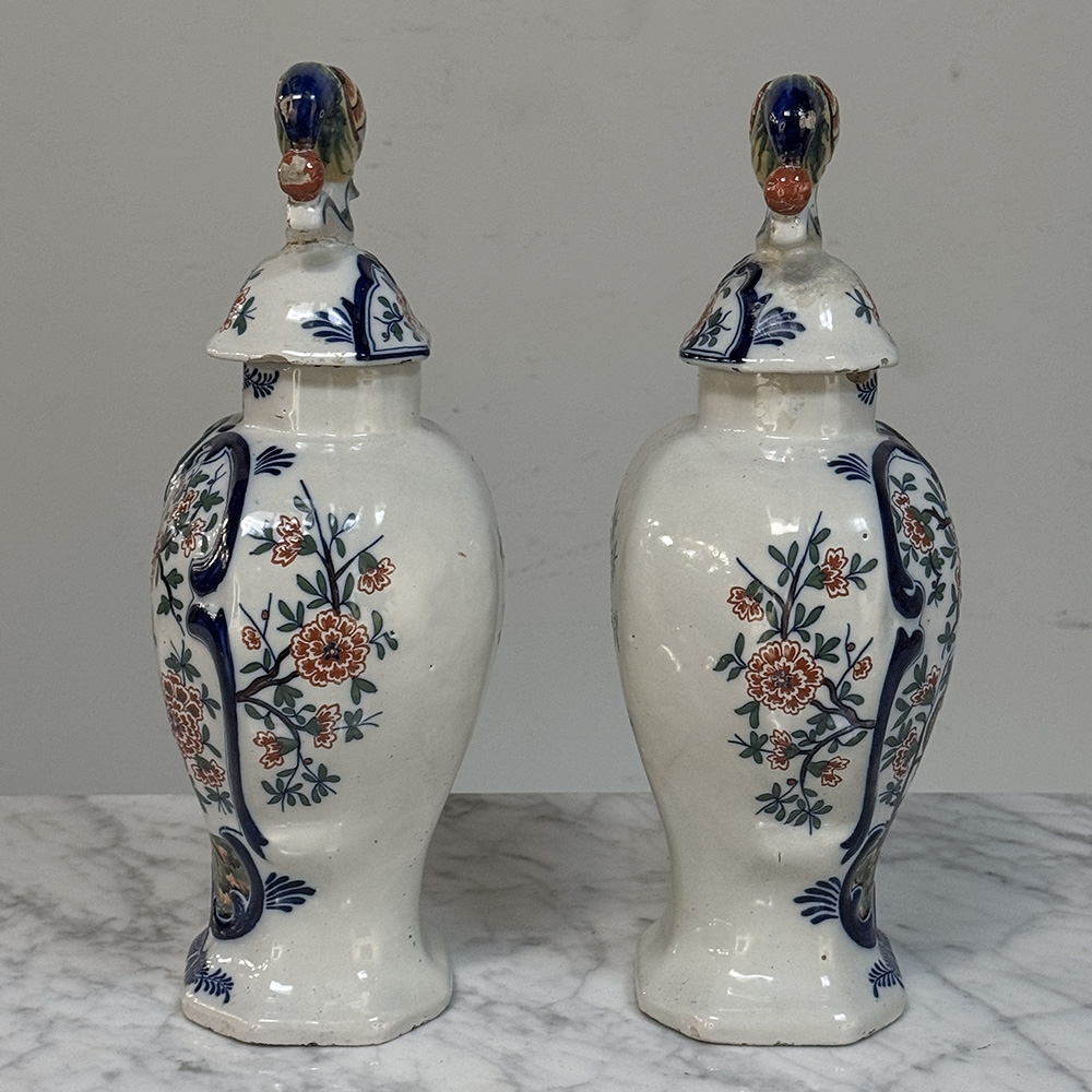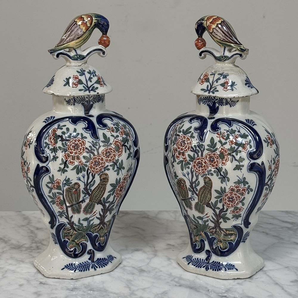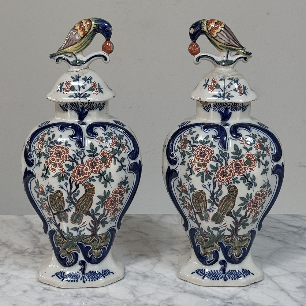 Pair 18th Century Delft Ceramic Lidded Vases is a beautiful set, hand-painted with lively floral decoration, scrolling blue borders, and wonderfully expressive bird-form finials crowning the original lids. The balance of color and whimsy gives these pieces the unmistakable charm that makes early Delft so beloved, while the shaped bodies and painterly surfaces bring warmth, history, and a collected European character to any interior.