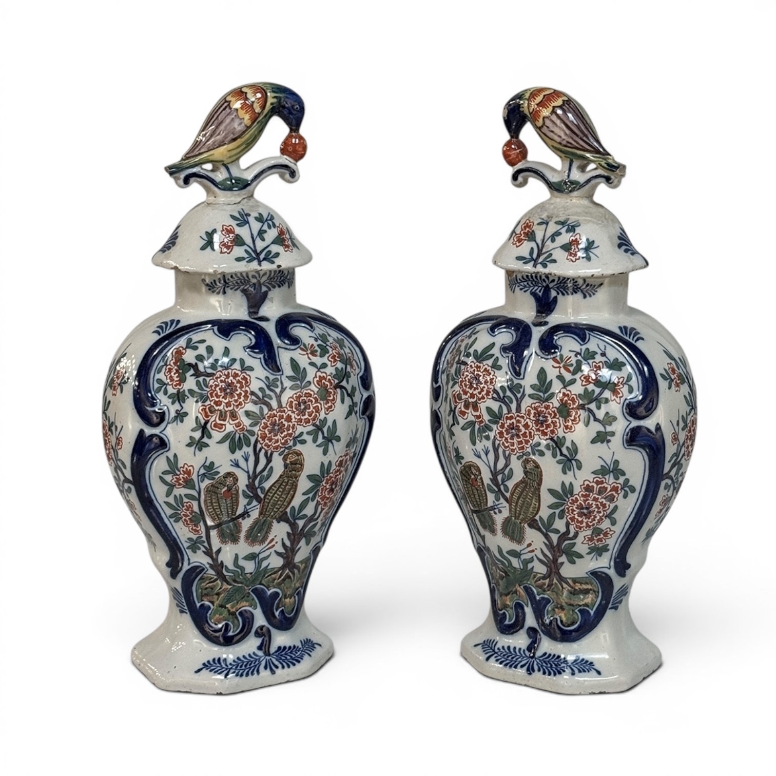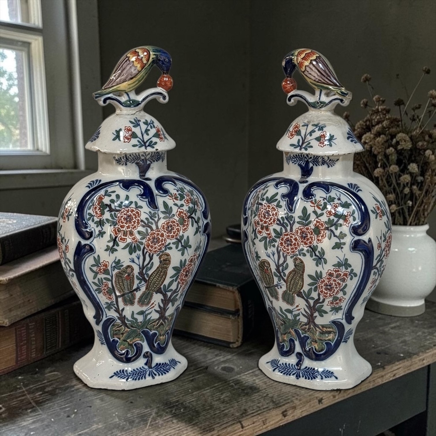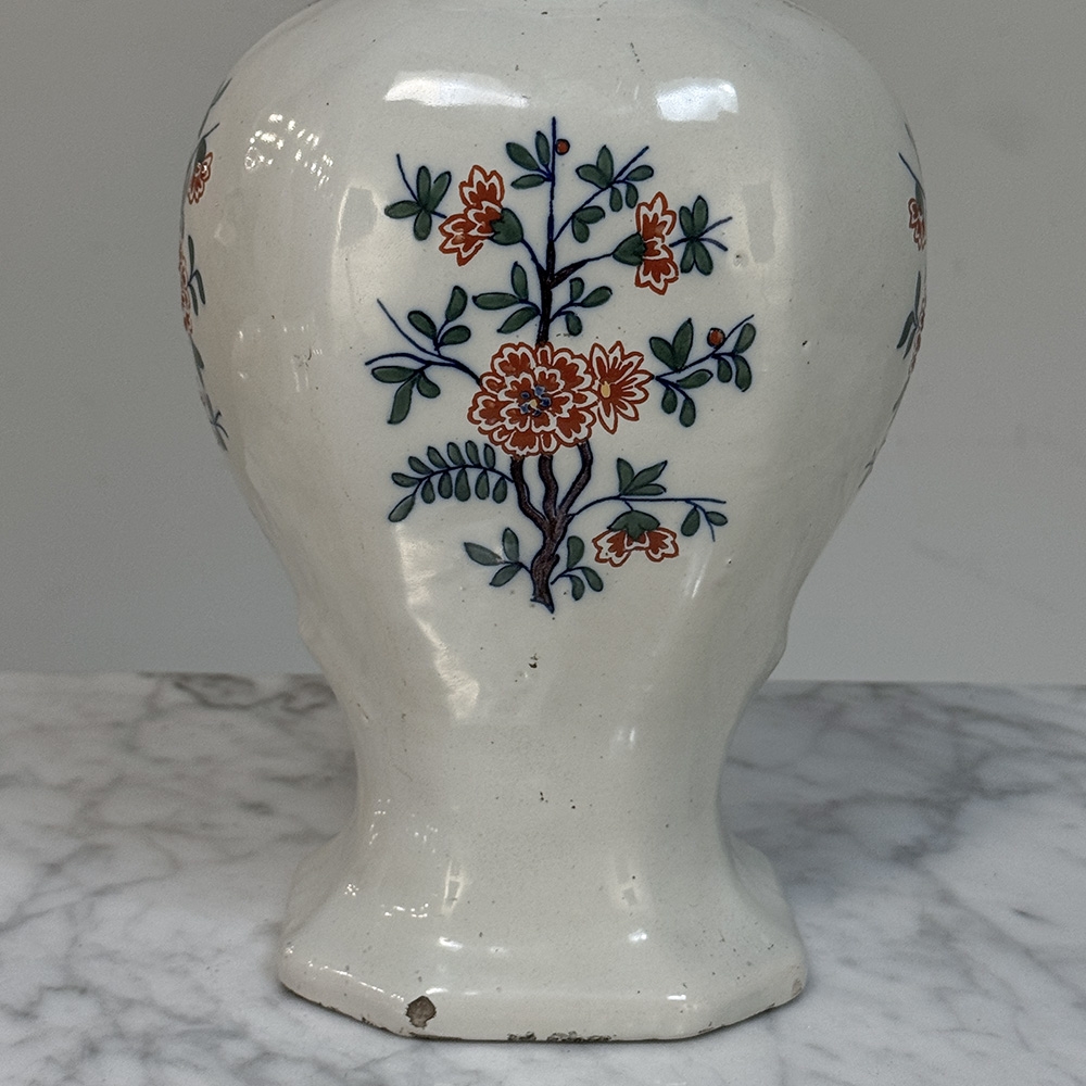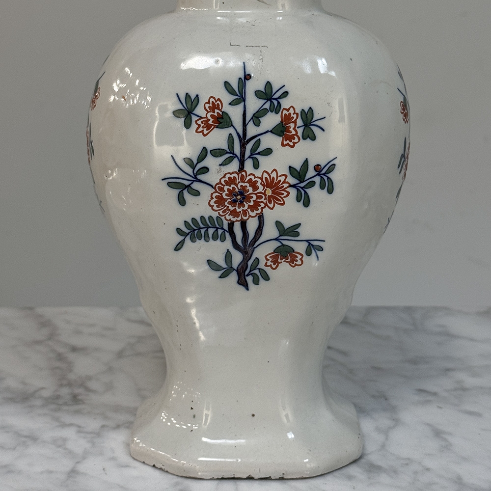 Pair 18th Century Delft Ceramic Lidded Vases is a beautiful set, hand-painted with lively floral decoration, scrolling blue borders, and wonderfully expressive bird-form finials crowning the original lids. The balance of color and whimsy gives these pieces the unmistakable charm that makes early Delft so beloved, while the shaped bodies and painterly surfaces bring warmth, history, and a collected European character to any interior.