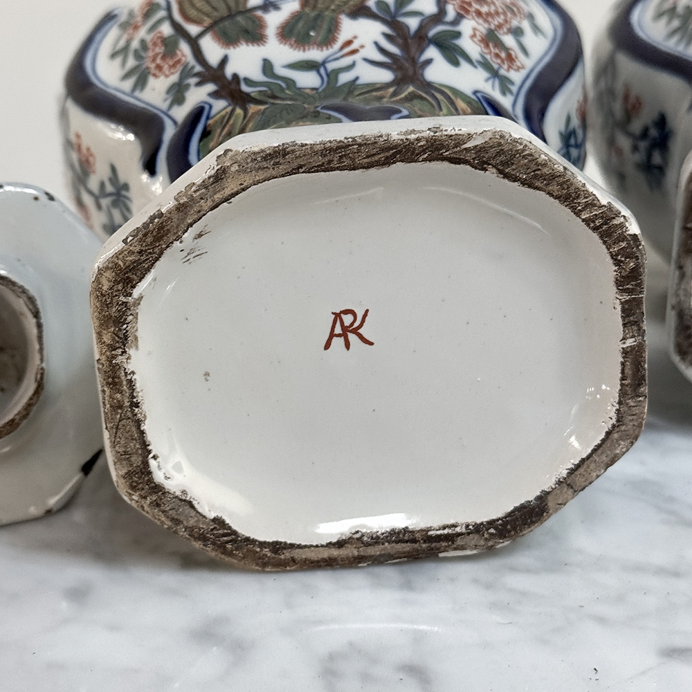 Rich in decorative detail, they are especially appealing displayed as a pair on a mantel, console, or bracket, where the originality of the lids and the hand-done character of the painting can be fully appreciated. Their presence is both elegant and playful, with the kind of craftsmanship and individuality that only antique pottery can offer.