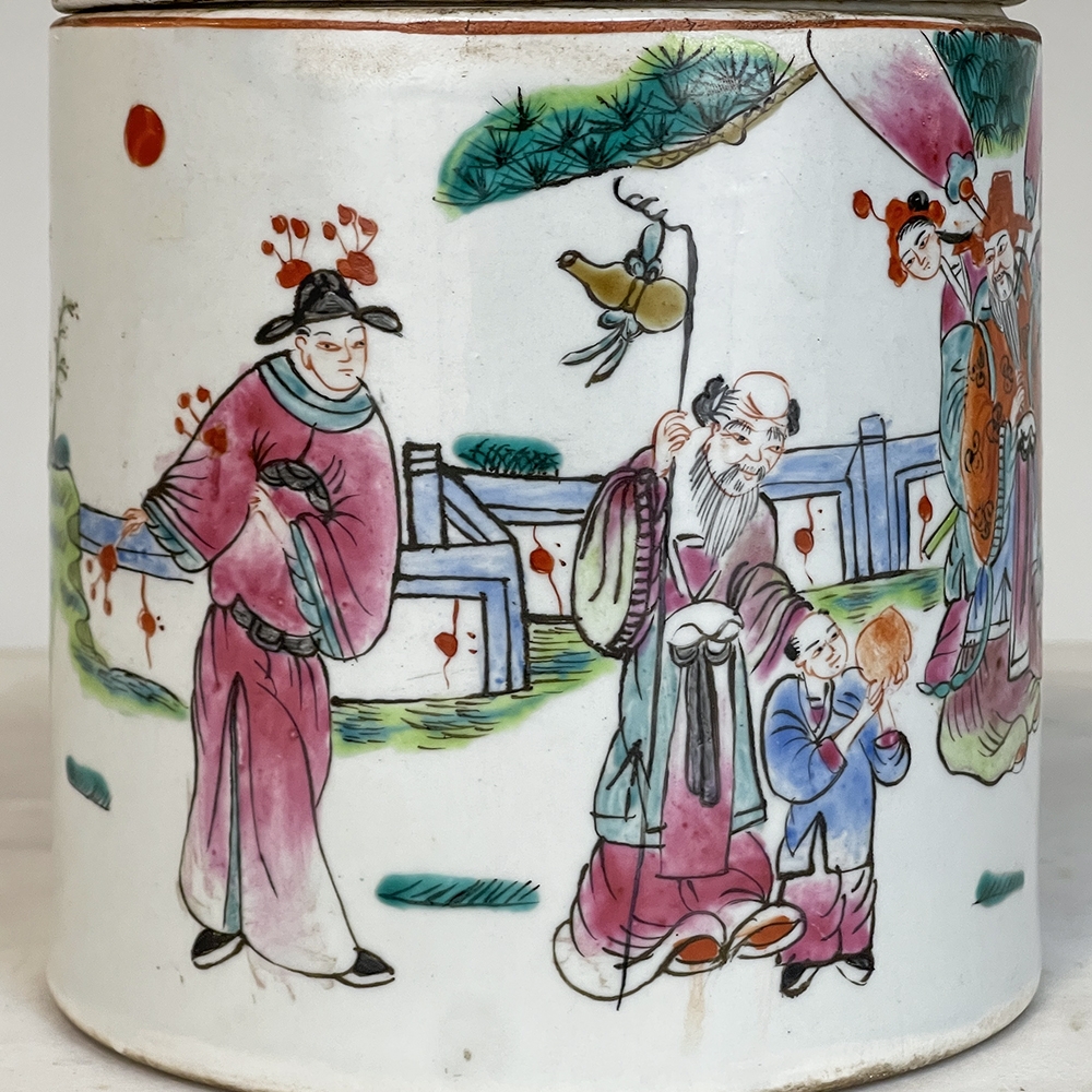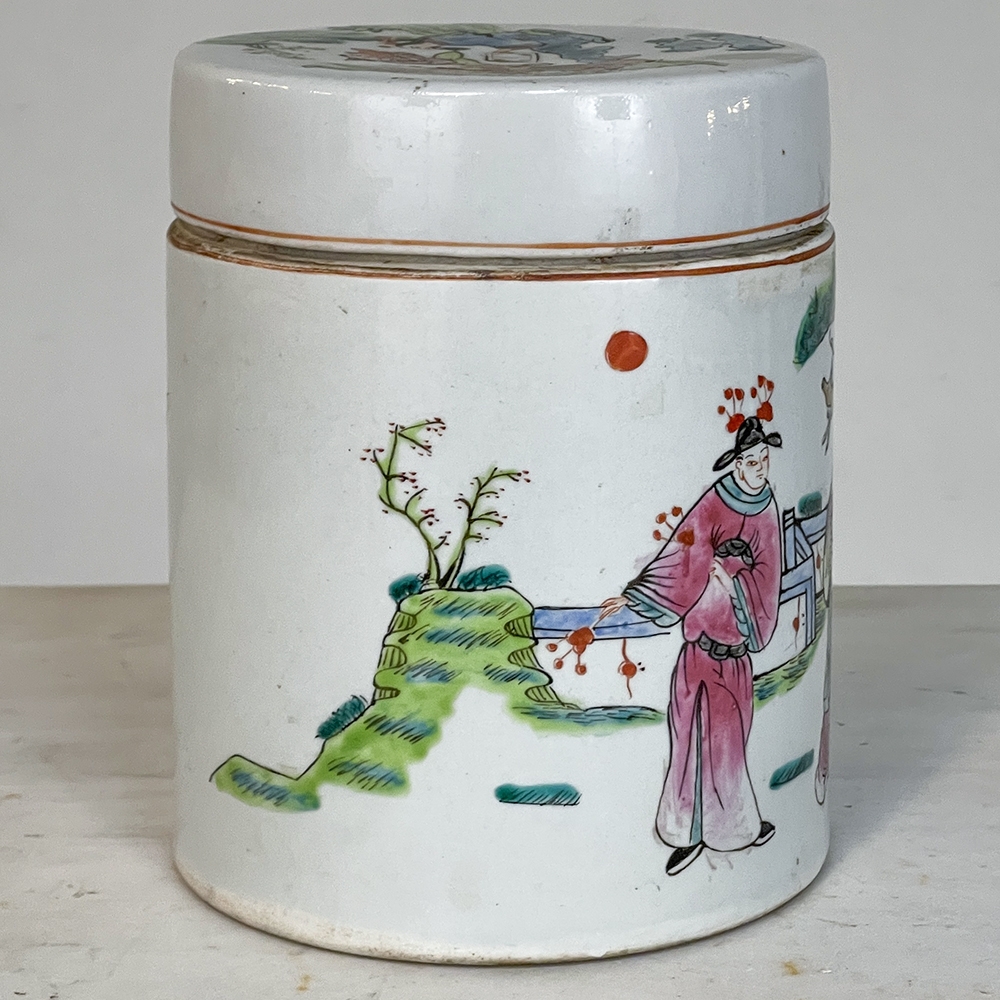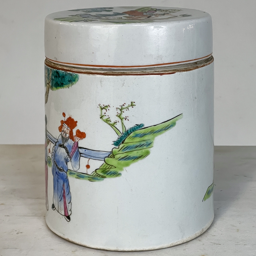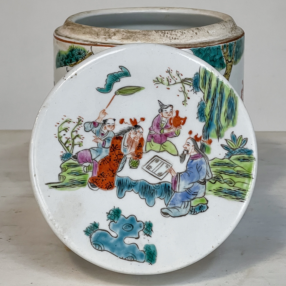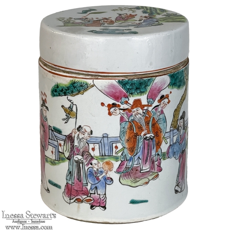 19th Century Oriental Porcelain Lidded Vase was shipped by arduous voyage around the Cape of Good Hope to feed the craze for all things from the Exotic Far East during the 18th & 19th Centuries in Europe. This example of Japanese craftsmanship depicts a formal encounter, depicted in a colorful rendition entirely by hand.