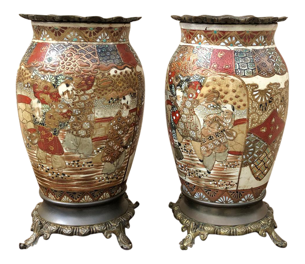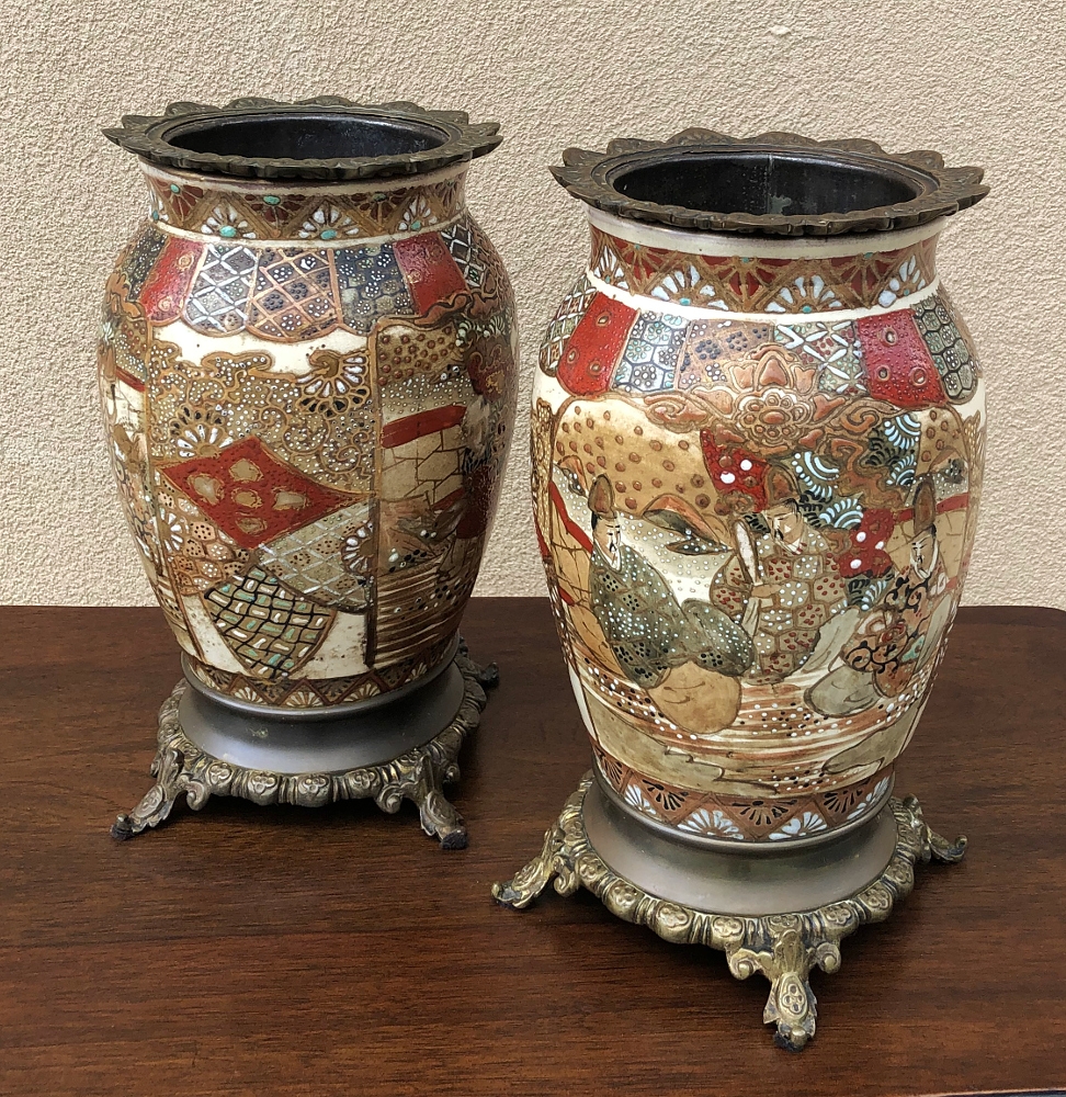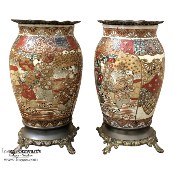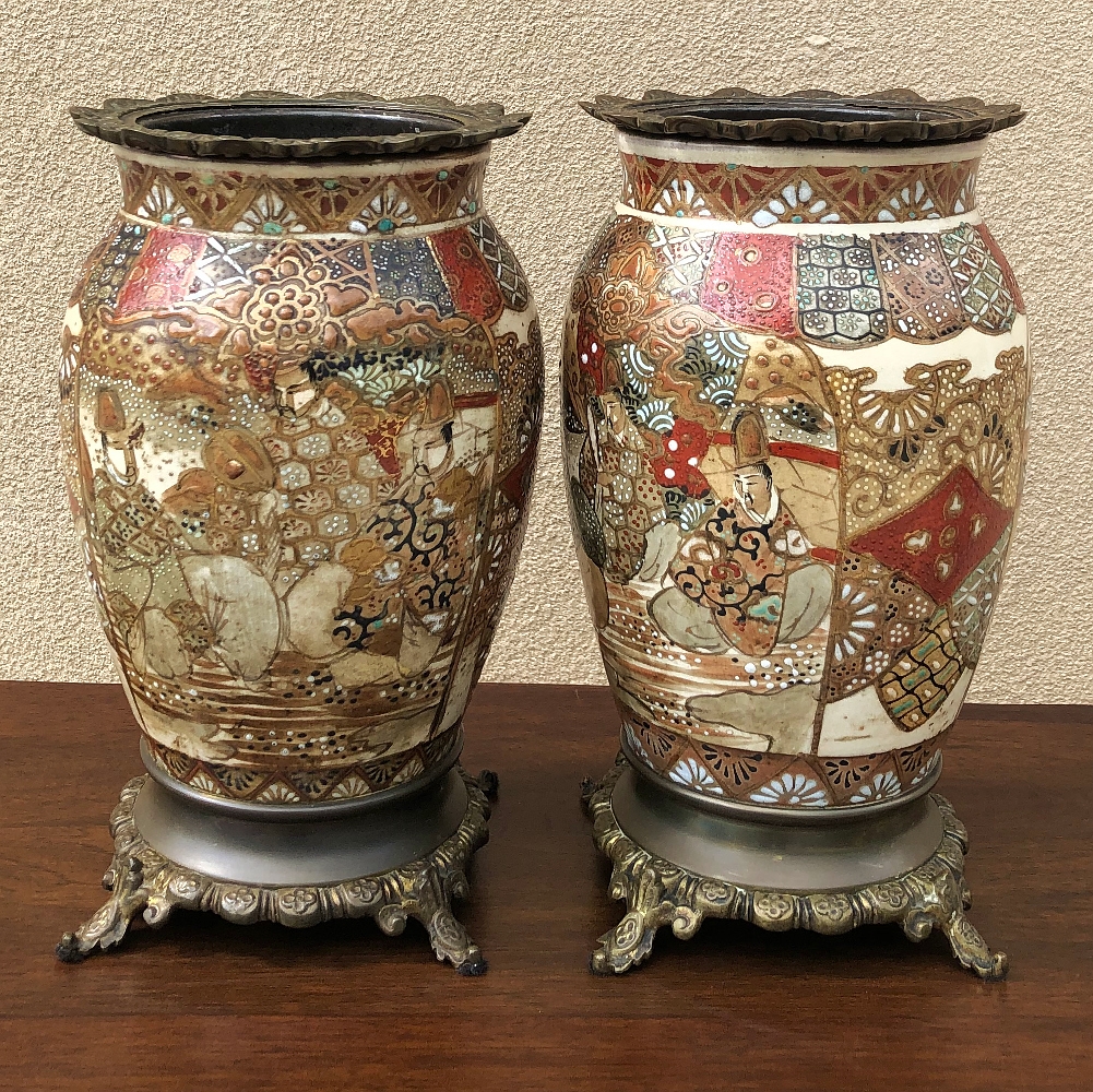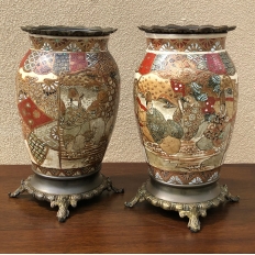 SalePair 19th Century Oriental Satsuma Vases were hand-painted on the finest Japanese porcelain then set on cast bronze bases for the ultimate in Oriental Opulence! An intricate "pie crust" shaped rim was also added to prevent chipping and ensure longevity. The hand-painted scenery extends all around each vase, unlike some that have unpainted back sides. This complete circular treatment was designed to allow the proud owner to rotate the pieces for a slightly different look whenever it struck the owner's whimsy, and also to present a beautiful reflection when the vases were placed in front of a mirror!