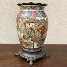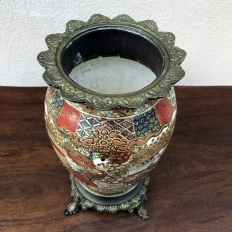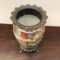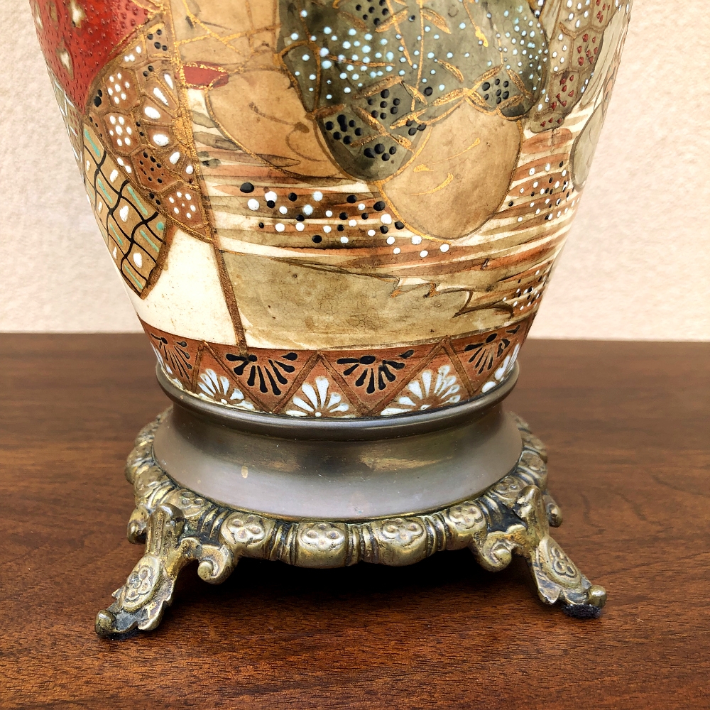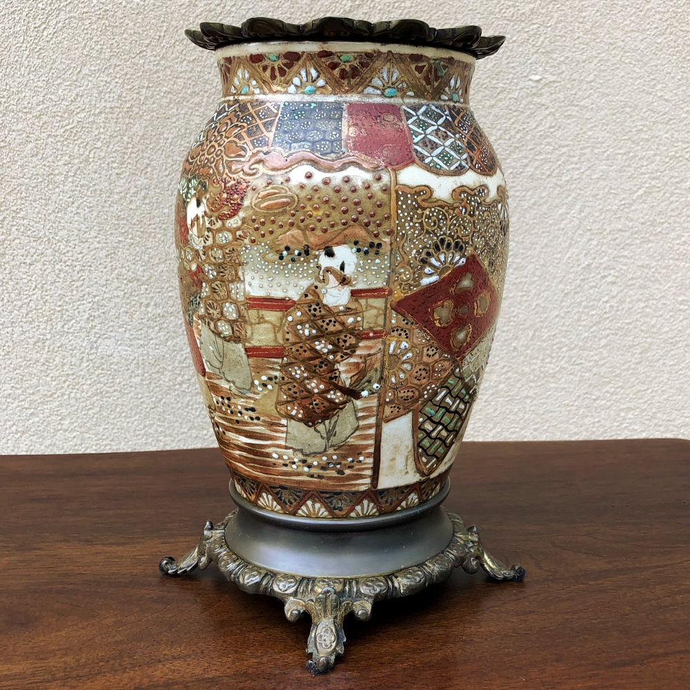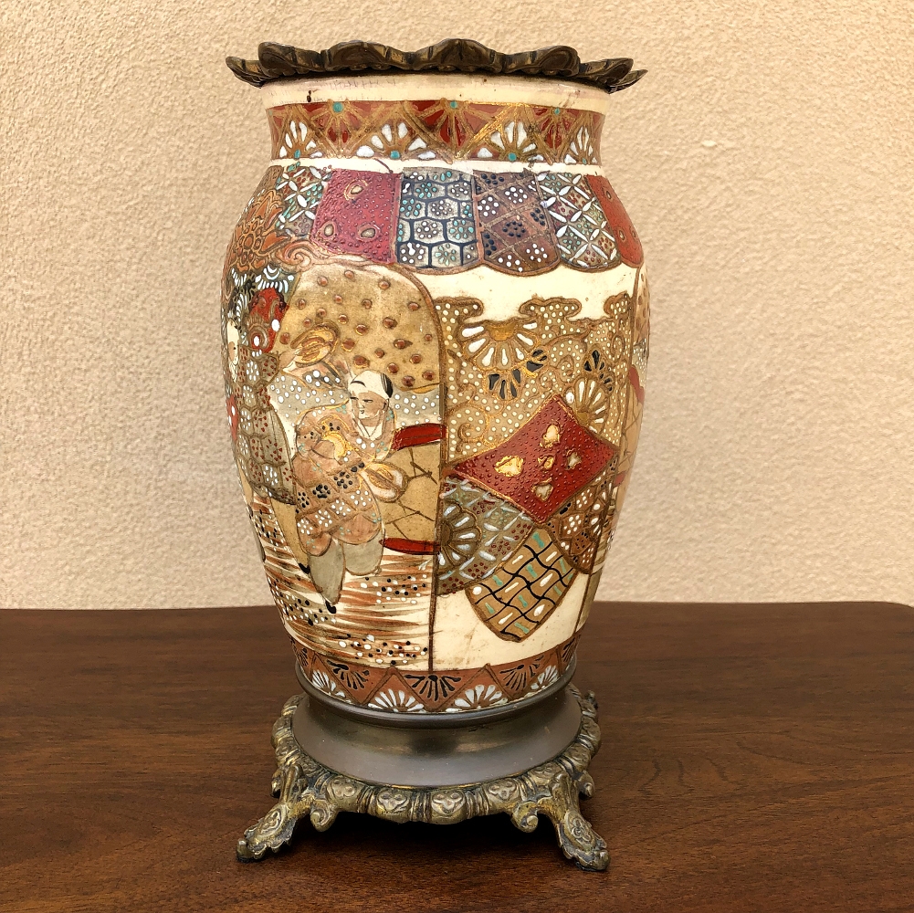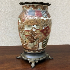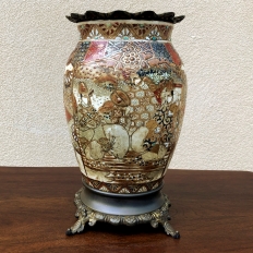 SalePair 19th Century Oriental Satsuma Vases were hand-painted on the finest Japanese porcelain then set on cast bronze bases for the ultimate in Oriental Opulence! An intricate "pie crust" shaped rim was also added to prevent chipping and ensure longevity. The hand-painted scenery extends all around each vase, unlike some that have unpainted back sides. This complete circular treatment was designed to allow the proud owner to rotate the pieces for a slightly different look whenever it struck the owner's whimsy, and also to present a beautiful reflection when the vases were placed in front of a mirror!