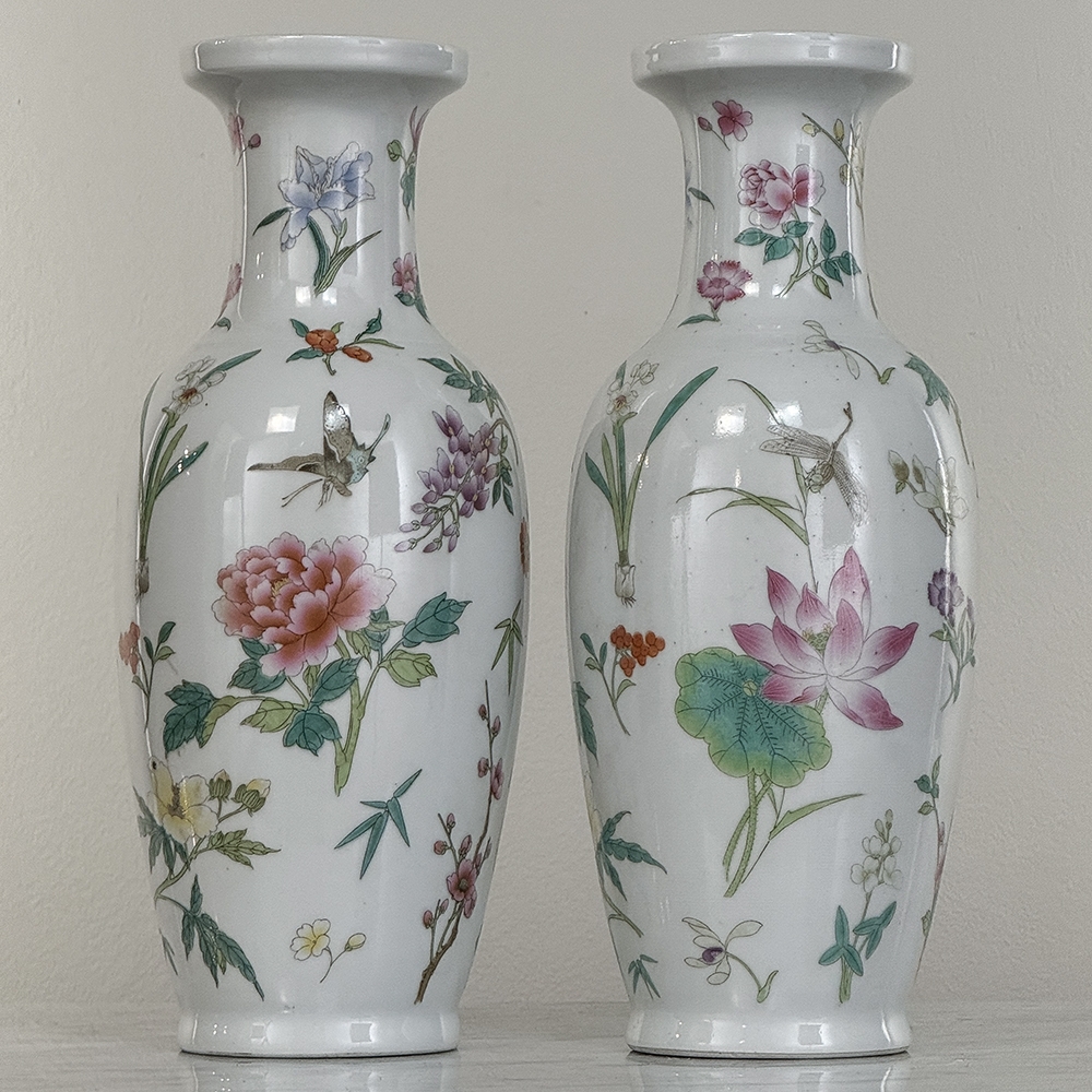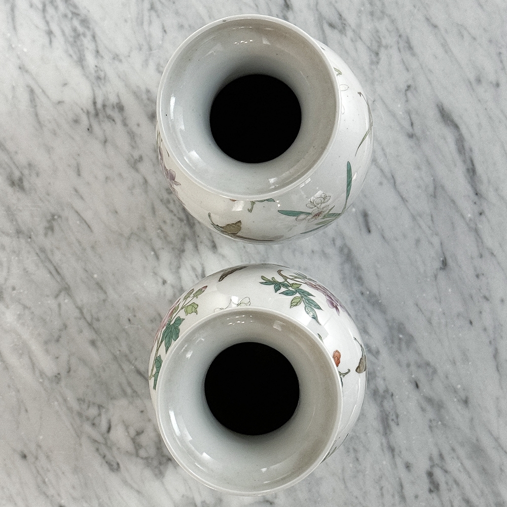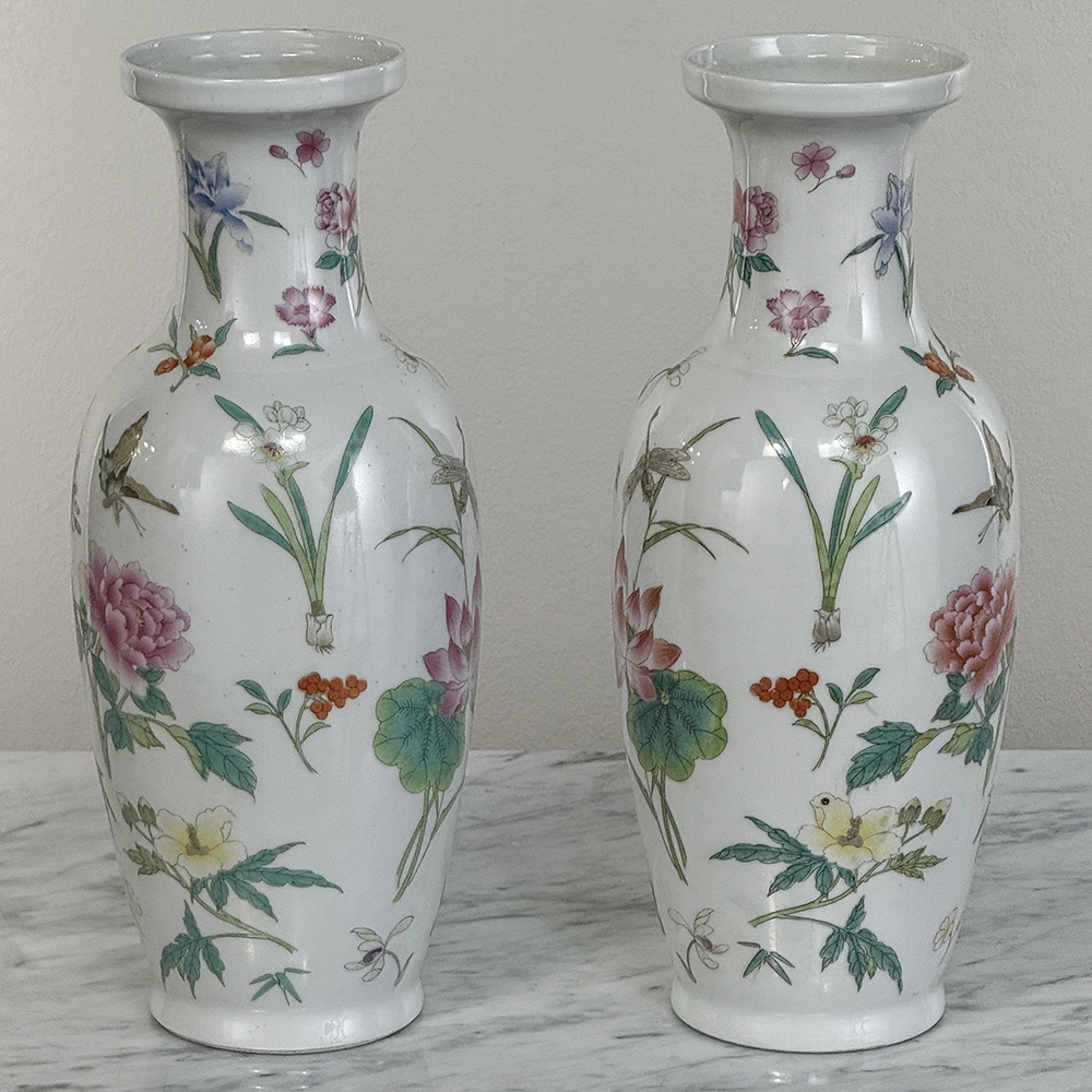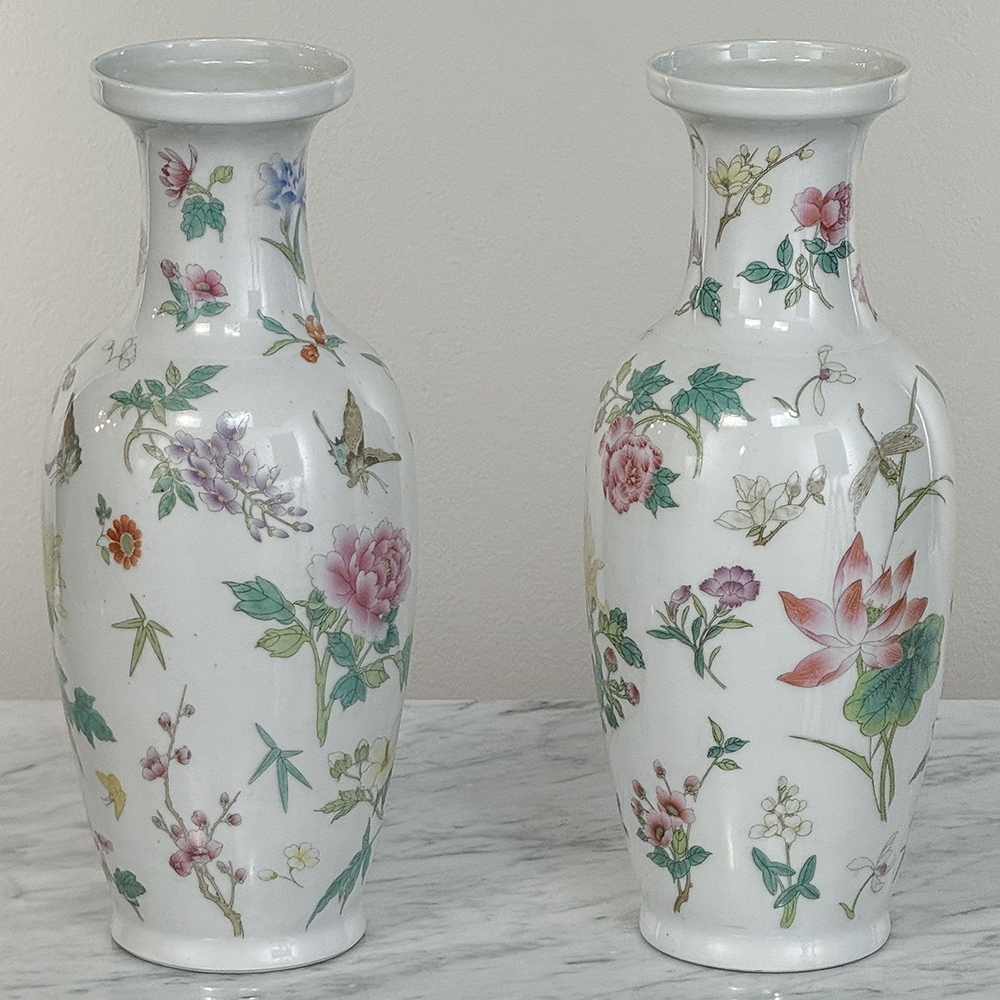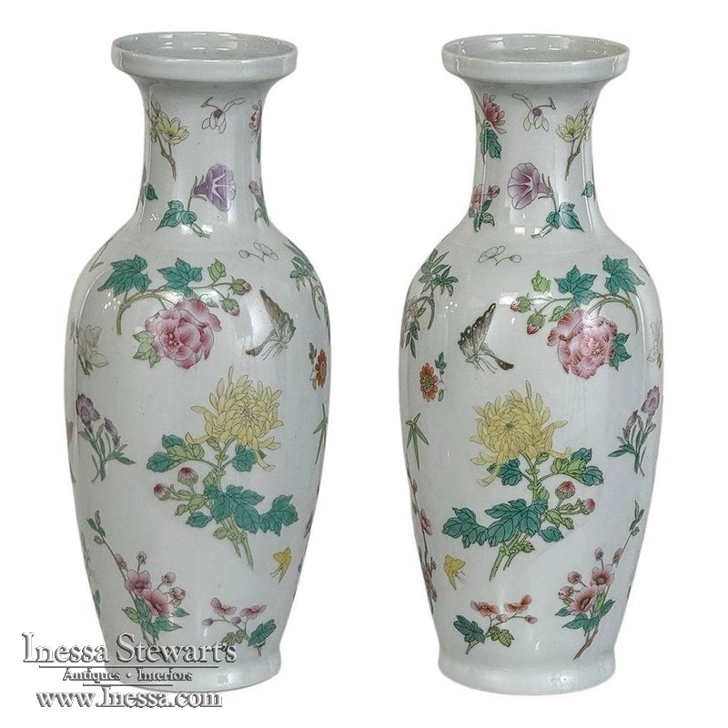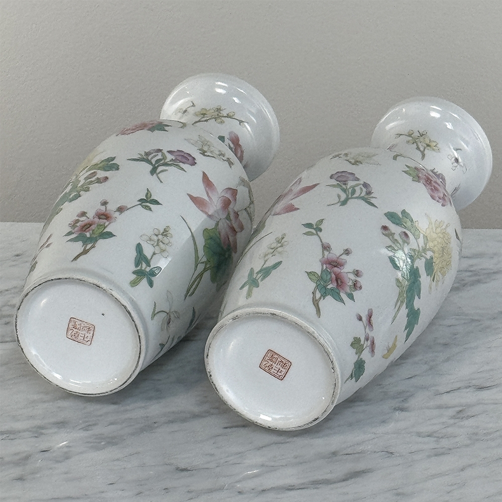 Pair Antique Chinese Hand-Painted Porcelain Bud Vases are brilliantly painted to an amazingly realistic degree of artistry, depicting various species of garden plants and flowers. Perfect for single stems or a small number of stems, they were designed to brighten up the room and provide visual enjoyment year round, even when flowers are not blooming. The diminutive size makes them great accents for cozy spots like mantels, shelves and bookcases, to name a few.