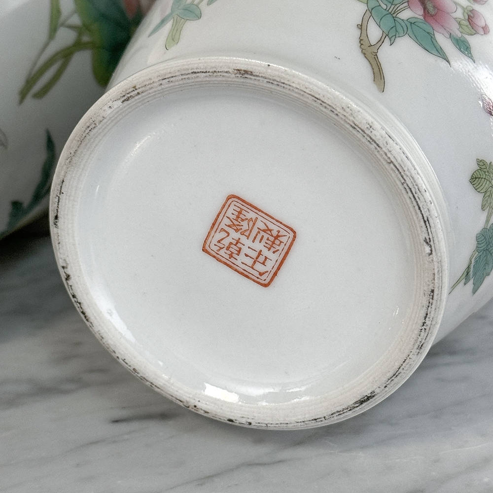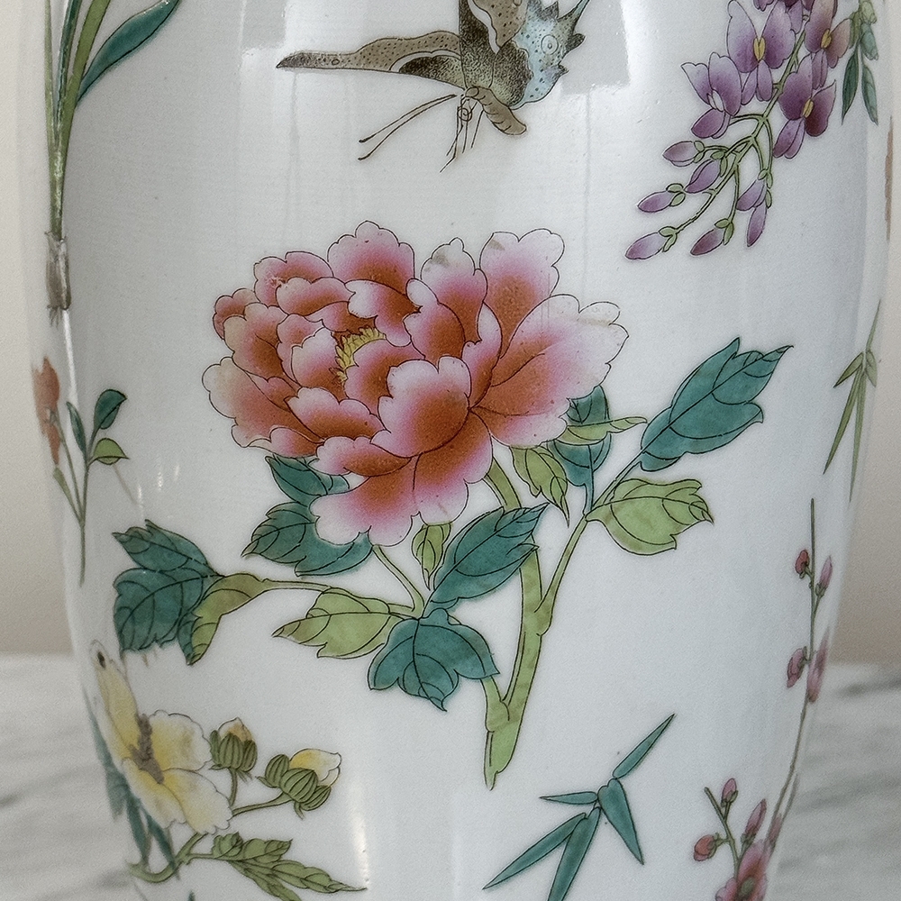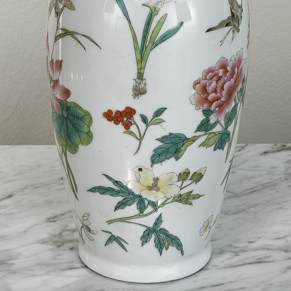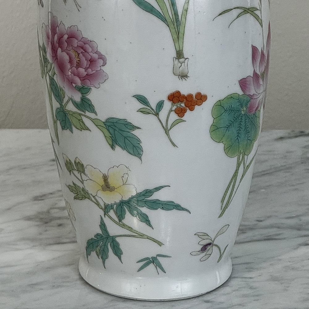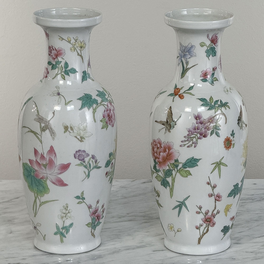 Pair Antique Chinese Hand-Painted Porcelain Bud Vases are brilliantly painted to an amazingly realistic degree of artistry, depicting various species of garden plants and flowers. Perfect for single stems or a small number of stems, they were designed to brighten up the room and provide visual enjoyment year round, even when flowers are not blooming. The diminutive size makes them great accents for cozy spots like mantels, shelves and bookcases, to name a few.