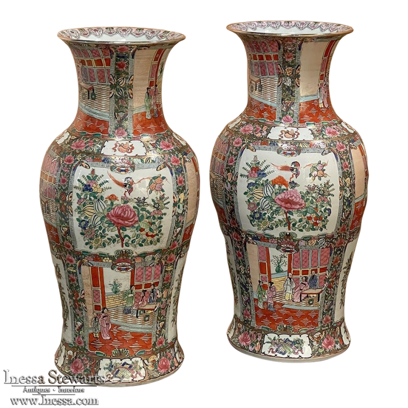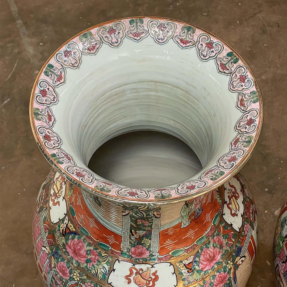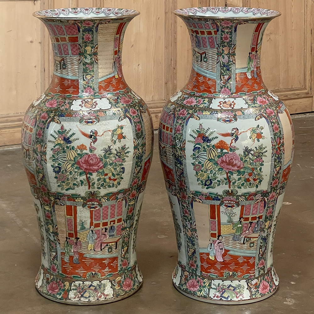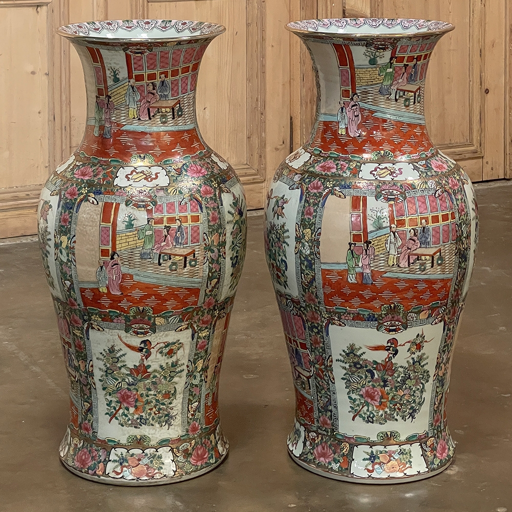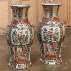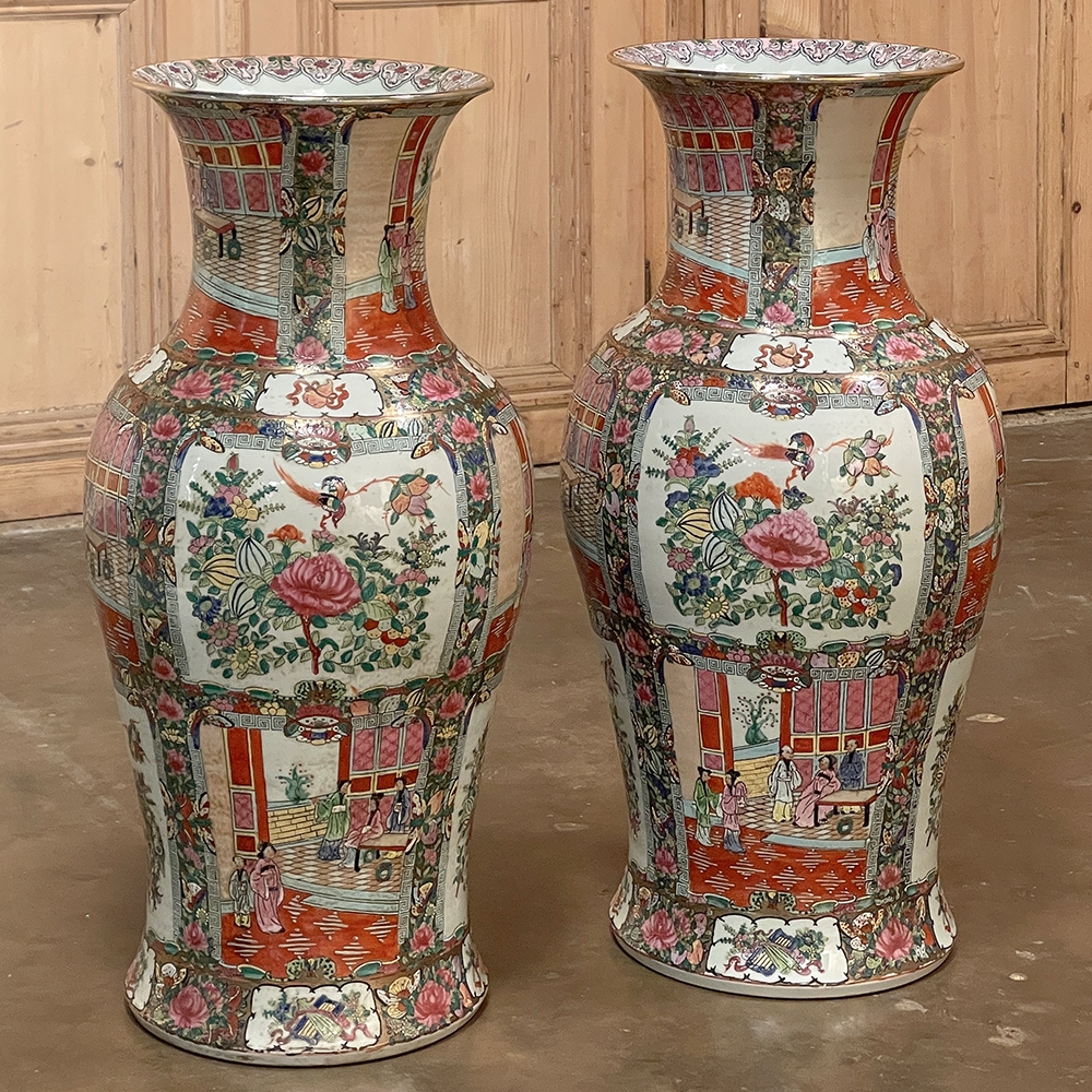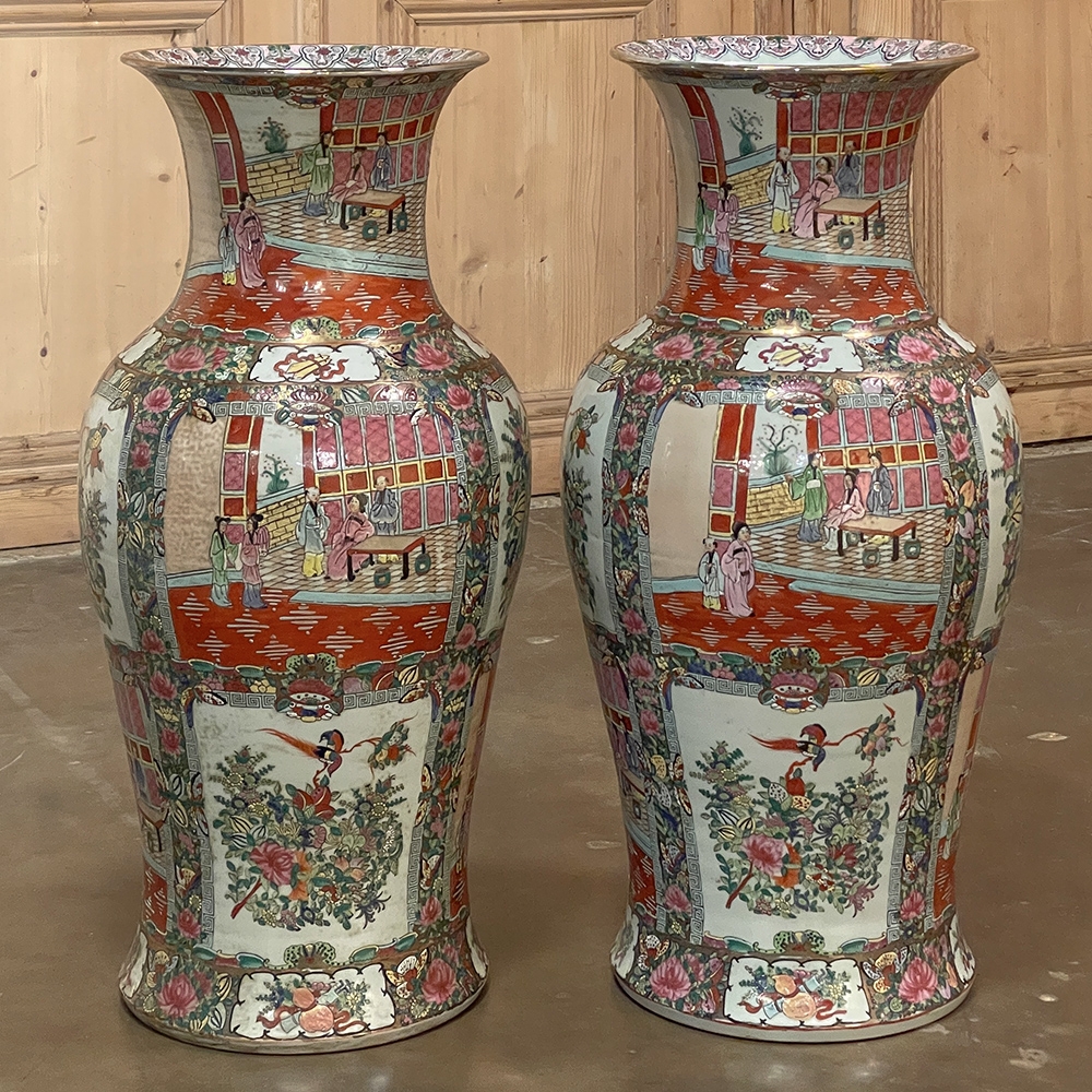 Pair Antique Chinese Hand-Painted Vases are truly a product of exceptionally skilled artisans! Thrown on a larger scale, the graceful form of each porcelain urn is centuries if not thousands of years old. Starting on the inside of the rim at the top, the entire facade has been painted all around, depicting various courtyard scenes mixed with beautiful portrayals of birds and flowers, with distinctive bordering creating a lavish framework, all the way down to the rim of the base. Ideal for placement in front of mirrors due to their complete artistic coverage, they can also be periodically rotated when not in front of a mirror, so that a different scene presents itself to the room each time. The rich natural earth tones were derived from natural materials, and thanks to the time-tested glazing techniques the coloration hasn't faded in a hundred years!