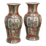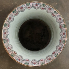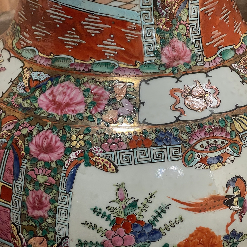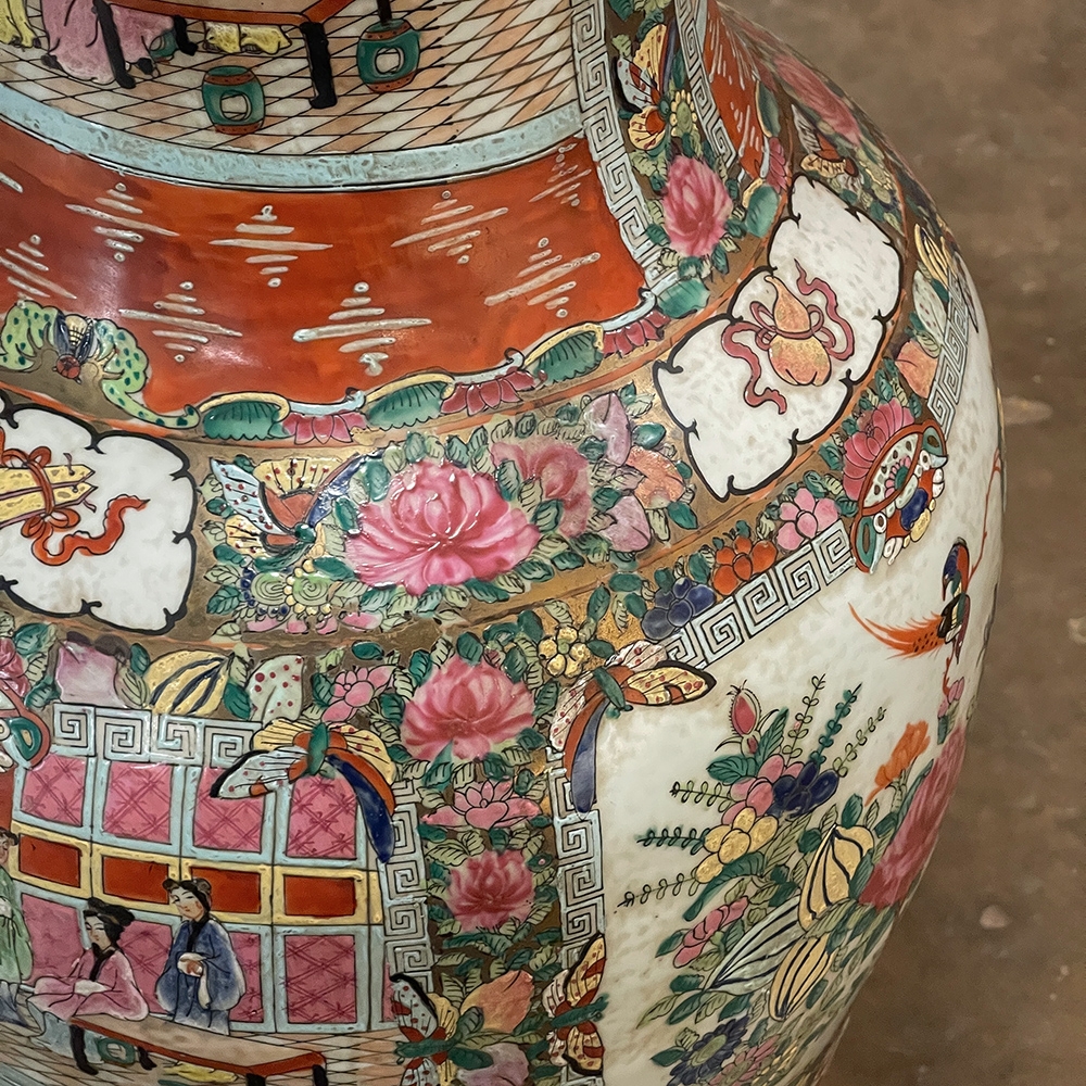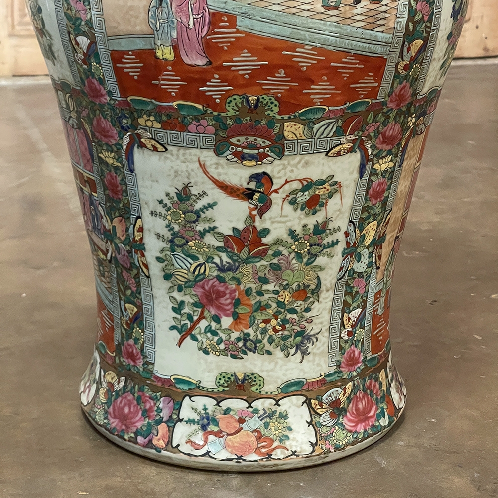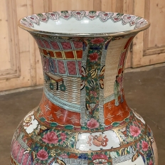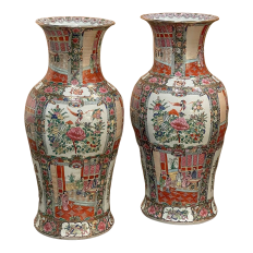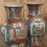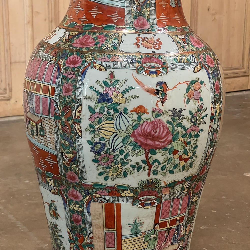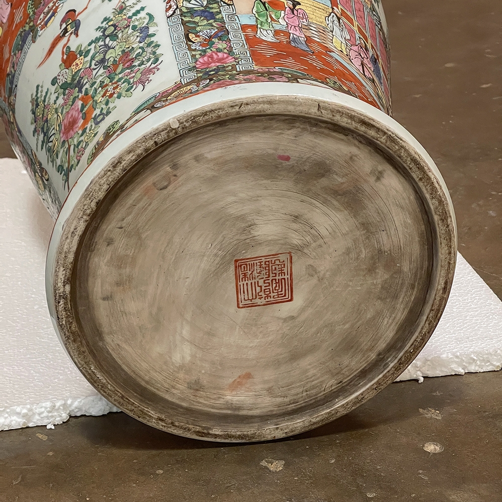 Pair Antique Chinese Hand-Painted Vases are truly a product of exceptionally skilled artisans! Thrown on a larger scale, the graceful form of each porcelain urn is centuries if not thousands of years old. Starting on the inside of the rim at the top, the entire facade has been painted all around, depicting various courtyard scenes mixed with beautiful portrayals of birds and flowers, with distinctive bordering creating a lavish framework, all the way down to the rim of the base. Ideal for placement in front of mirrors due to their complete artistic coverage, they can also be periodically rotated when not in front of a mirror, so that a different scene presents itself to the room each time. The rich natural earth tones were derived from natural materials, and thanks to the time-tested glazing techniques the coloration hasn't faded in a hundred years!