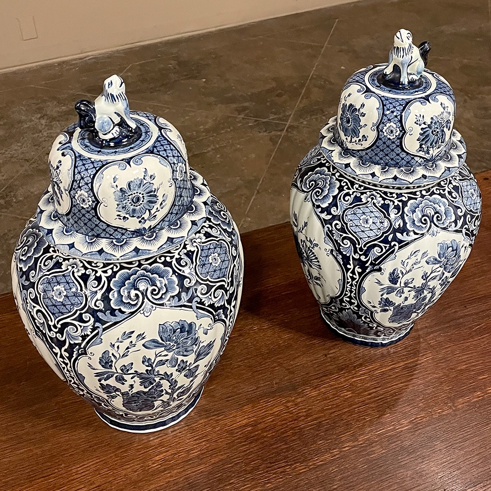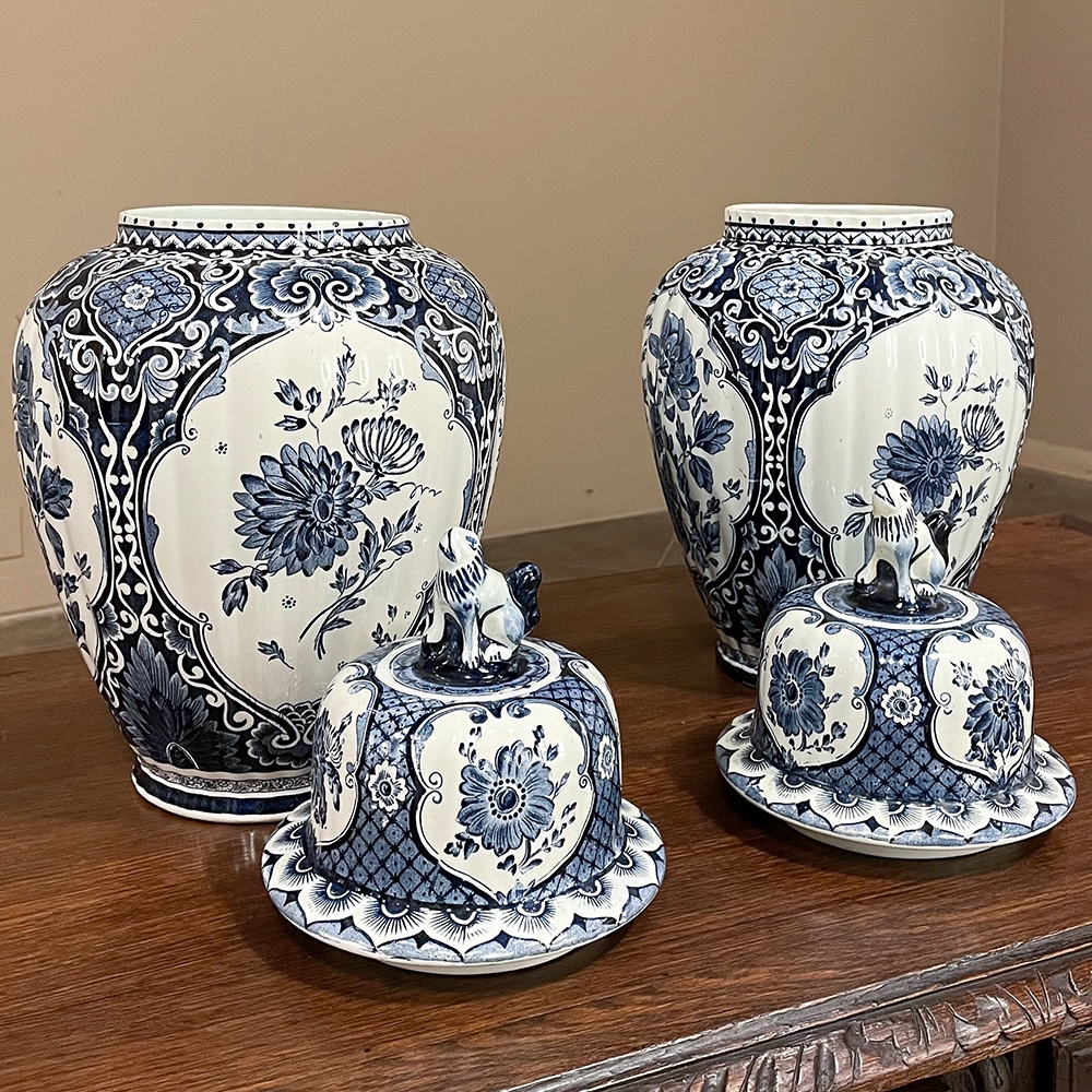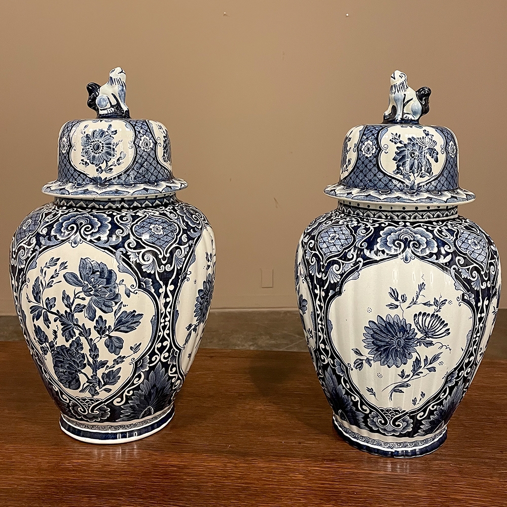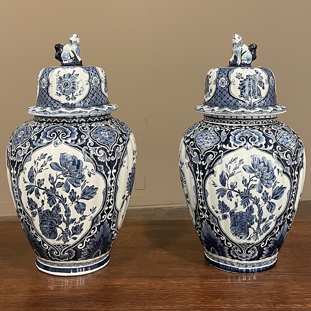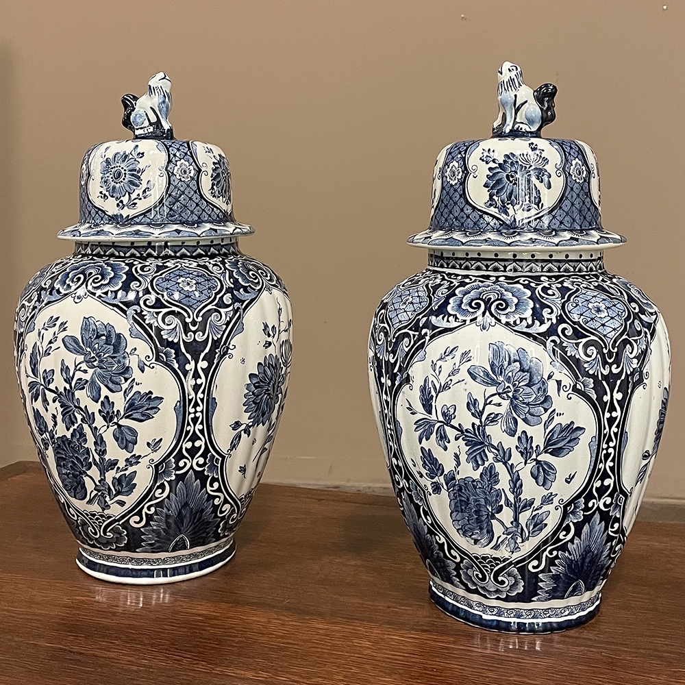 Pair Antique Delft Lidded Urns by Boch of Belgium are a splendid example of fine ceramic porcelains from the region that encompassed northern France, Luxembourg, Belgium, and Holland. The storied company was founded by Francois Boch in 1748 and evolved through many permutations over the decades, witnessing the revolution in Belgium, the rise and fall of monarchs, and two world wars. Changing its factory locations over the years in the aforementioned countries, its quality and desirability was maintained making it so collectible today. This pattern, created for the Royal Sphinx in The Netherlands has all the intricacies of transferware, but was hand-painted in rich cobalt blue, and features a classic traditional pattern including a variety of flowers, backgrounds and bordering. A charming foo dog motif atop the lid completes the look.