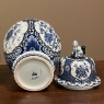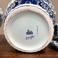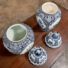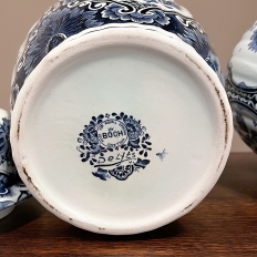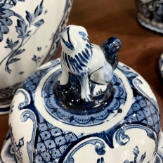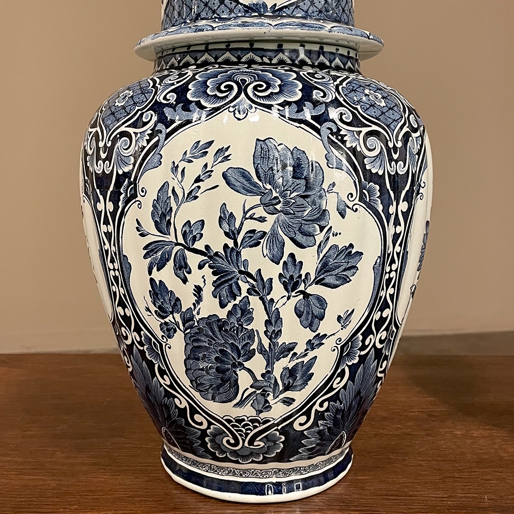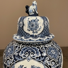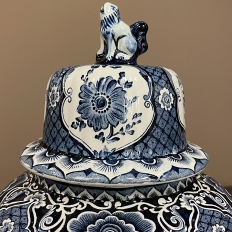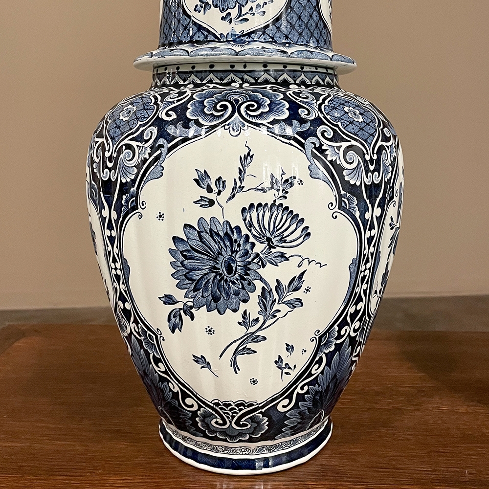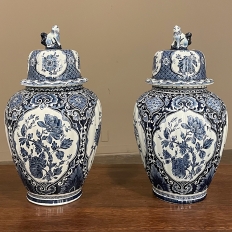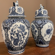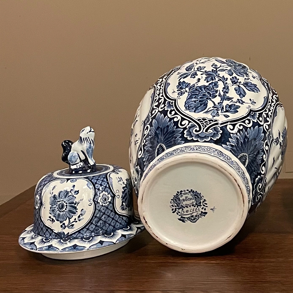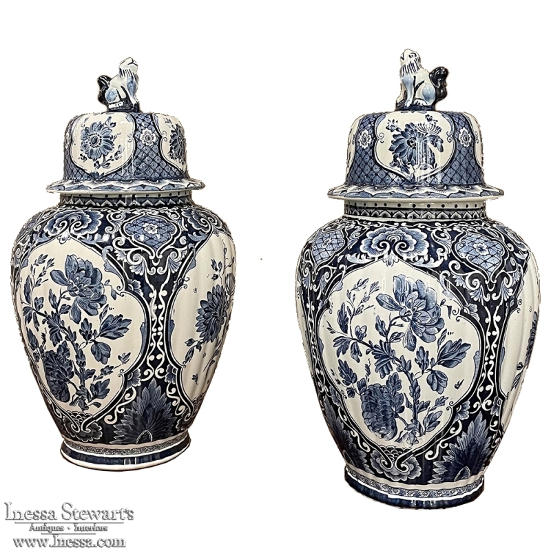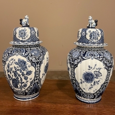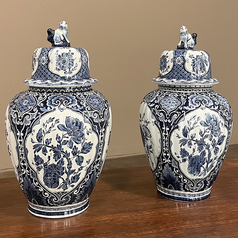 Pair Antique Delft Lidded Urns by Boch of Belgium are a splendid example of fine ceramic porcelains from the region that encompassed northern France, Luxembourg, Belgium, and Holland. The storied company was founded by Francois Boch in 1748 and evolved through many permutations over the decades, witnessing the revolution in Belgium, the rise and fall of monarchs, and two world wars. Changing its factory locations over the years in the aforementioned countries, its quality and desirability was maintained making it so collectible today. This pattern, created for the Royal Sphinx in The Netherlands has all the intricacies of transferware, but was hand-painted in rich cobalt blue, and features a classic traditional pattern including a variety of flowers, backgrounds and bordering. A charming foo dog motif atop the lid completes the look.
