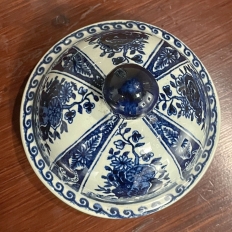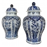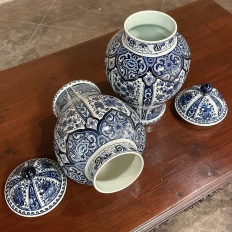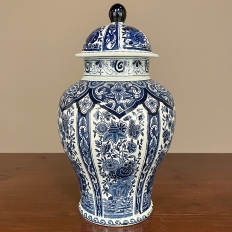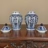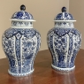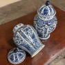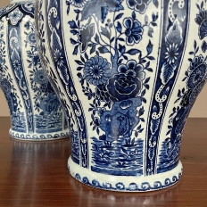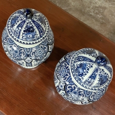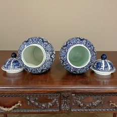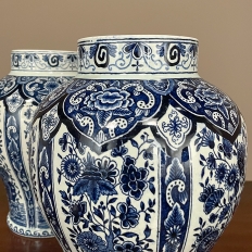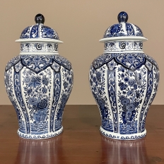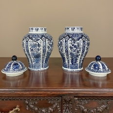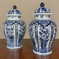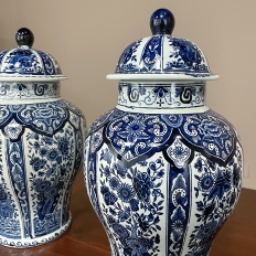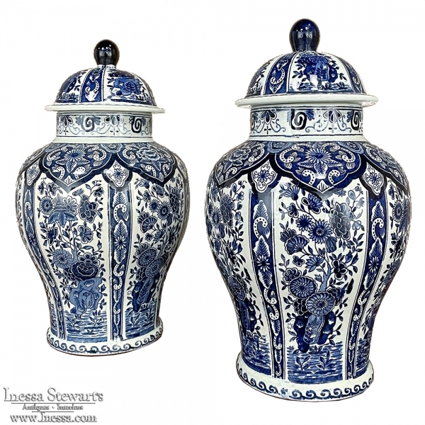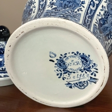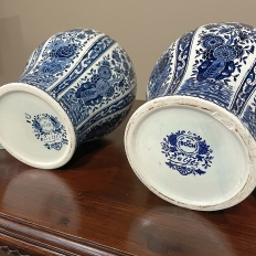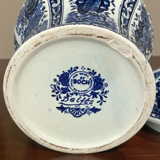 Pair Antique Delft Lidded Urns by Boch of Holland are a splendid example of fine ceramic porcelains from the region that encompassed northern France, Luxembourg, Belgium, and Holland. The storied company was founded by Francois Boch in 1748 and evolved through many permutations over the decades, witnessing the revolution in Belgium, the rise and fall of monarchs, and two world wars. Changing its factory locations over the years in the aforementioned countries, its quality and desirability was maintained making it so collectible today. This pattern, created for the Royal Sphinx in The Netherlands has all the intricacies of transferware, but was hand-painted in rich cobalt blue, and features a classic traditional pattern including a variety of flowers, backgrounds and bordering. A charming foo dog motif atop the lid completes the look.