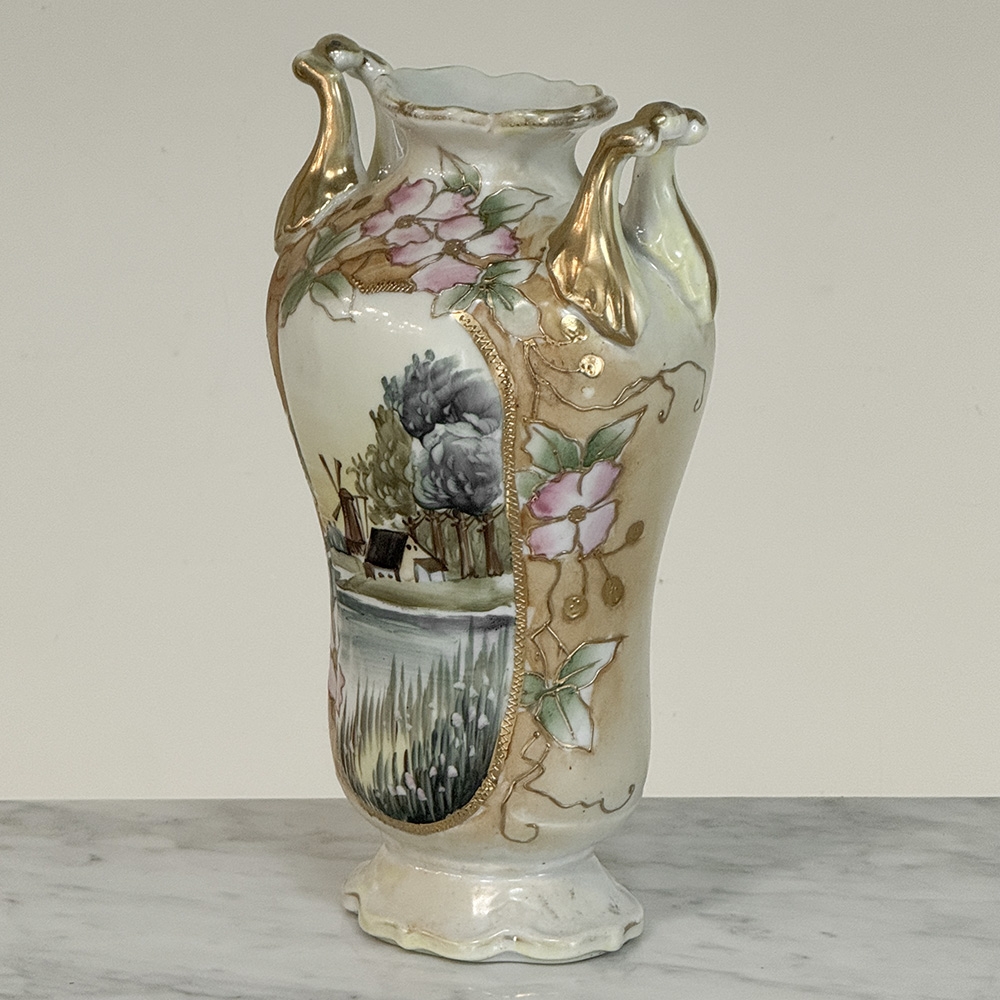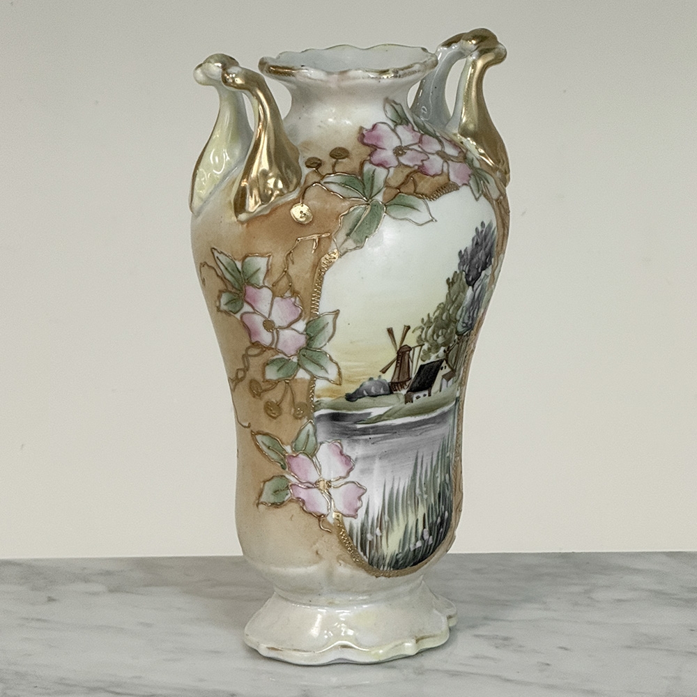 Vintage Nippon Hand-Painted Vase with Cherry Blossoms and a waterside landscape of The Netherlands in cameo will make a vivid, colorful addition to any surface, and can hold fresh blossoms of your own selection as well! Well preserved with gold highlights, such pieces have been made for the European market for centuries.