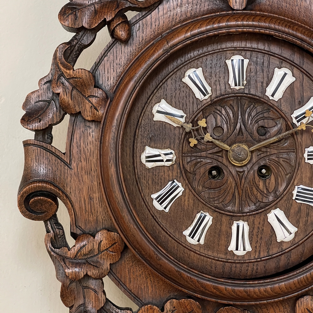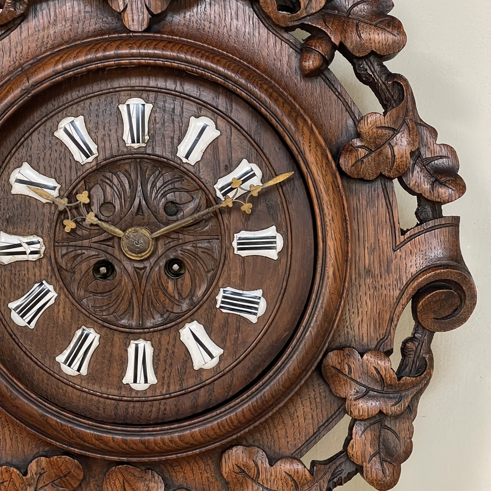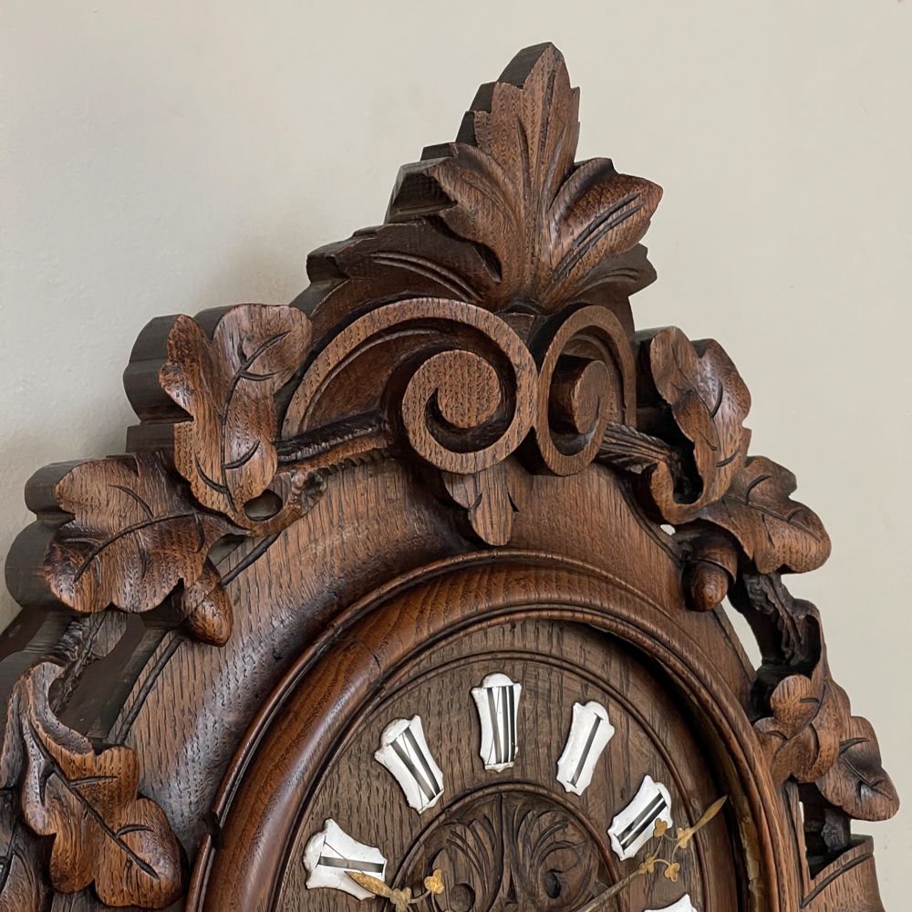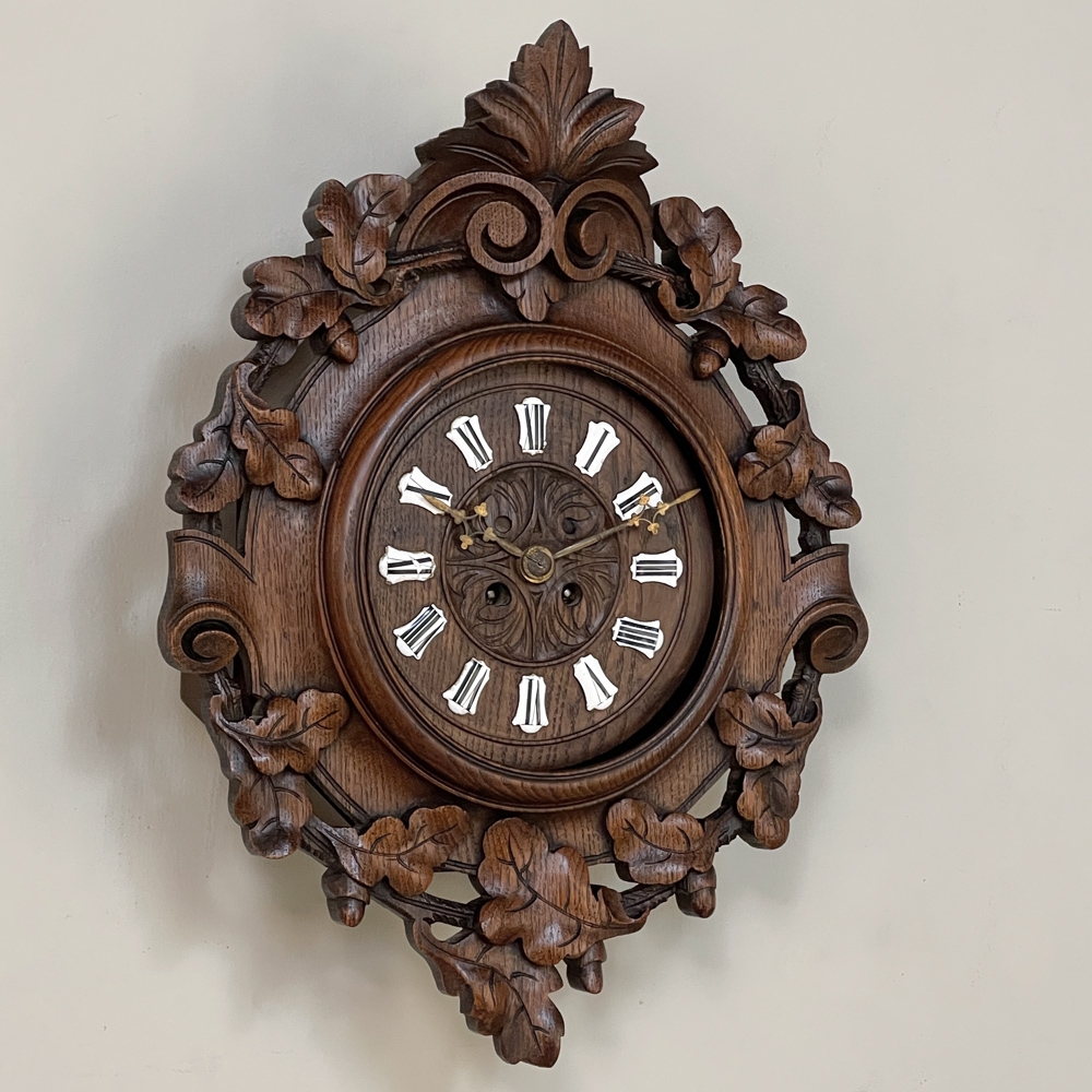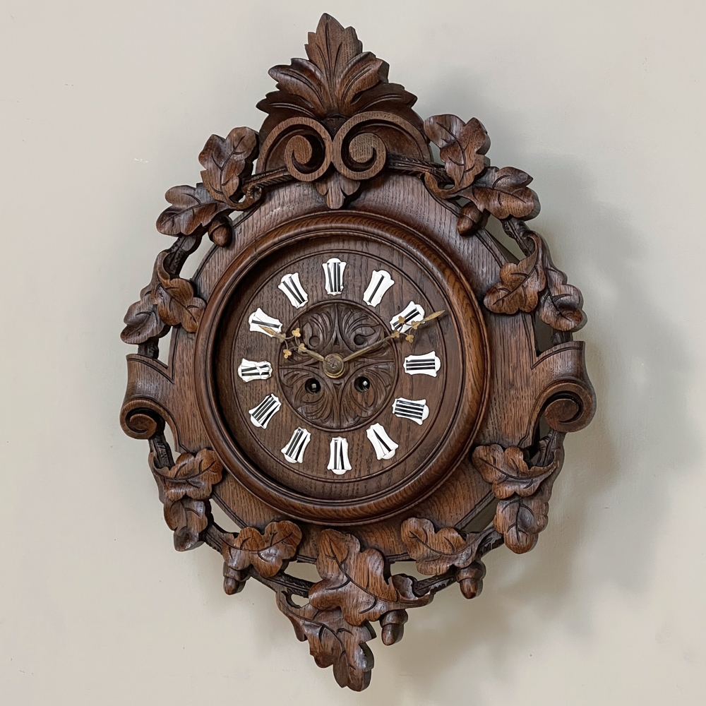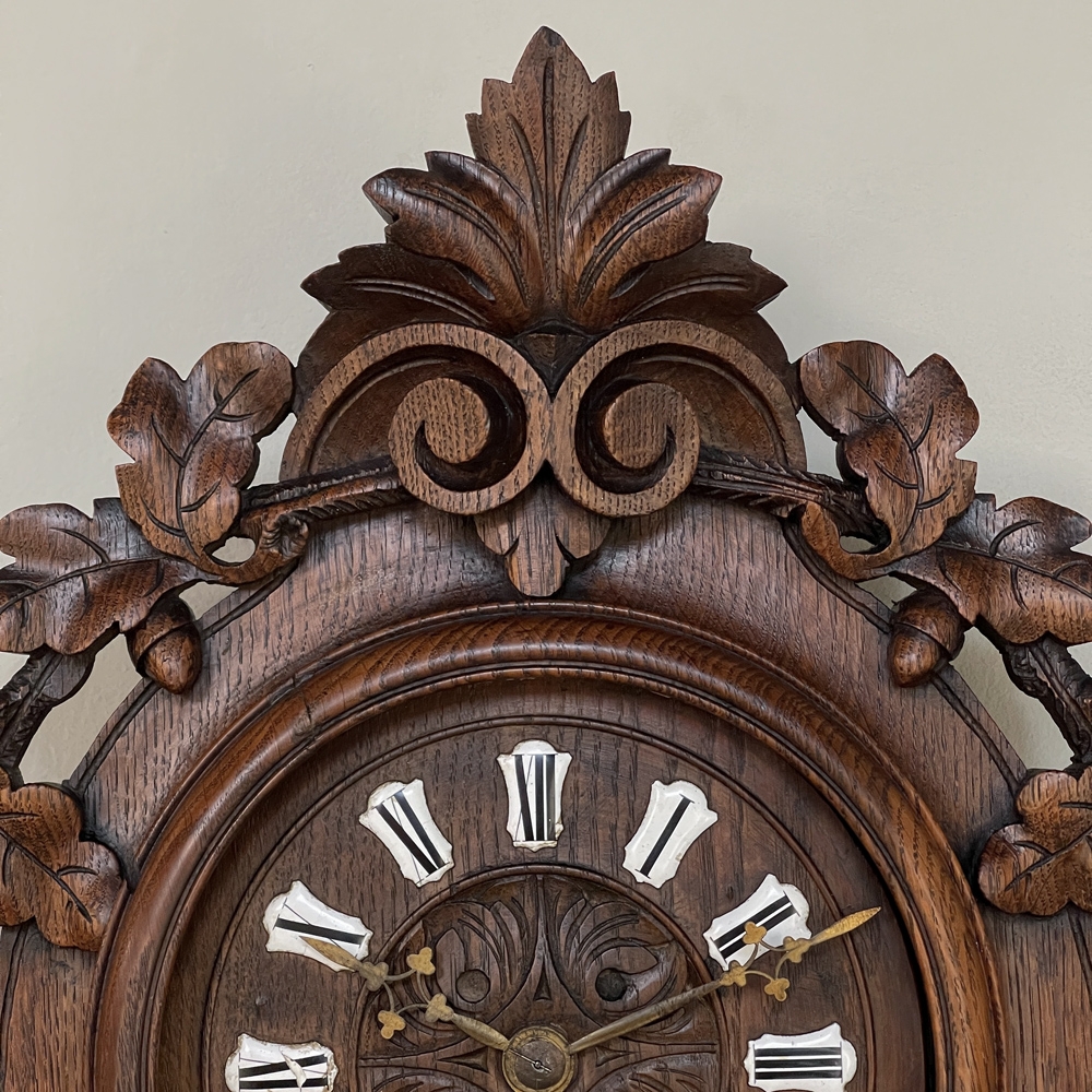 New SaleThe splendor of the Renaissance has been captured in hand carved solid oak with this 19th Century Antique Wall Clock! Artistically a celebration nature, it features carved oak leaves and acorns on both sides and an acanthus plume on the scrolled crown. Acanthus sculpted detail covers the works, which are surrounded by inset hand-painted porcelain Roman numerals. The entire face hinges up to access the pendulum for restarts when one forgets to wind it. Original brass hands with trefoil motifs add the perfect finishing touch.