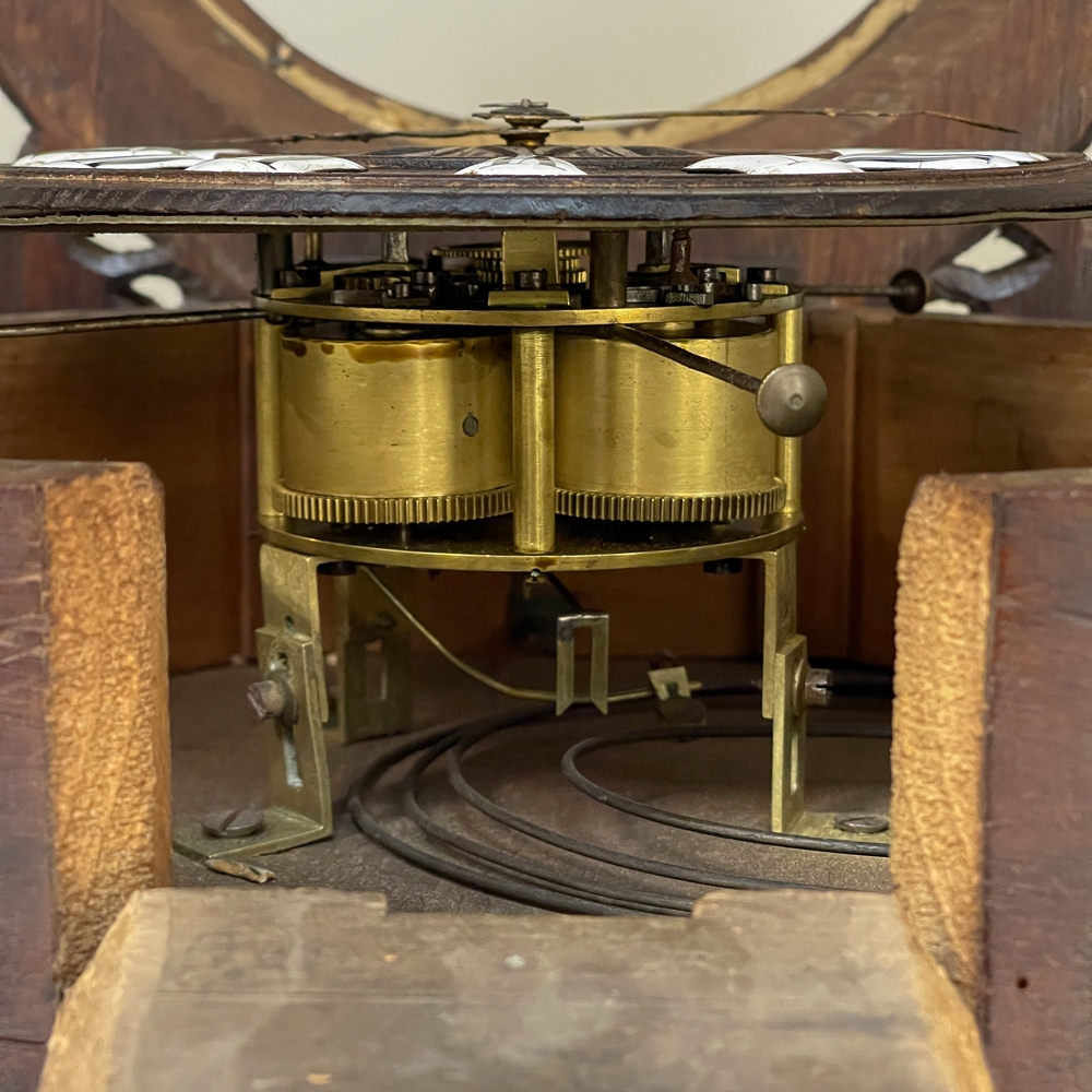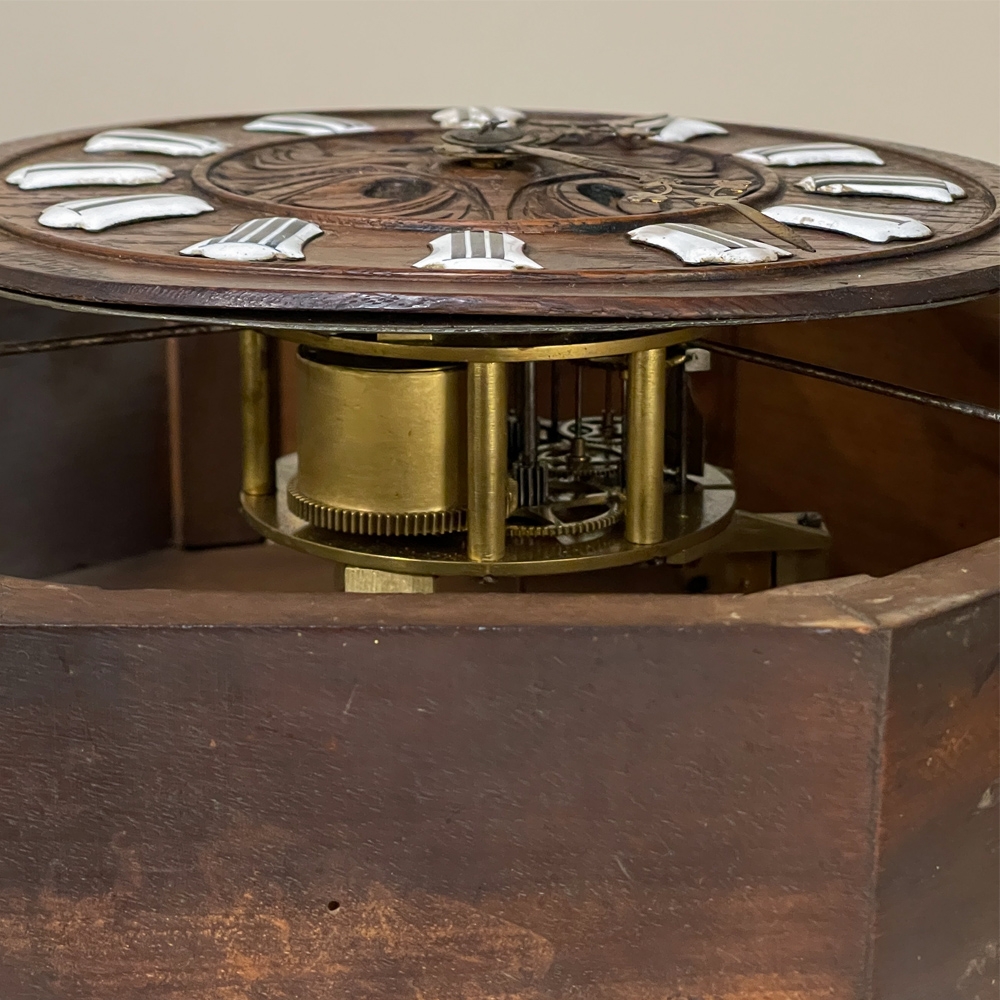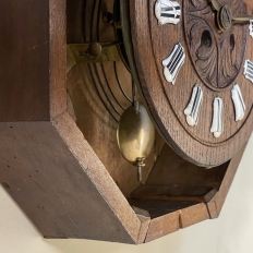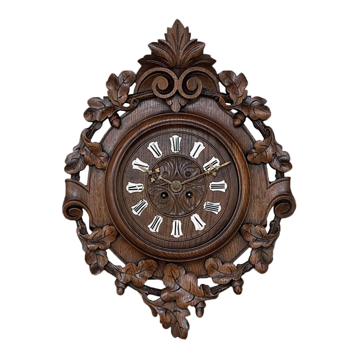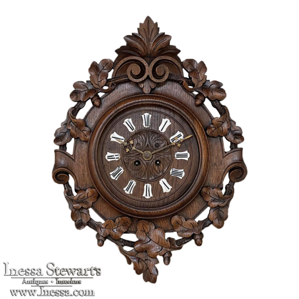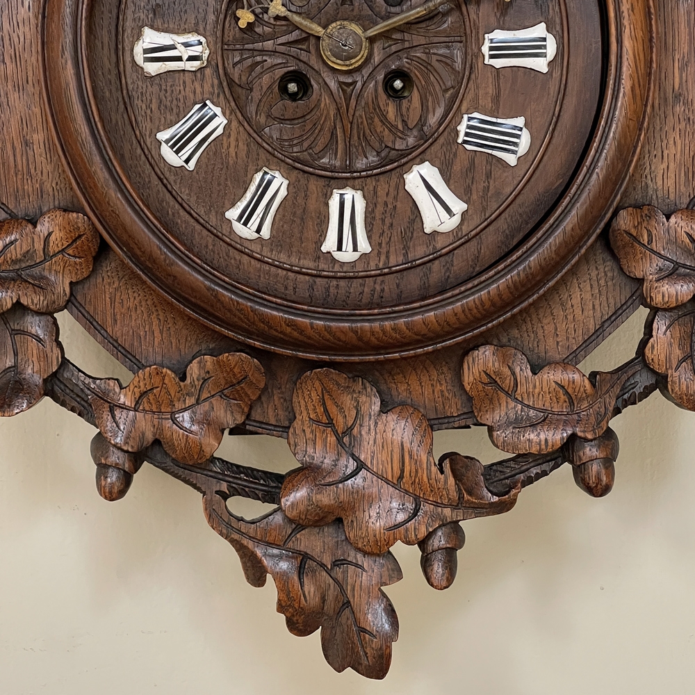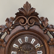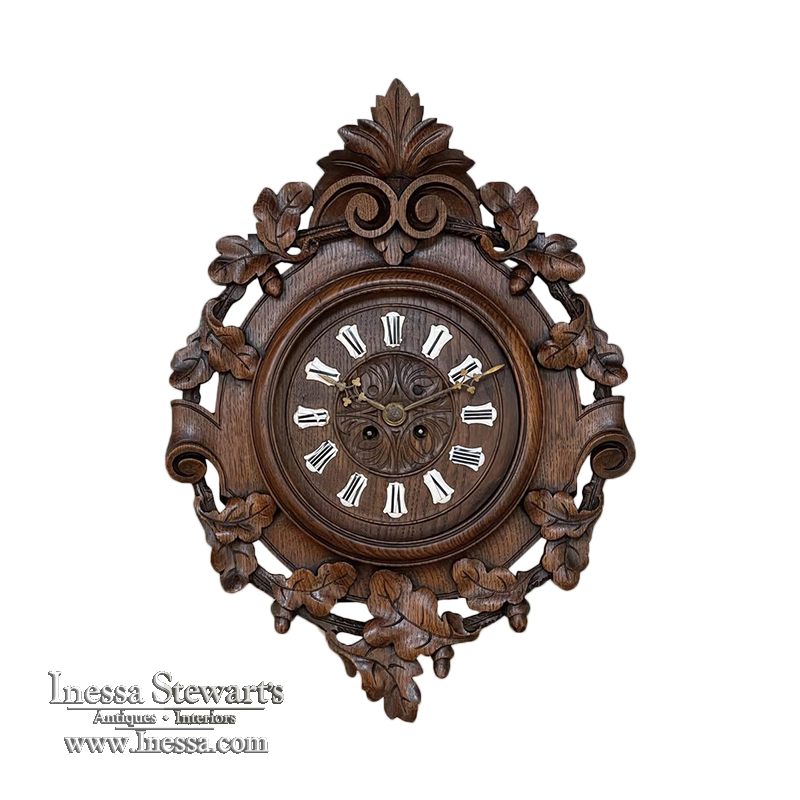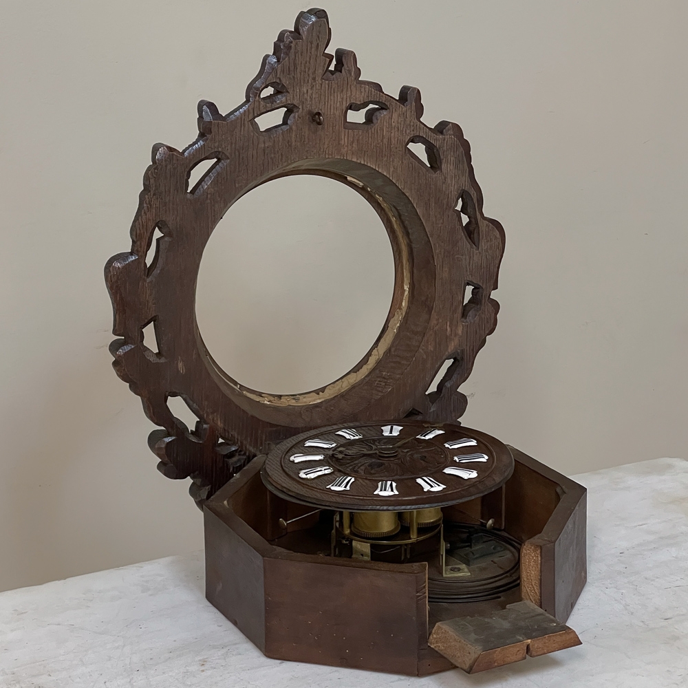 New SaleThe splendor of the Renaissance has been captured in hand carved solid oak with this 19th Century Antique Wall Clock! Artistically a celebration nature, it features carved oak leaves and acorns on both sides and an acanthus plume on the scrolled crown. Acanthus sculpted detail covers the works, which are surrounded by inset hand-painted porcelain Roman numerals. The entire face hinges up to access the pendulum for restarts when one forgets to wind it. Original brass hands with trefoil motifs add the perfect finishing touch.