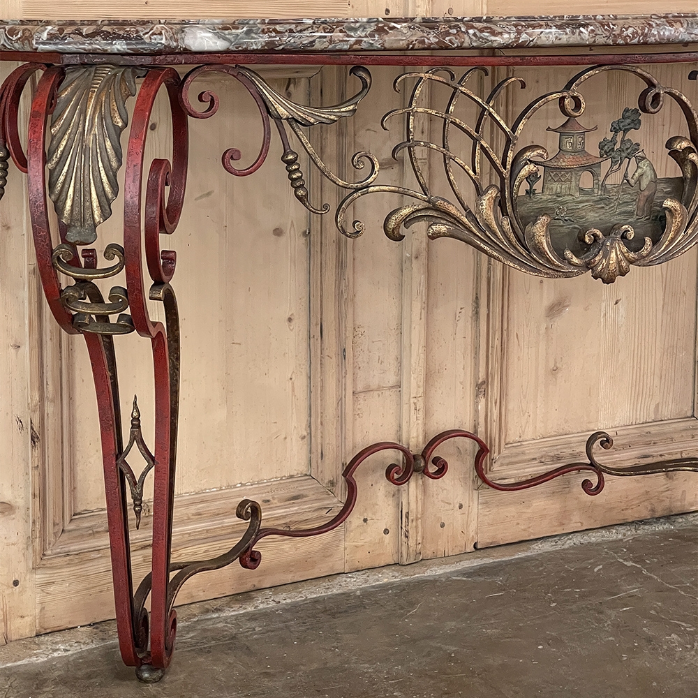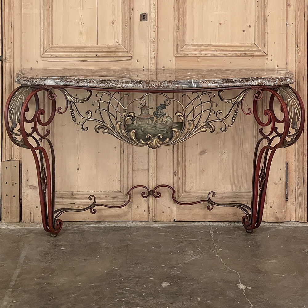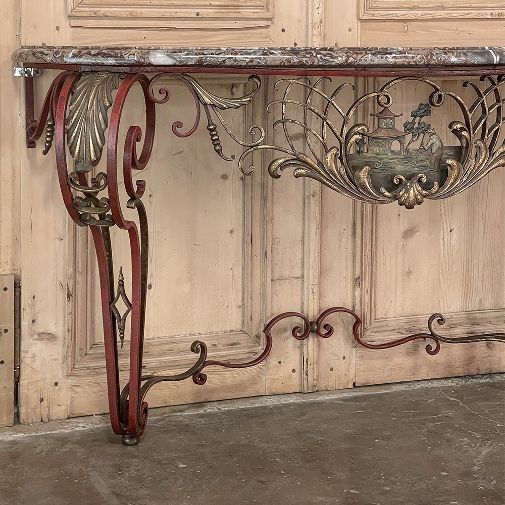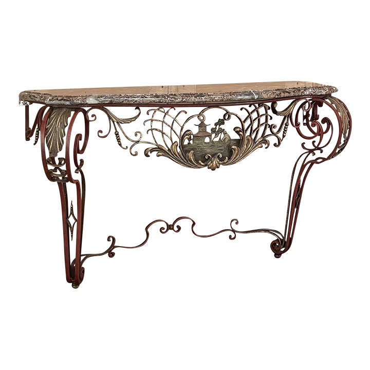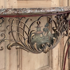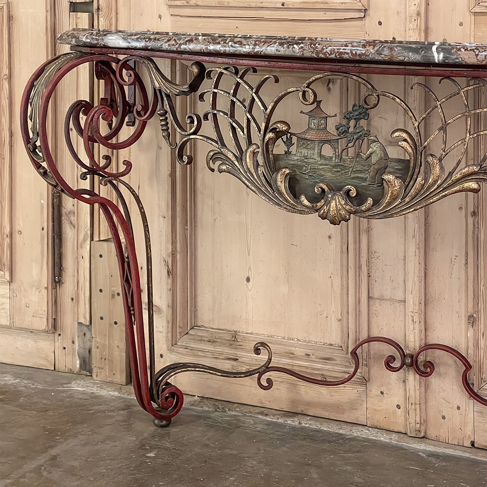 19th Century French Louis XIV Chinoiserie Wrought Iron & Marble Console is a marvel of the furniture maker's art! The bold scrollwork of the design immediately captivates one's attentions upon entering the room, then the subtle coloration of the brick red contrasting with the bronze accent tones become apparent. The luxuriously veined marble top has been contoured and beveled to follow the complex contours of the iron below. The iron has been exquisitely enhanced with complementary coloration for added visual appeal. But the coup de grace is the center of the work, depicting a chinoiserie scene of a gardener and gazebo with lush vegetation sculpted by a maestro, and also meticulously colored to complement the entire work, all rendered from solid iron. What a spectacular combination!