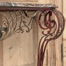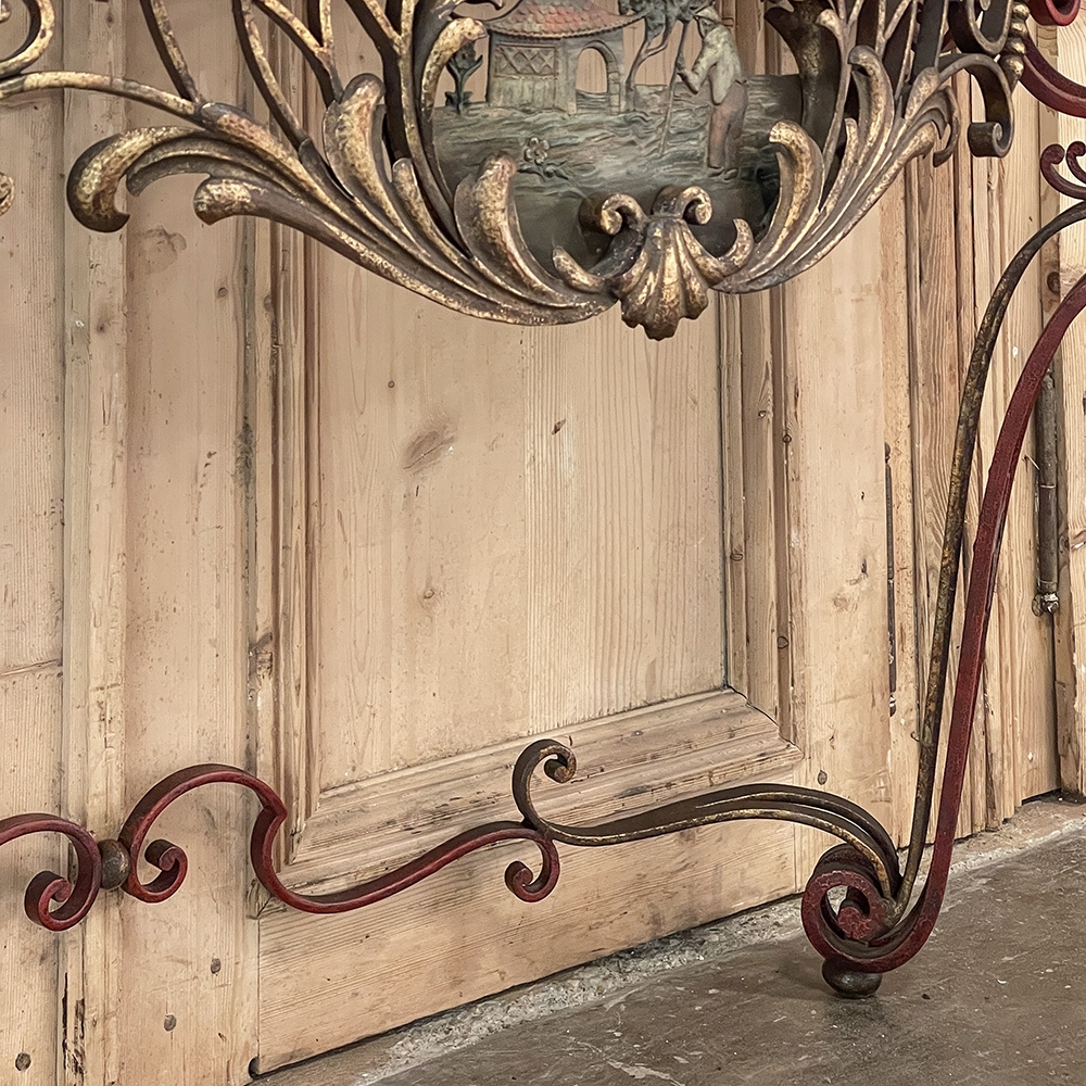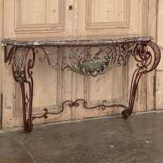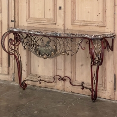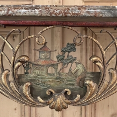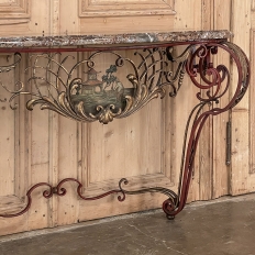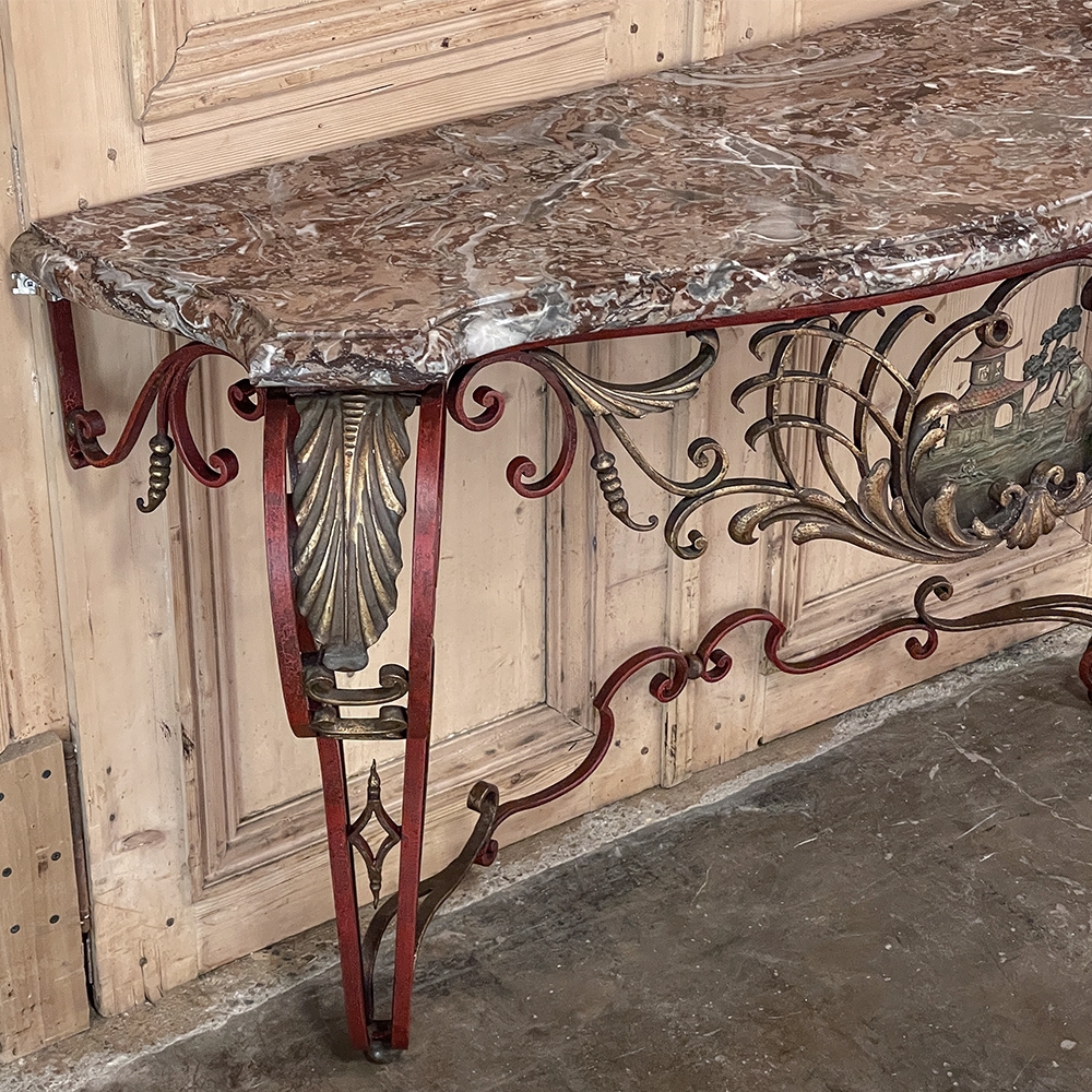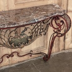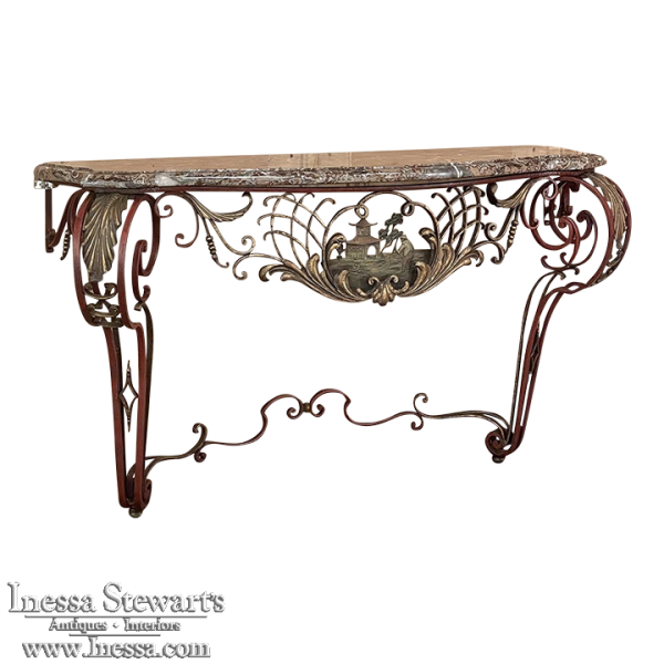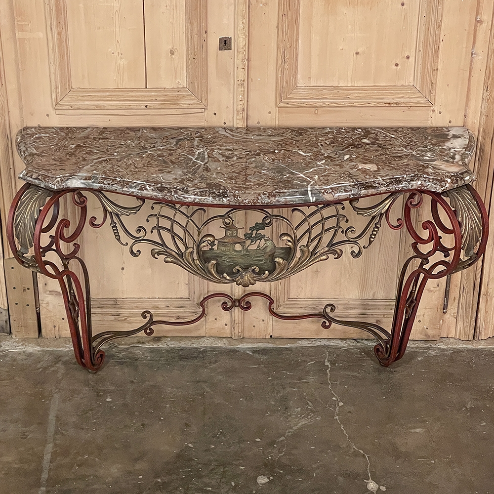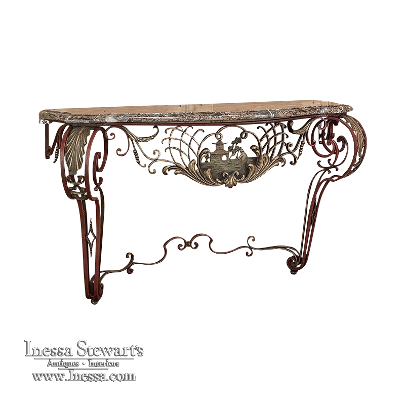 19th Century French Louis XIV Chinoiserie Wrought Iron & Marble Console is a marvel of the furniture maker's art! The bold scrollwork of the design immediately captivates one's attentions upon entering the room, then the subtle coloration of the brick red contrasting with the bronze accent tones become apparent. The luxuriously veined marble top has been contoured and beveled to follow the complex contours of the iron below. The iron has been exquisitely enhanced with complementary coloration for added visual appeal. But the coup de grace is the center of the work, depicting a chinoiserie scene of a gardener and gazebo with lush vegetation sculpted by a maestro, and also meticulously colored to complement the entire work, all rendered from solid iron. What a spectacular combination!