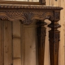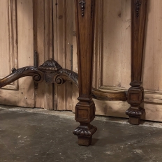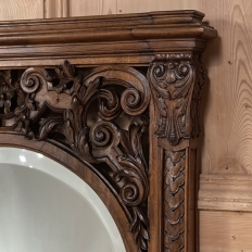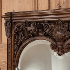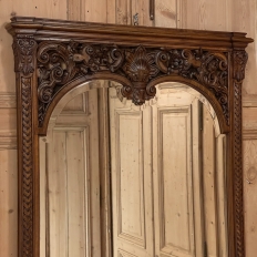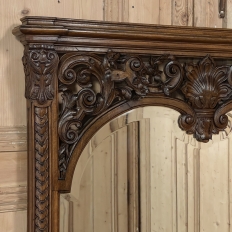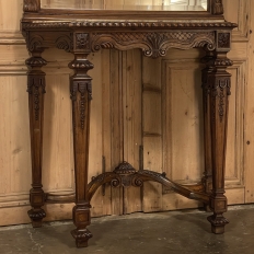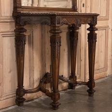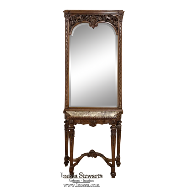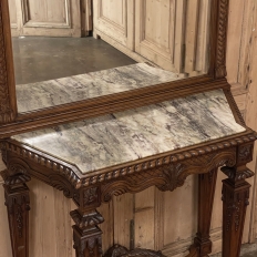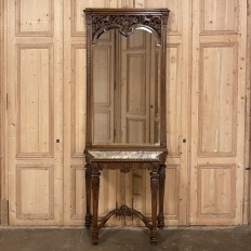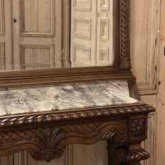 19th Century French Louis XIV Marble Top Console with Mirror is a magnificent collaboration between expert and talented artisans from three disciplines!  First, the cabinetmaker created the table and mirror frame from sumptuous, hand-select French walnut.  Second, the glazier hand-beveled the mirror to nestle into the frame behind the overlay carvings.  Third, the stone mason contoured a luxuriously veined marble top to fit in the intriguing contours of the console.  A boldly molded crown appears above, lavished with full relief sculpture of scrollwork, foliates and florals, centered with a splendid shell crest.  The crown forms a double arch over the mirror below, which has been expertly hand-beveled to follow the complex contours of the frame.  Quatrefoil overlay was carved into the frame on each side of the mirror, which all rests atop the exquisite console below.  The console features four tapered and carved legs so it can stand alone without requiring attachment to the wall.  Each leg is connected with scrolled and carved stretchers for added visual appeal as well as support.  The elegantly undulating apron above is adorned with cross hatching, shell and rosette motifs just above, a gadrooned edge completely surrounds the luxuriously veined marble top custom cut into the trapezoidal form.  Truly a timeless work of the furniture crafter's art!