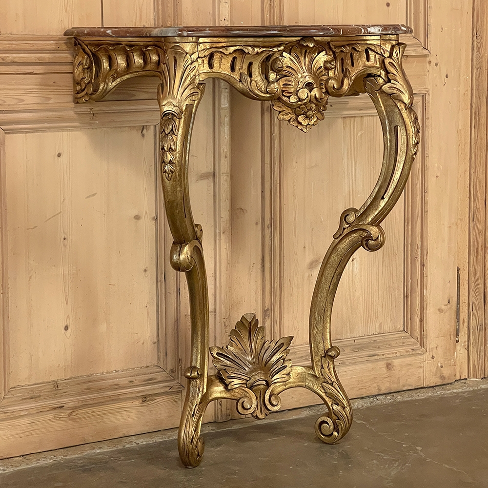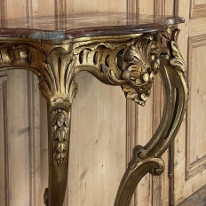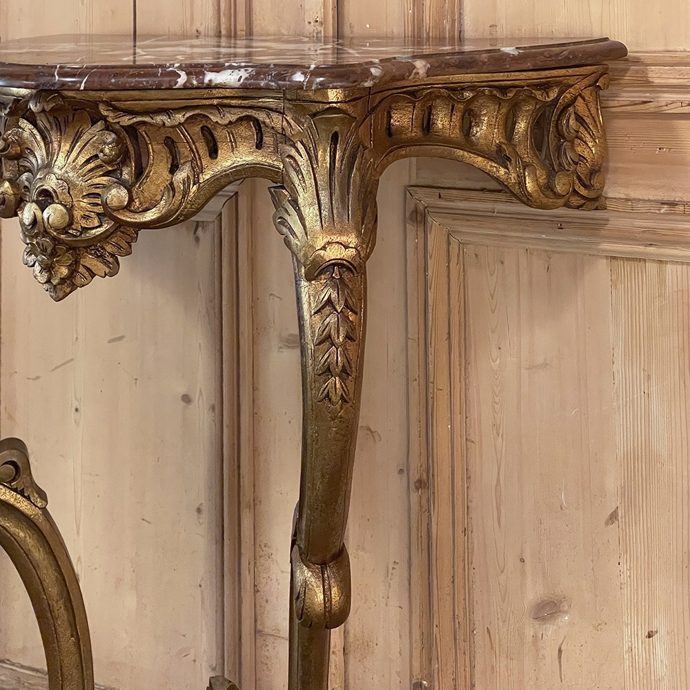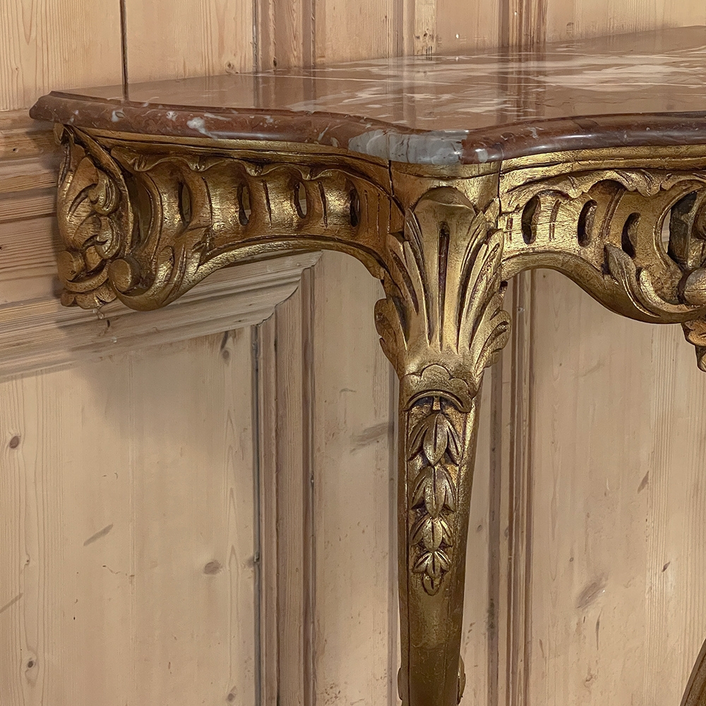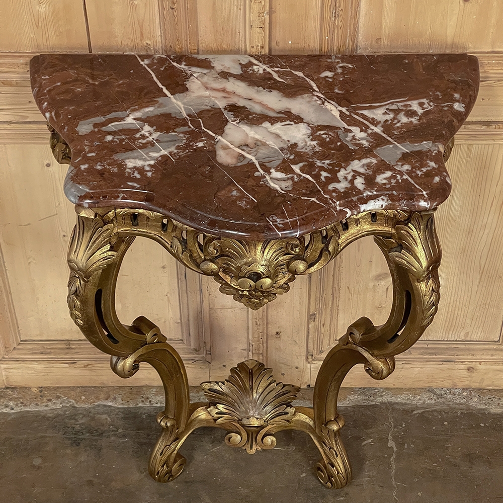 19th Century French Louis XV Giltwood Marble Top Console is an amazing rendition of the style that glorifies the beauty of nature, emphasizing shell floral and foliate forms to an amazing degree of artistry! The bowfront framework connects to the pair of double-scrolled legs then to the serpentine curves of the side aprons, with all three aprons exquisitely carved with stylized shell motif, centered with a Florentine fleur de lys adaptation above wildflowers suspended below with a cresting wave effect appearing just underneath the beautifully contoured and beveled rouge marble top. Complementary carvings on the legs lead the eye down to the lower scrolled feet, each adorned with upturned acanthus plumes, with both legs connected with scrolls that meet in the center underneath another variation on the Florentine fleur de lys. The gold finish has achieved a stunning patina over the decades, providing a rich opulent look that will create a visual feast in any room!