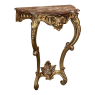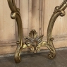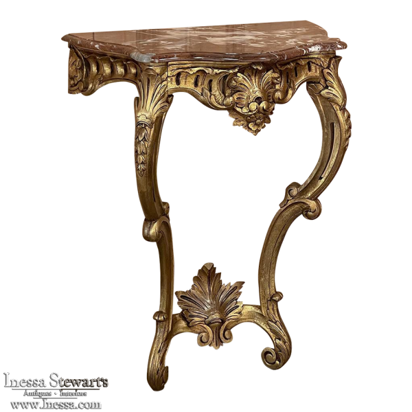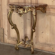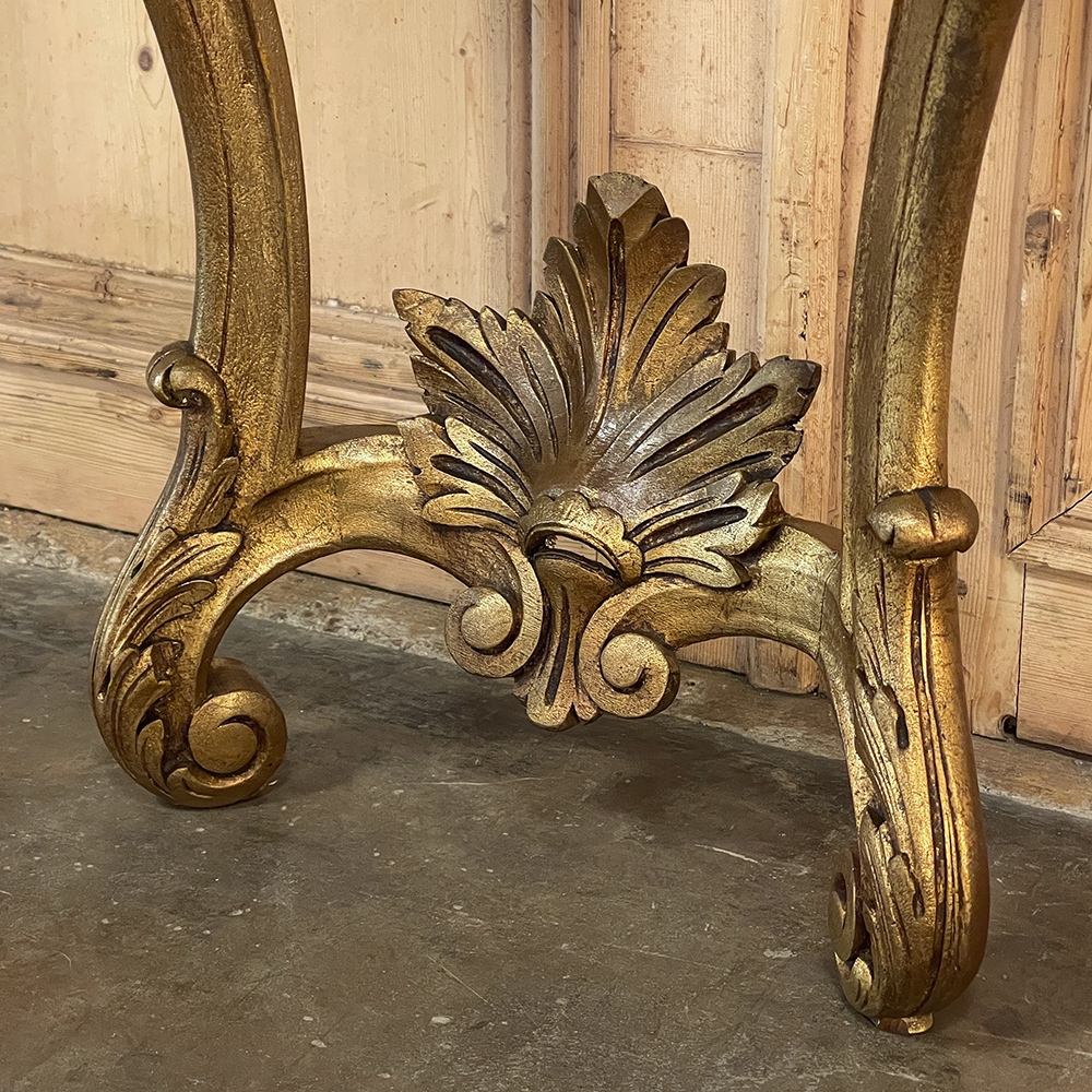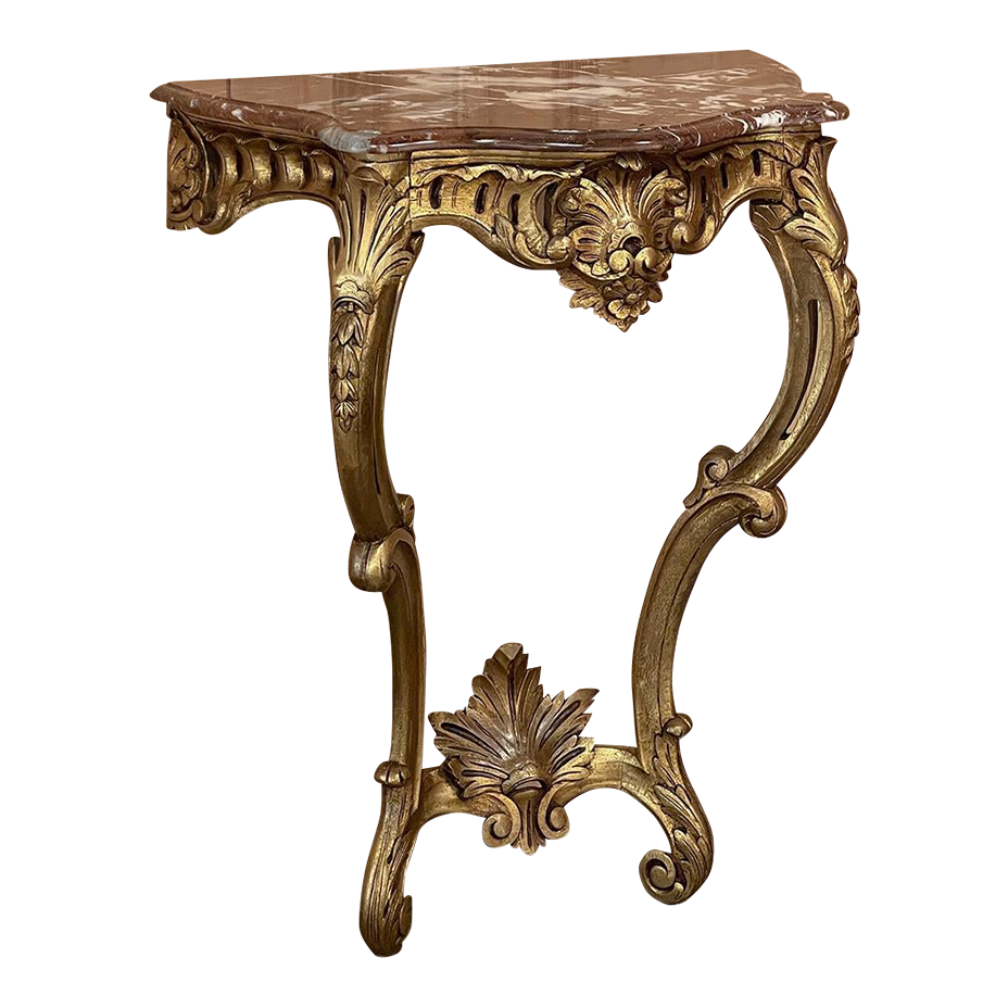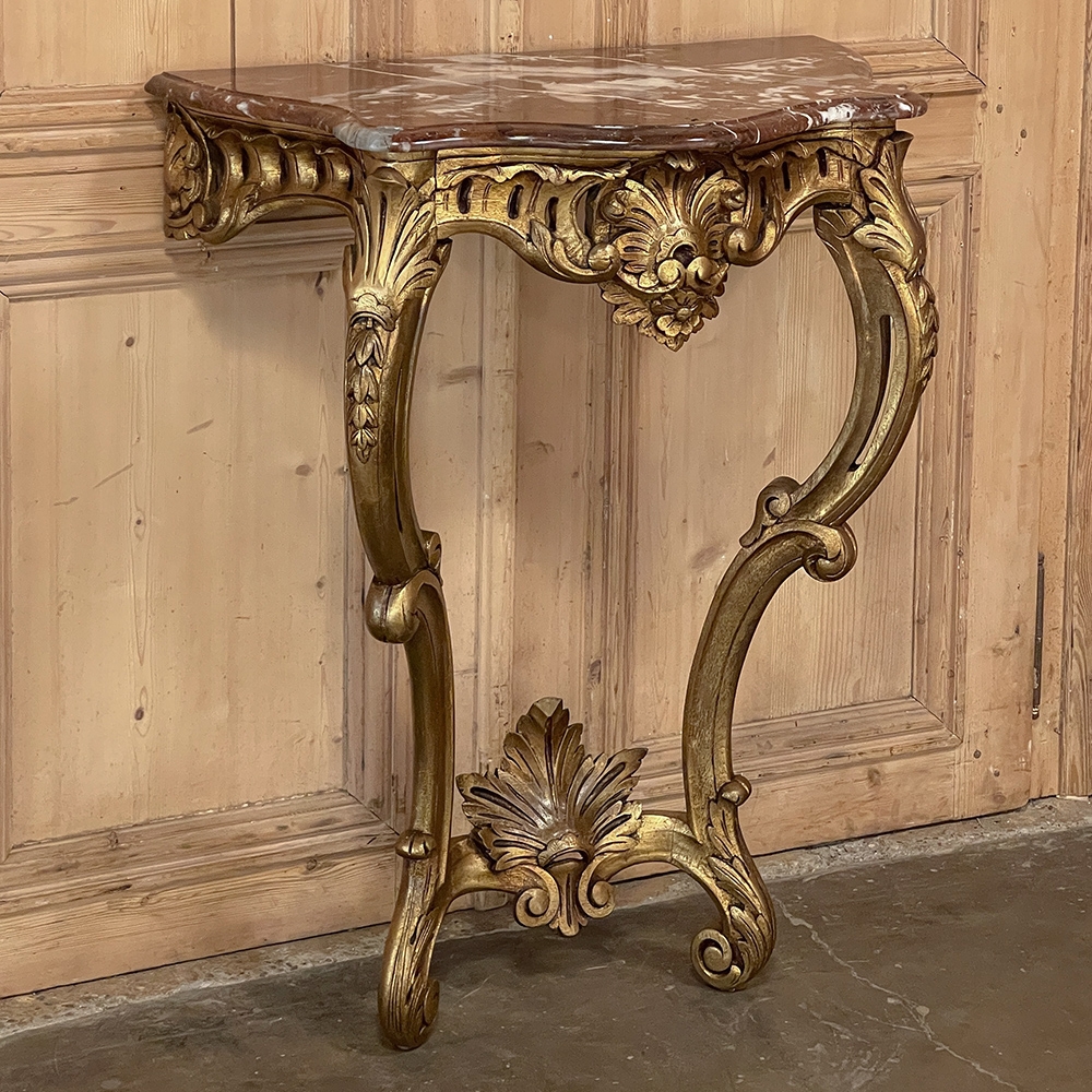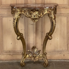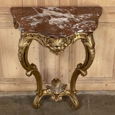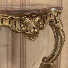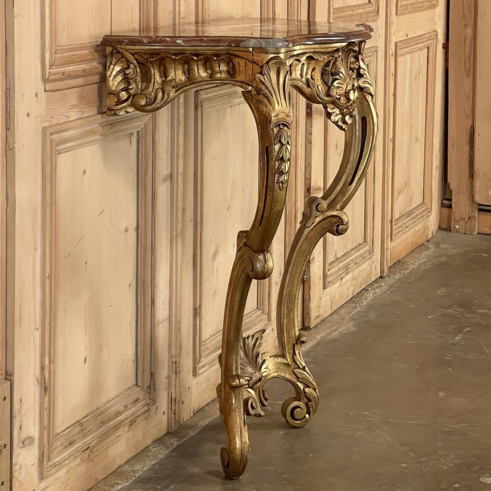 19th Century French Louis XV Giltwood Marble Top Console is an amazing rendition of the style that glorifies the beauty of nature, emphasizing shell floral and foliate forms to an amazing degree of artistry! The bowfront framework connects to the pair of double-scrolled legs then to the serpentine curves of the side aprons, with all three aprons exquisitely carved with stylized shell motif, centered with a Florentine fleur de lys adaptation above wildflowers suspended below with a cresting wave effect appearing just underneath the beautifully contoured and beveled rouge marble top. Complementary carvings on the legs lead the eye down to the lower scrolled feet, each adorned with upturned acanthus plumes, with both legs connected with scrolls that meet in the center underneath another variation on the Florentine fleur de lys. The gold finish has achieved a stunning patina over the decades, providing a rich opulent look that will create a visual feast in any room!