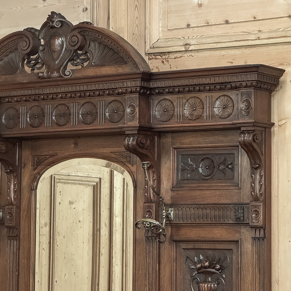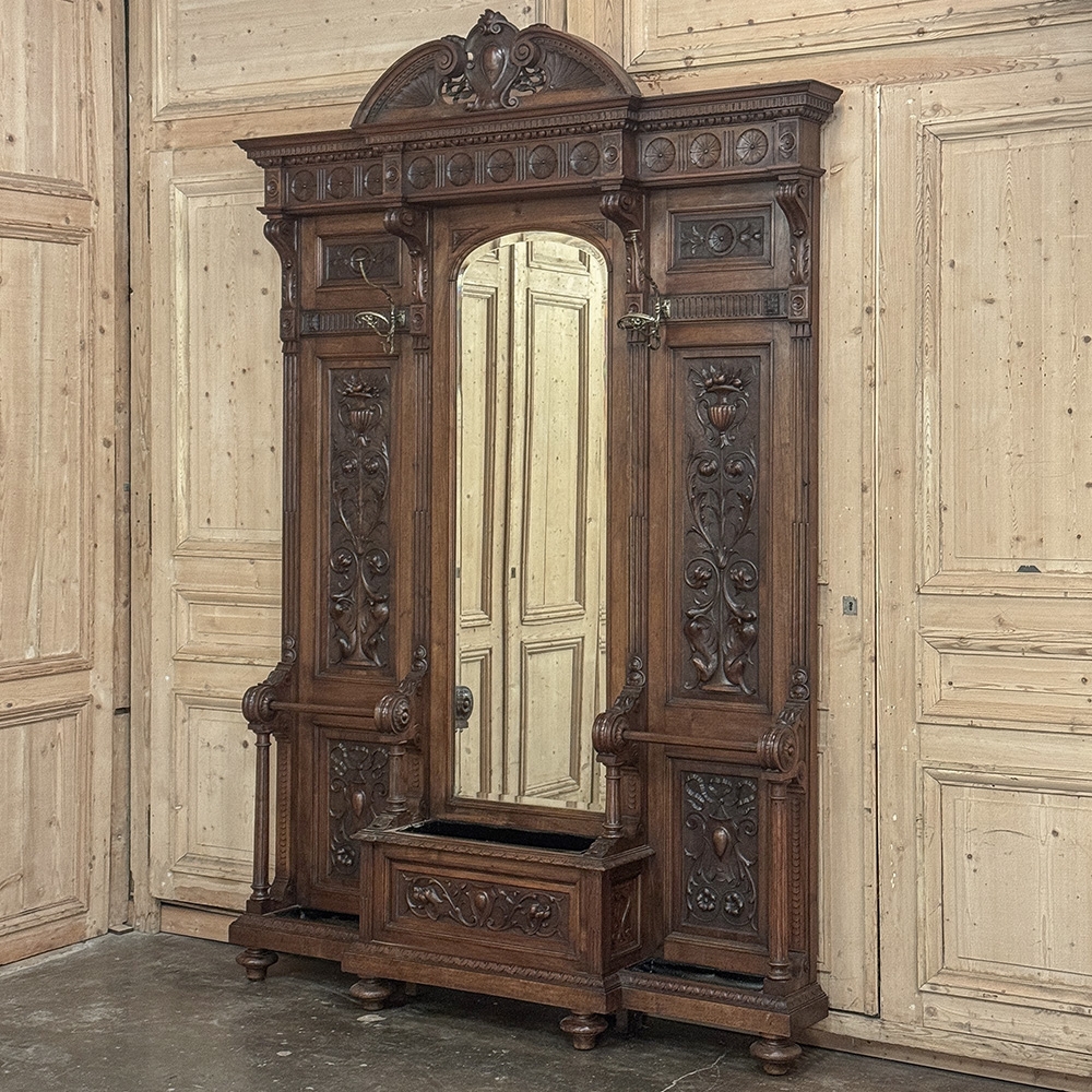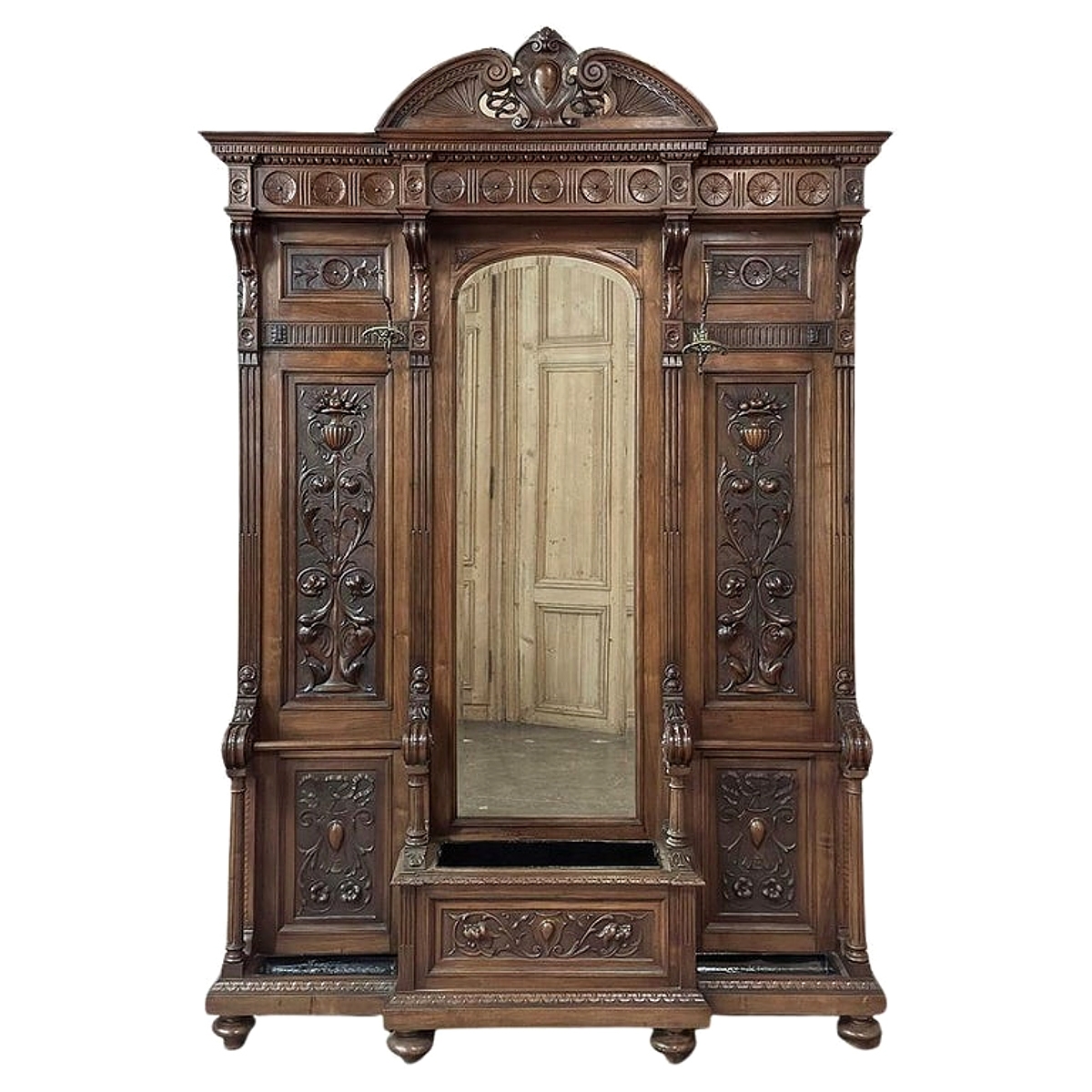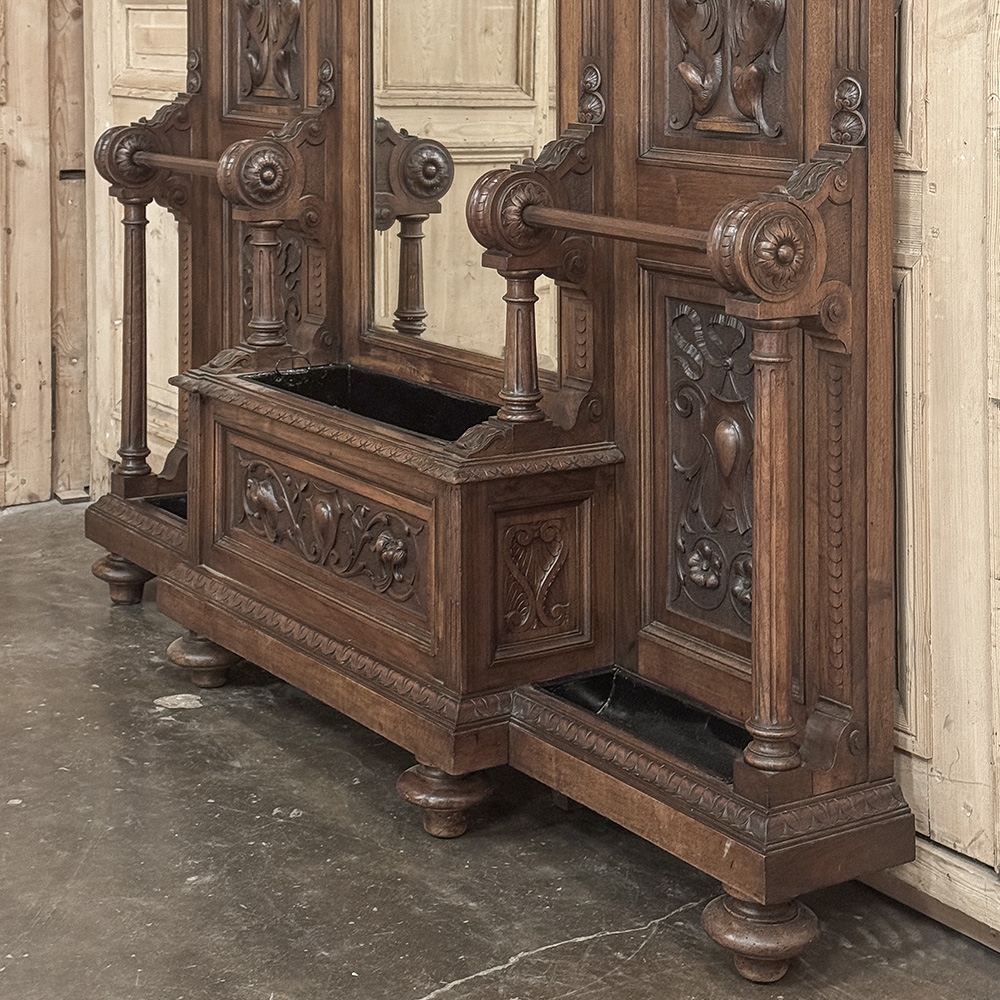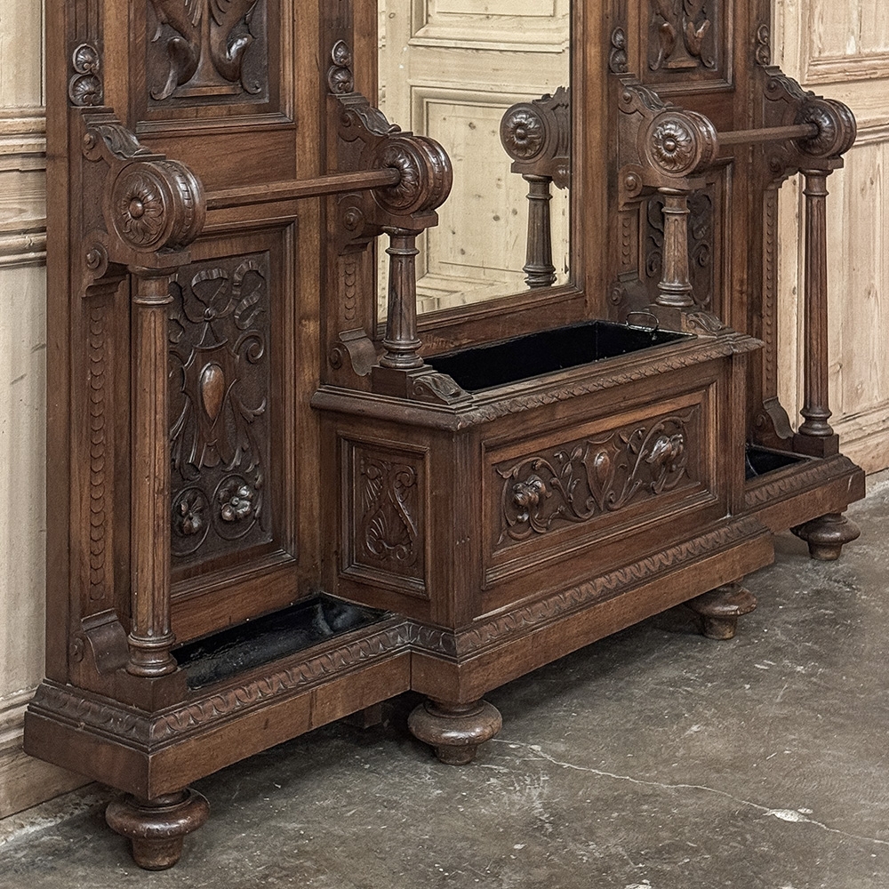 19th Century Grand Italian Hand-Carved Walnut Hall Tree is a glorious representation of the revival of the Renaissance style that occurred during the waning years of the 1800s. Crafted from richly hued Italian walnut, it features a rectilinear, almost classical architecture including bold molding details from crown to bun feet, but in between are works of the sculptor's art in abundance! The heraldic crest at the top, centered between arches, commands one's attention, presiding over a crown adorned with large rosettes, with carved corbels underneath helping to define two amazing full relief panels depicting stylized Romanesque urns with florals, foliates and dolphins. In between the panels is a full height beveled mirror over a little jardiniere. Umbrella or walking cane racks flank the jardiniere, with their adornment consisting of yet another three panels with more shield crests, a lion's head and scrolled foliates. Finely detailed brass hangers complete the look. Amazing detail!