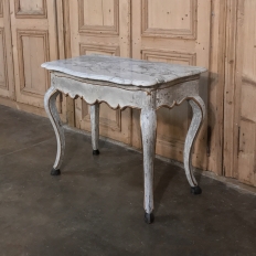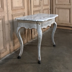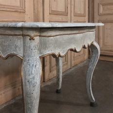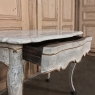19th Century Swedish Painted Marble Top Console is a study in rustic charm melded with hand-crafted traditional methods and styling to create a lasting heirloom for your family! Pastel tones of the slightly distressed painted finish are perfect for the casual decor, and the honed, contoured and beveled Cararra marble top makes for a neutral, carefree surface. In a clever move, the stone is cut to overhang the back as well, so the console can sit against the shoe molding & baseboard while the marble still contacts the wall. Four legs mean the console does not have to be mounted on the wall, so it can be relocated or repositioned with ease. A full width drawer is cleverly designed into the facade which is undetectable when closed. Gold highlights along the molding trip completes the look.