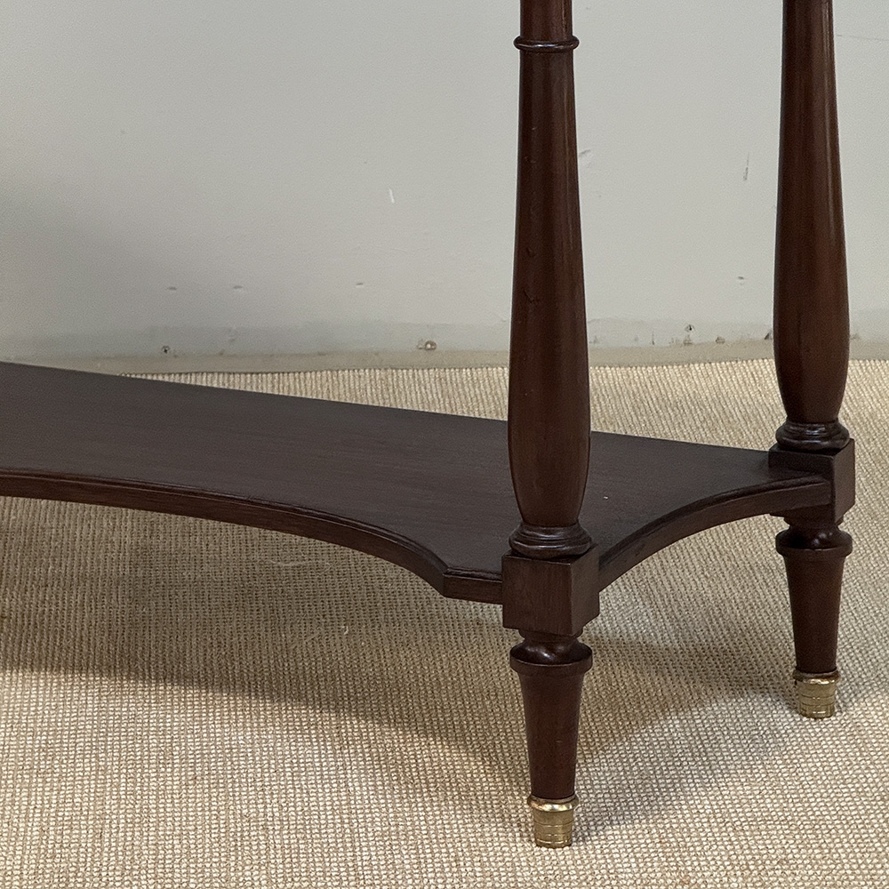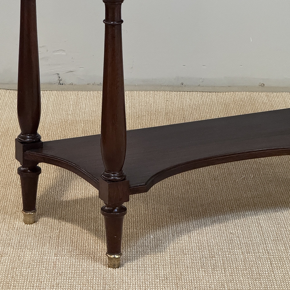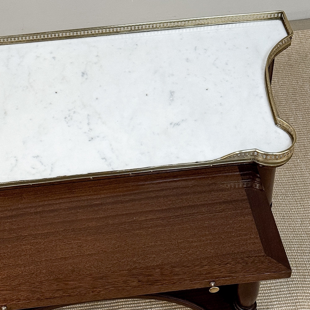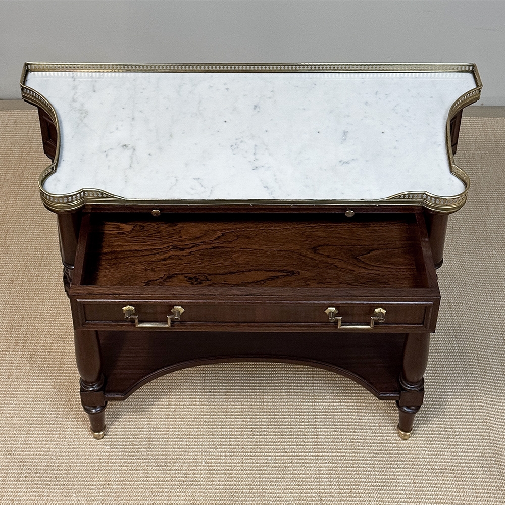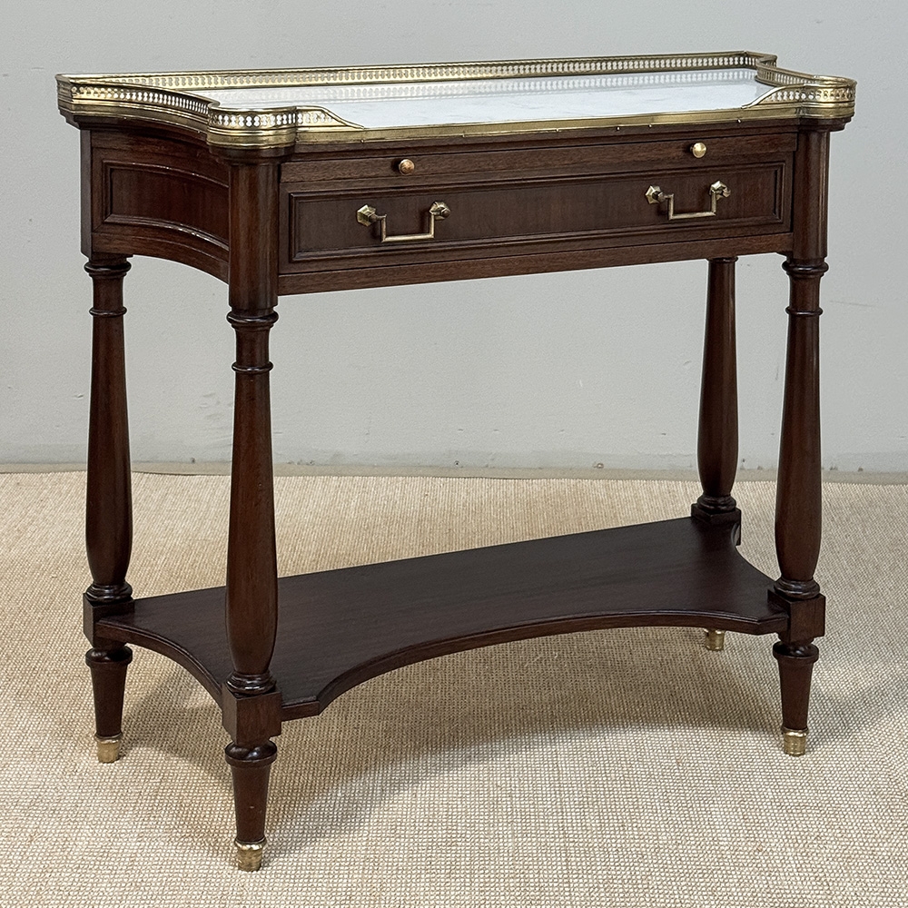Antique French Directoire Mahogany Console with Carrara Marble Top expresses a tailored elegance that cannot be denied! Crafted from solid mahogany, it features a shallow design with concave sides making it a very traffic-friendly addition to any room. The luxurious Carrara marble surface is surrounded by a pierced brass gallery rail to keep things in place, and it sports a full width drawer with an intriguing full width extra pull-out surface, both accessed with brass hardware. Brass foot tips were also applied to the four tapered legs which incidentally means this piece does not have to be attached to the wall like most consoles, and can even be used behind a sofa or large armchair. Legs are finely turned for a simplistic opulence. A lower display shelf with concave edges all around completes the look.