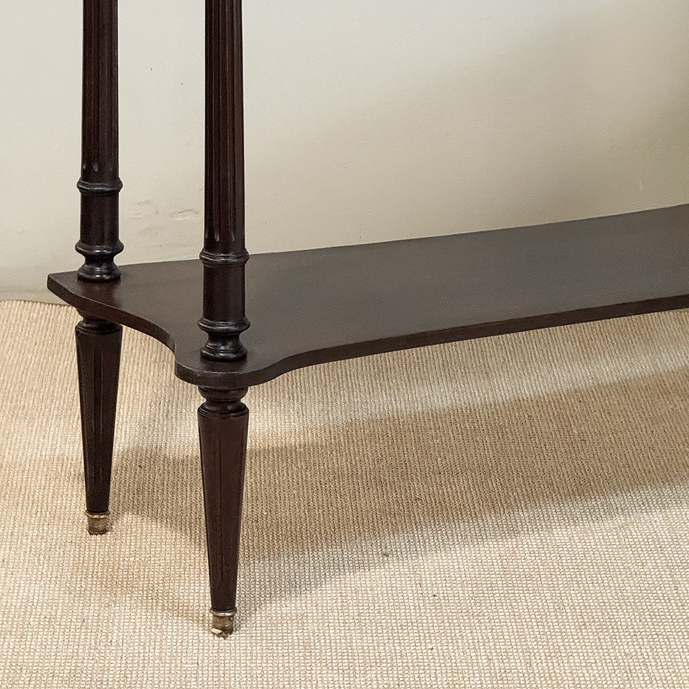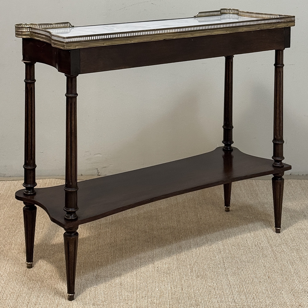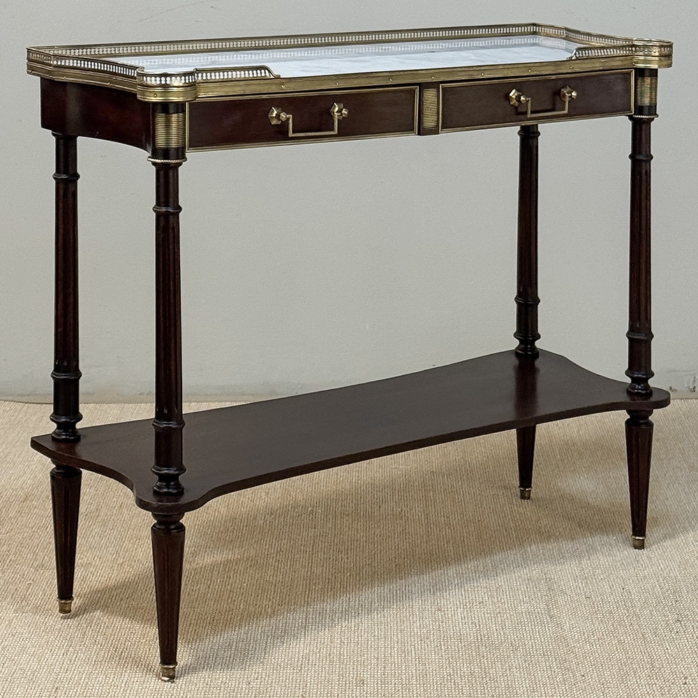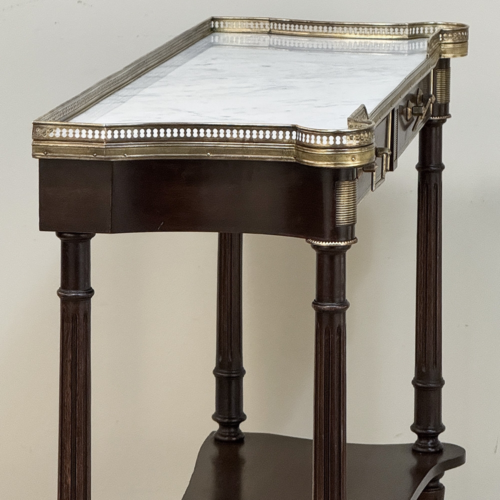 Antique French Directoire Mahogany Console with Carrara Marble Top expresses a tailored elegance that cannot be denied! Crafted from solid mahogany, it features a shallow design with concave sides making it a very traffic-friendly addition to any room. The luxurious Carrara marble surface is surrounded by a pierced brass gallery rail to keep things in place, and it sports a pair of drawers accessed with brass bale pulls. Brass jalouses frame the drawers. Brass foot tips were also applied to the four tapered legs which incidentally means this piece does not have to be attached to the wall like most consoles, and can even be used behind a sofa or large armchair. Legs are finely turned and fluted for neoclassic opulence. A lower display shelf with contoured edges all around completes the look.