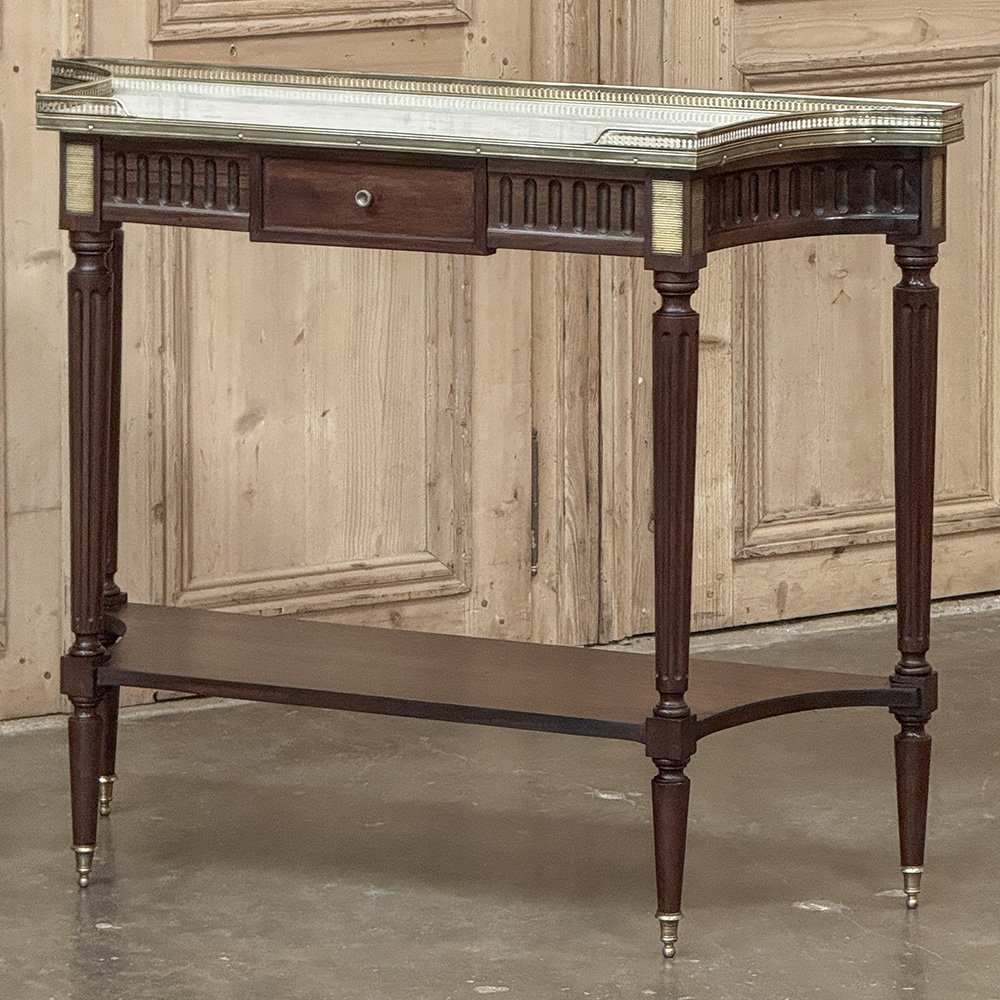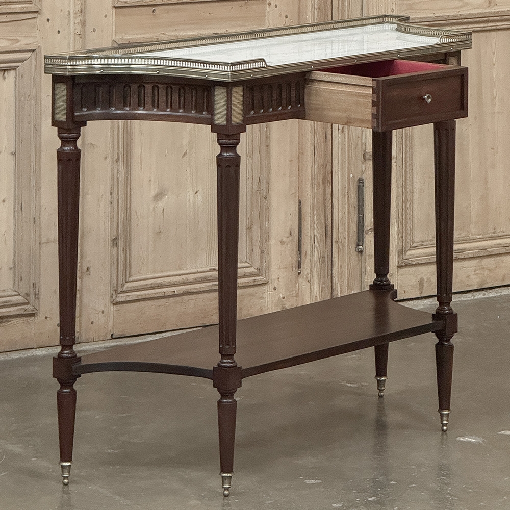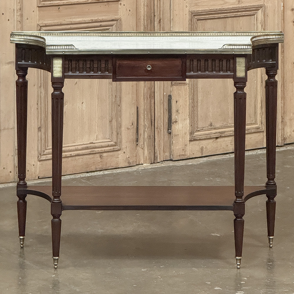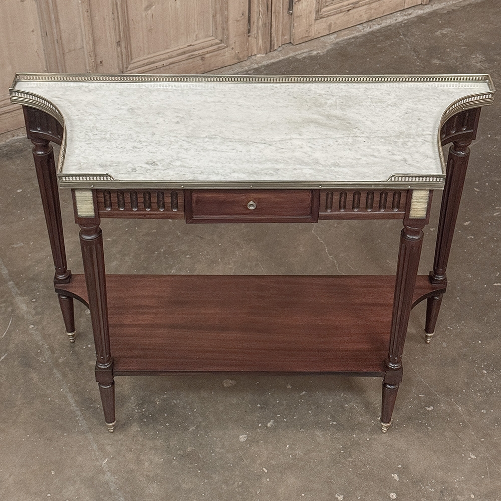 Antique French Directoire Neoclassical Mahogany Console with Carrara Marble is ideal for the efficient floorplan, or for adding a nice finishing touch to any room, including hallways, stairwell landings and entryways. Only 14 inches deep, its concave sides make it very traffic friendly, while the luxurious marble top makes an excellent surface for small decorative displays or photos. A shelf above the floor adds display surface. Four tapered legs tipped with brass feet support the shelf and casework above, which features a drawer fitted with a brass knob and lined in velvet. The brass jalouse panels atop the legs add a nice accent touch, a pierced brass gallery rail around the entire marble top.
