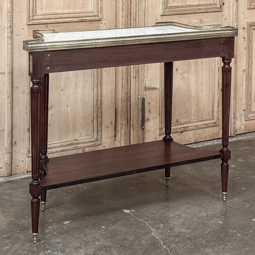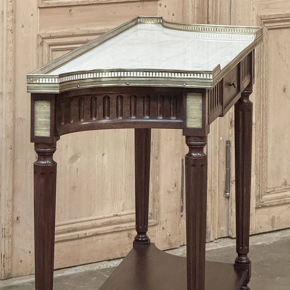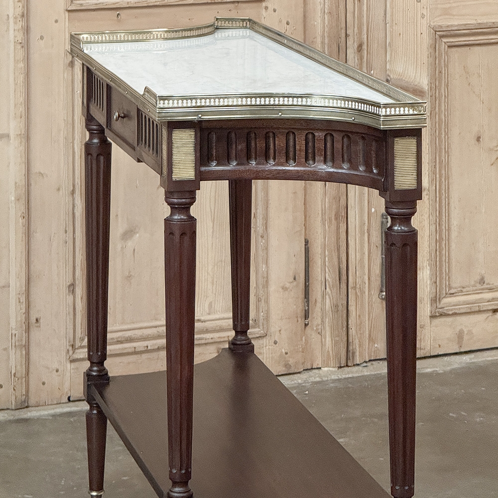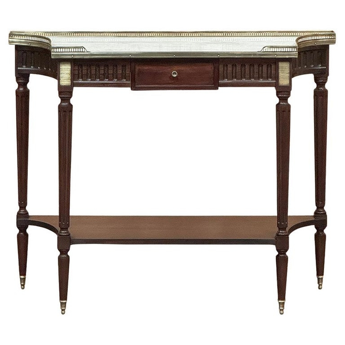 Antique French Directoire Neoclassical Mahogany Console with Carrara Marble is ideal for the efficient floorplan, or for adding a nice finishing touch to any room, including hallways, stairwell landings and entryways. Only 14 inches deep, its concave sides make it very traffic friendly, while the luxurious marble top makes an excellent surface for small decorative displays or photos. A shelf above the floor adds display surface. Four tapered legs tipped with brass feet support the shelf and casework above, which features a drawer fitted with a brass knob and lined in velvet. The brass jalouse panels atop the legs add a nice accent touch, a pierced brass gallery rail around the entire marble top.
